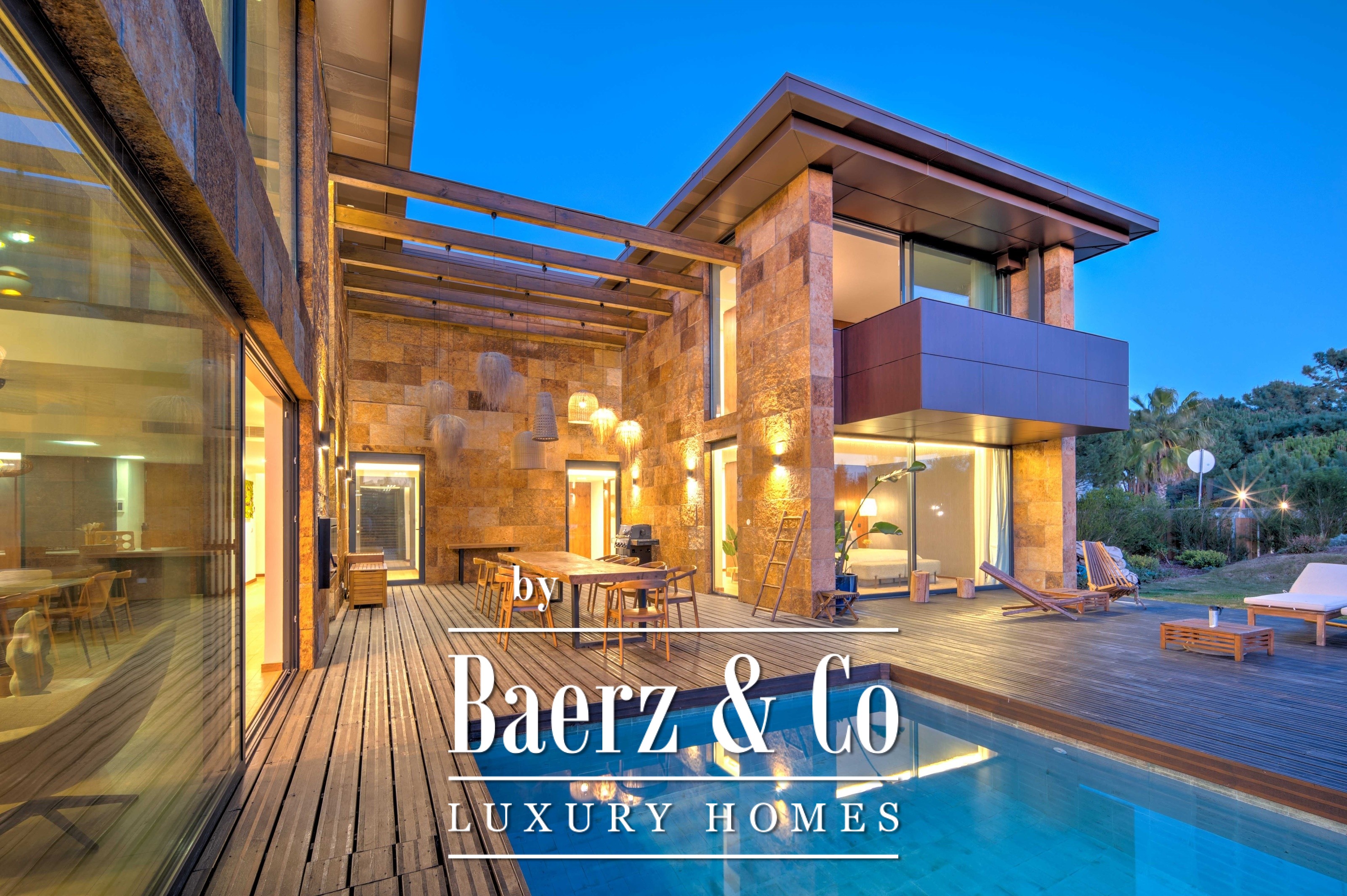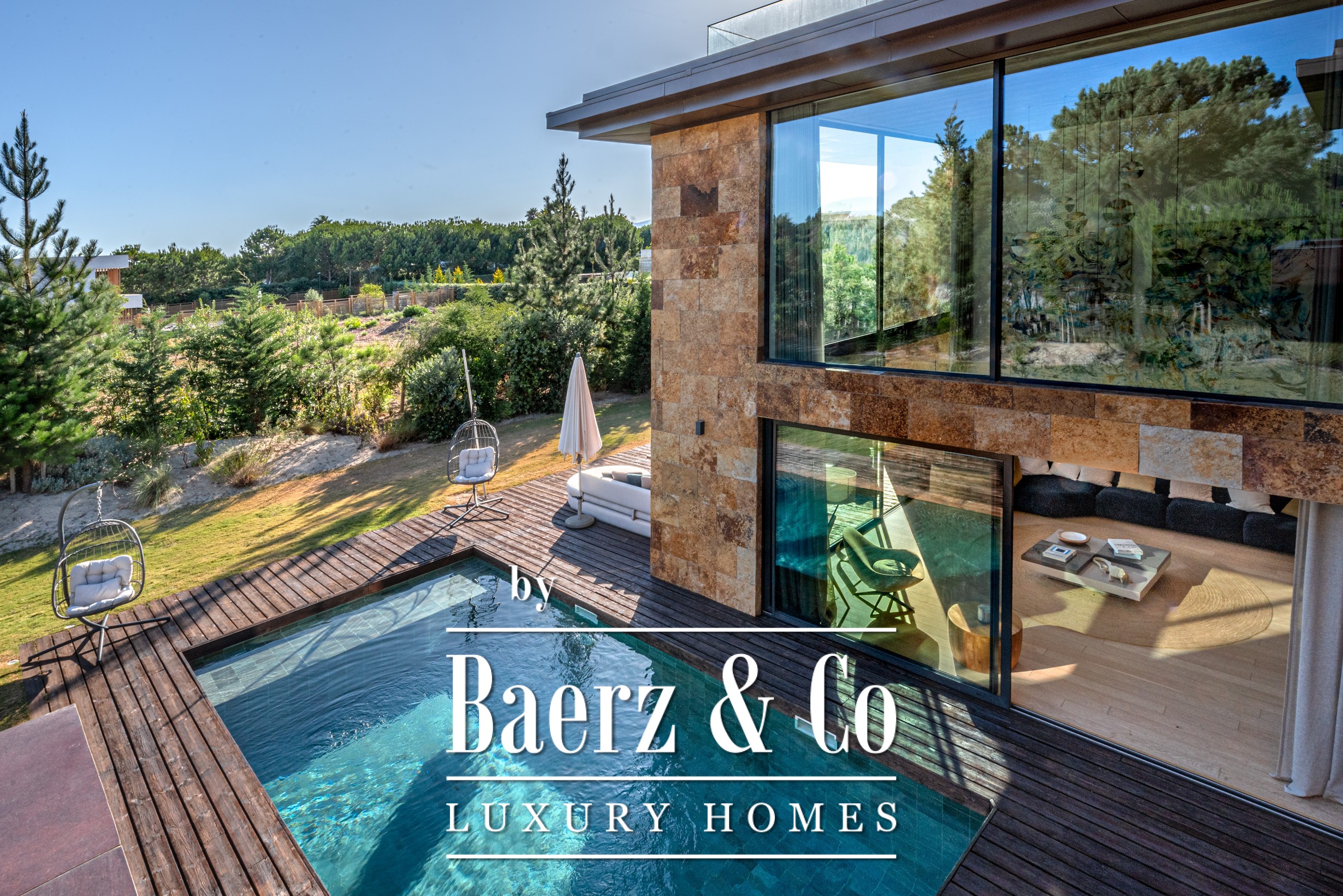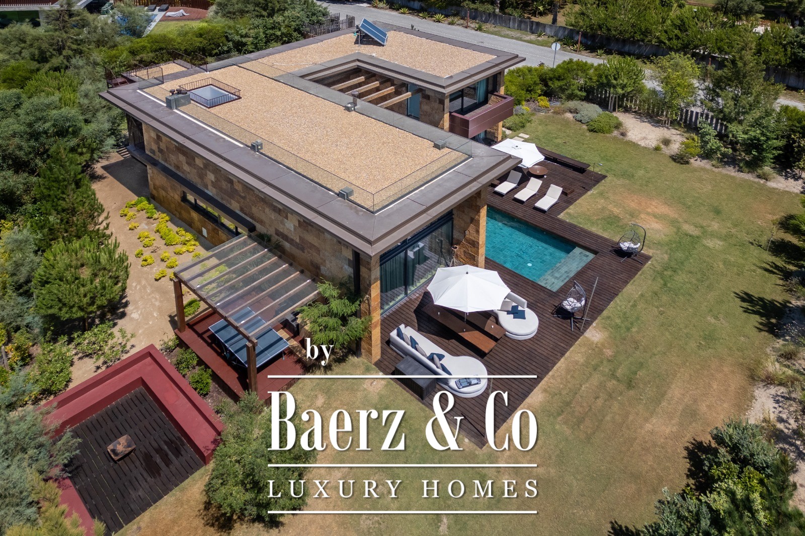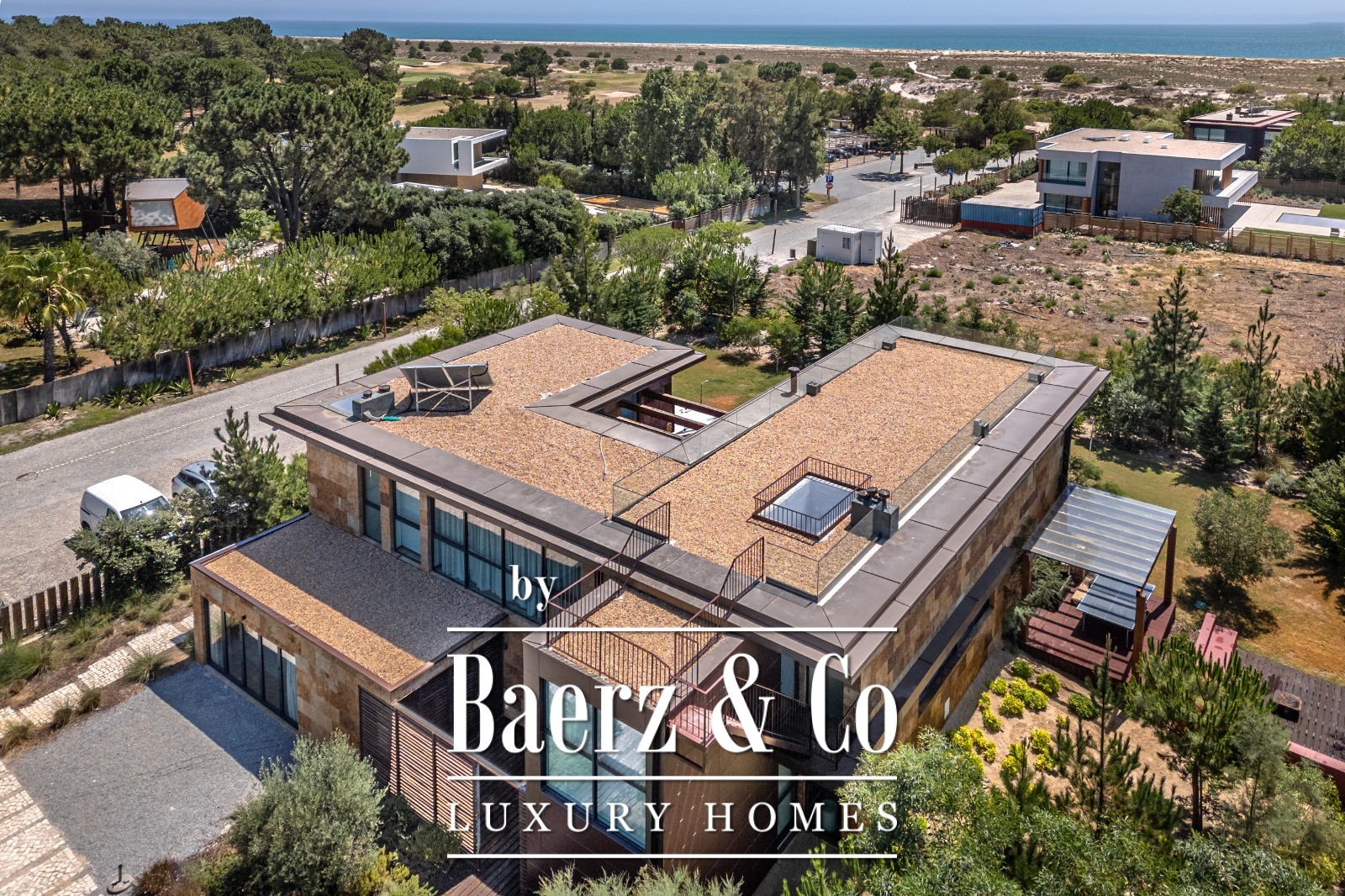Located in exclusive Tróia Atlantic Villas near Comporta, this stunning modern villa sits moments from the Atlantic Ocean with pristine beaches just a 5-minute walk away. Only 90 minutes from Lisbon, it perfectly balances coastal tranquility with urban accessibility.The striking design features sand-coloured bricks, rich wood, and expansive glass seamlessly connecting indoors and outdoors. Floor-to-ceiling windows flood the space with natural light while showcasing sweeping garden views. An elegant wooden deck wraps around the house.Outdoor spaces shine with a sleek private pool surrounded by sun loungers, plus a handcrafted wooden dining table seating 10+ guests under warm timber beam lighting. The cozy fire pit lounge area creates intimate evening gatherings. The rooftop terrace offers breathtaking sea views—perfect for sunset drinks or stargazing.Inside, the open-plan layout maximizes natural light. The living room features velvet sofas, bold contemporary artwork, and custom lighting. The dining area includes a central island and spacious table for shared meals.Four beautifully designed suites each have king-size beds, with three
