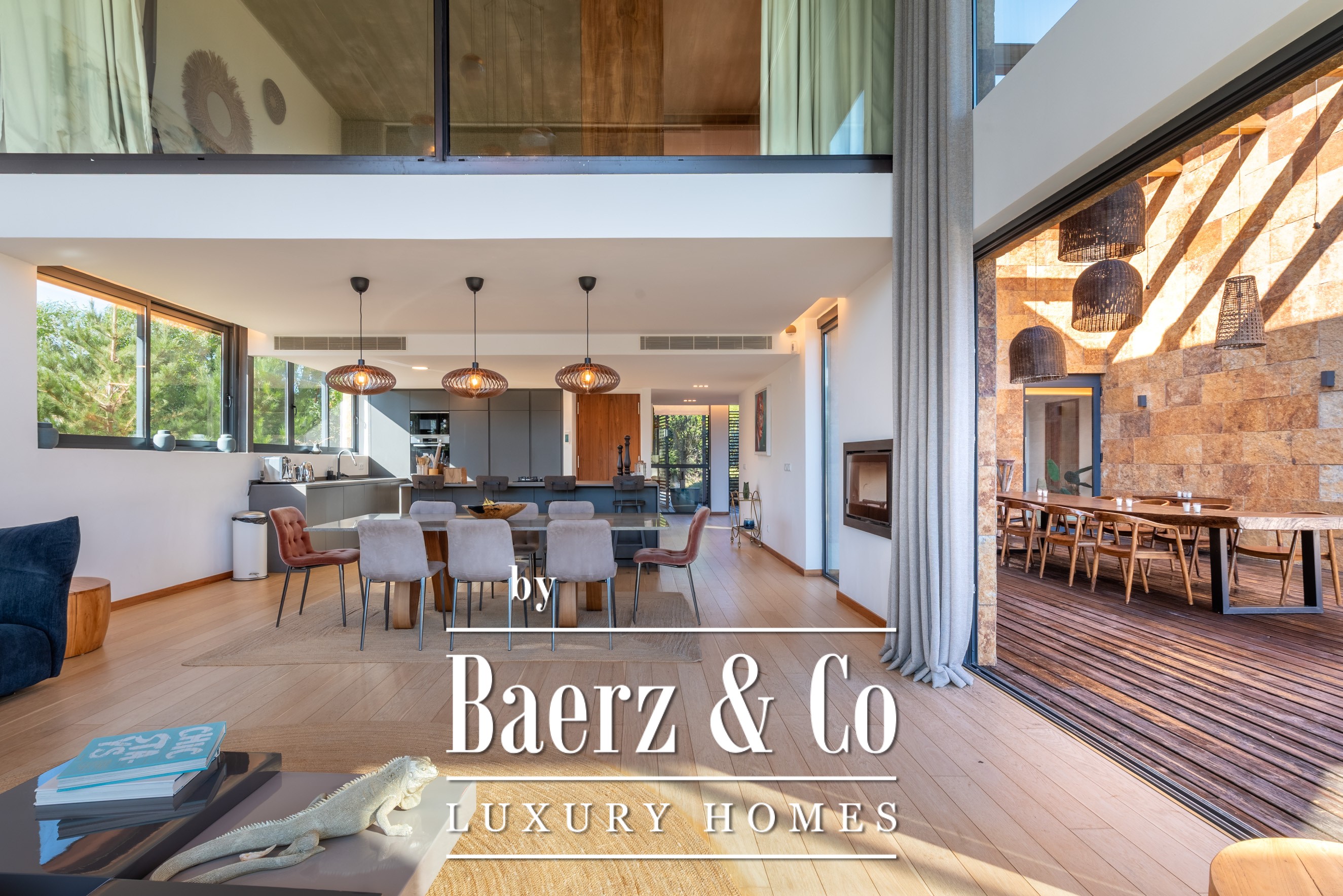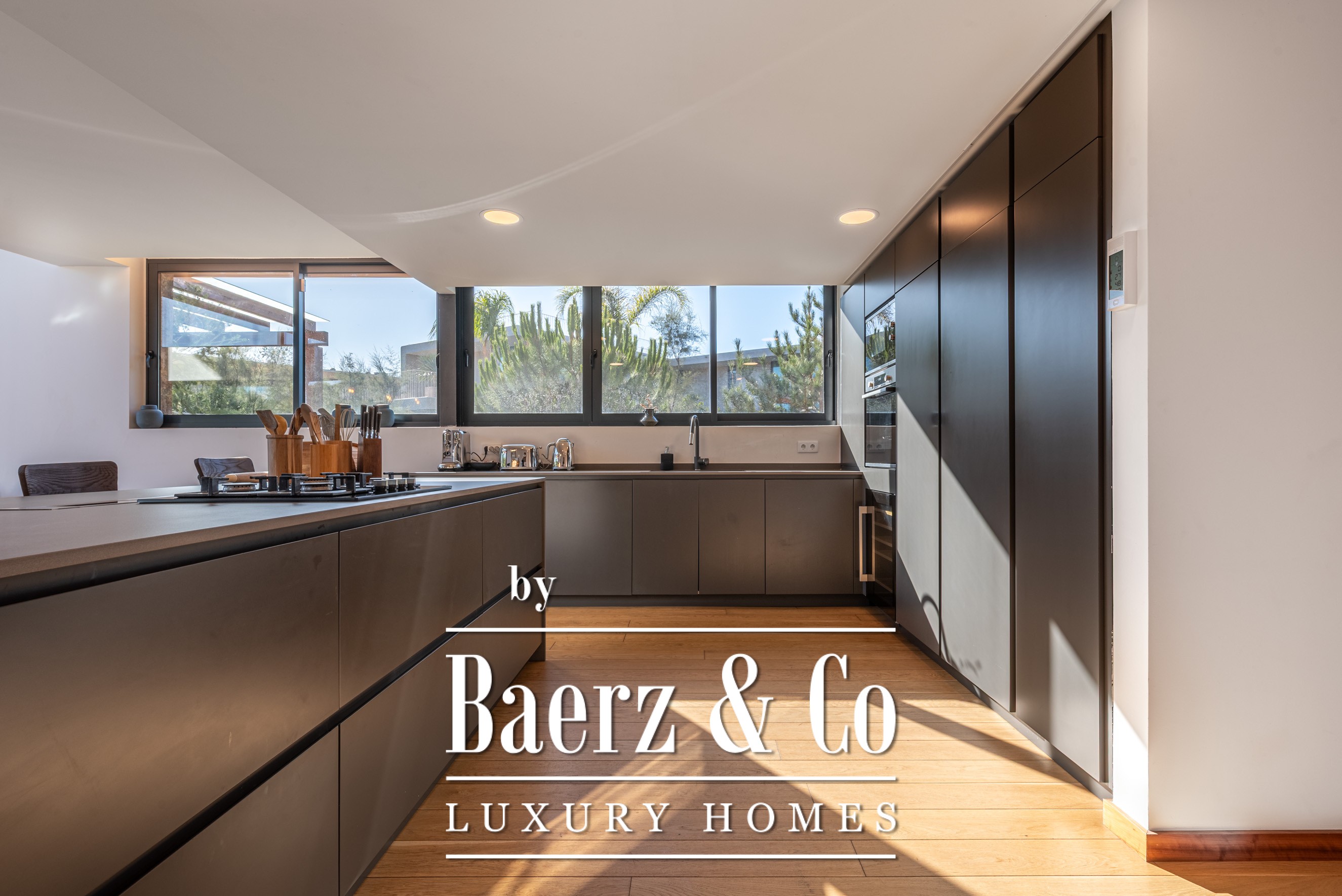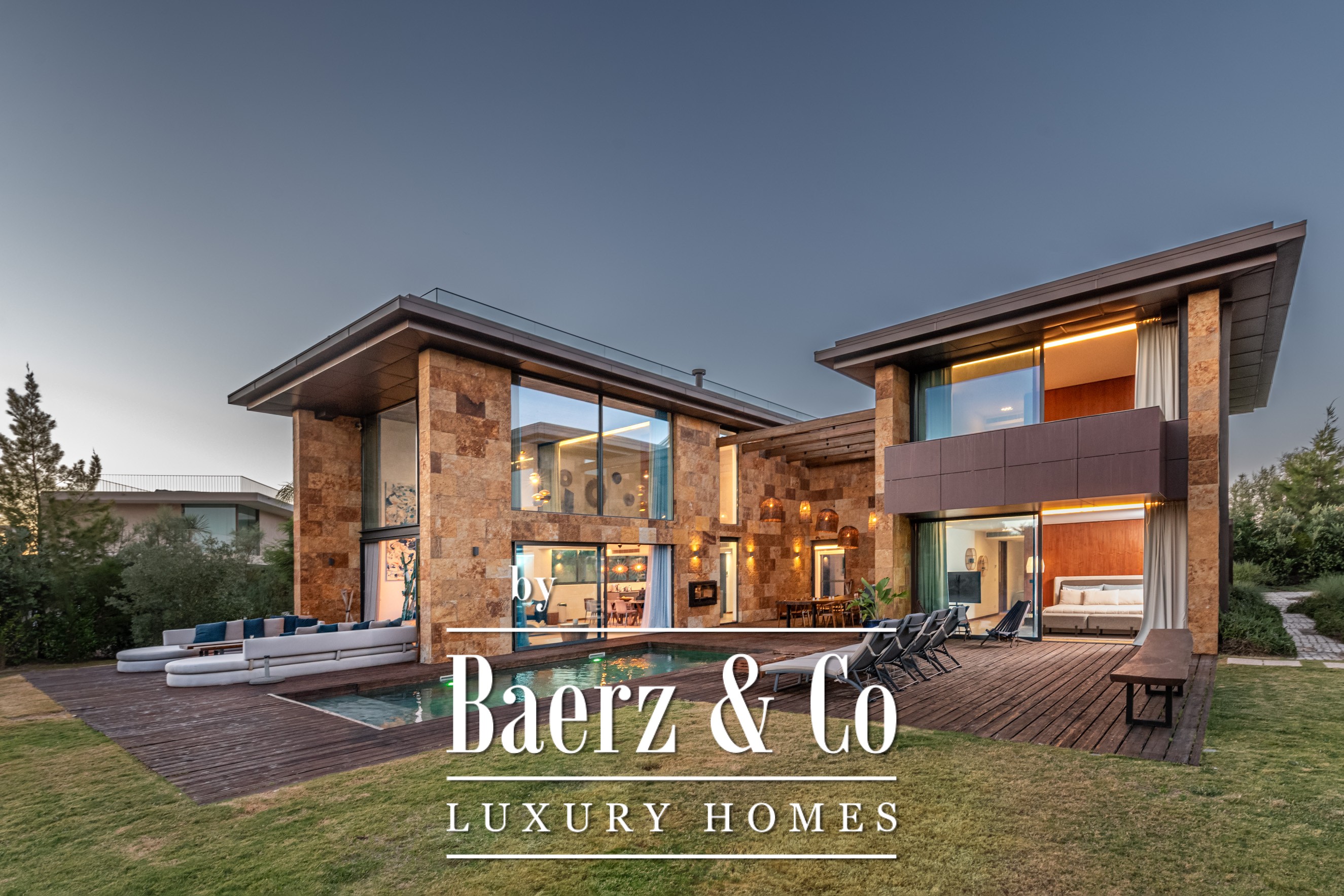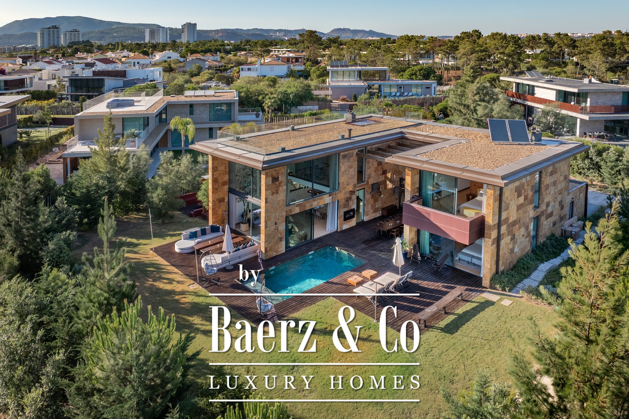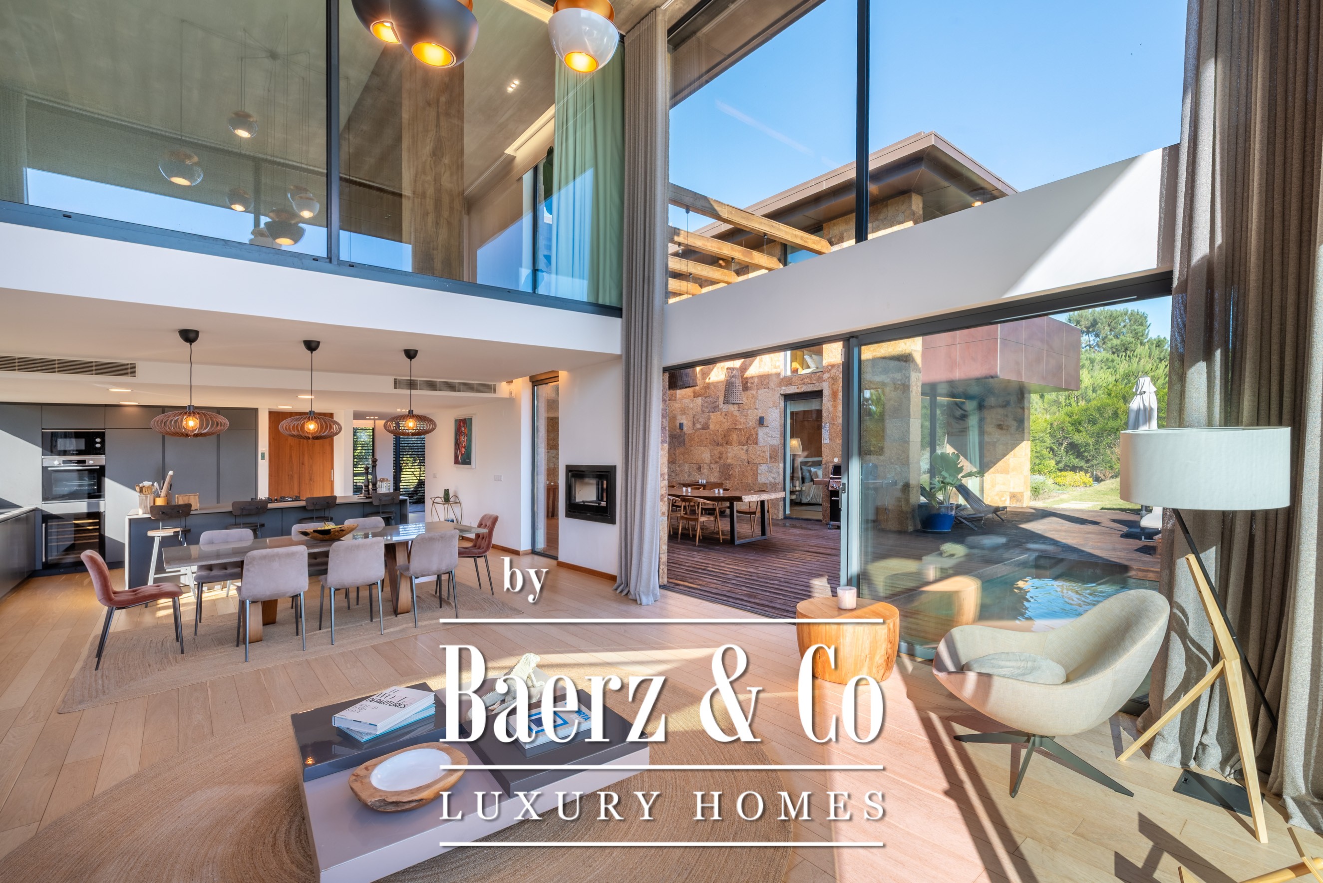 Located in exclusive Tróia Atlantic Villas near Comporta, this stunning modern villa sits moments from the Atlantic Ocean with pristine beaches just a 5-minute walk away. Only 90 minutes from Lisbon, it perfectly balances coastal tranquility with urban accessibility.The striking design features sand-coloured bricks, rich wood, and expansive glass seamlessly connecting indoors and outdoors. Floor-to-ceiling windows flood the space with natural light while showcasing sweeping garden views. An elegant wooden deck wraps around the house.Outdoor spaces shine with a sleek private pool surrounded by sun loungers, plus a handcrafted wooden dining table seating 10+ guests under warm timber beam lighting. The cozy fire pit lounge area creates intimate evening gatherings. The rooftop terrace offers breathtaking sea views—perfect for sunset drinks or stargazing.Inside, the open-plan layout maximizes natural light. The living room features velvet sofas, bold contemporary artwork, and custom lighting. The dining area includes a central island and spacious table for shared meals.Four beautifully designed suites each have king-size beds, with three