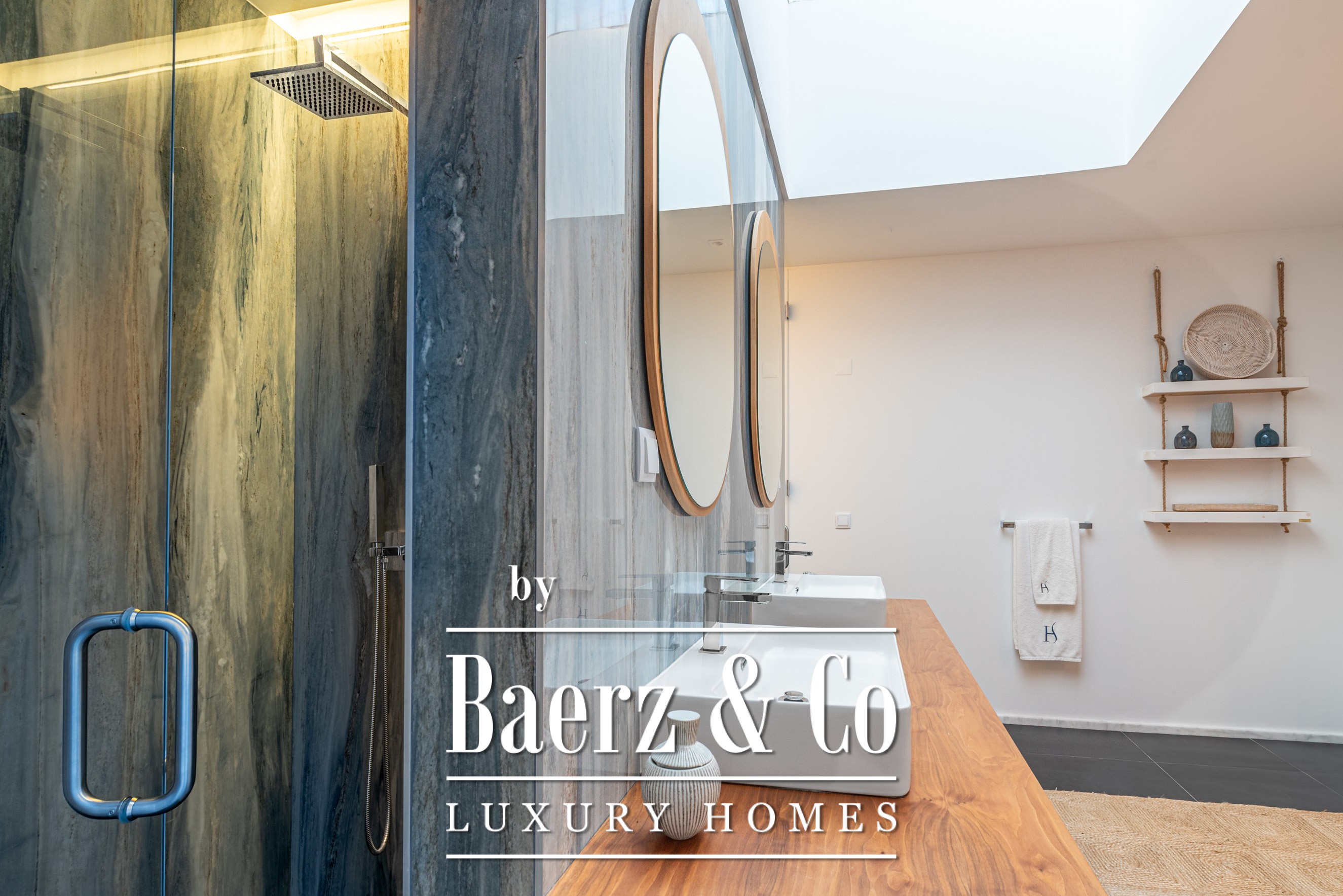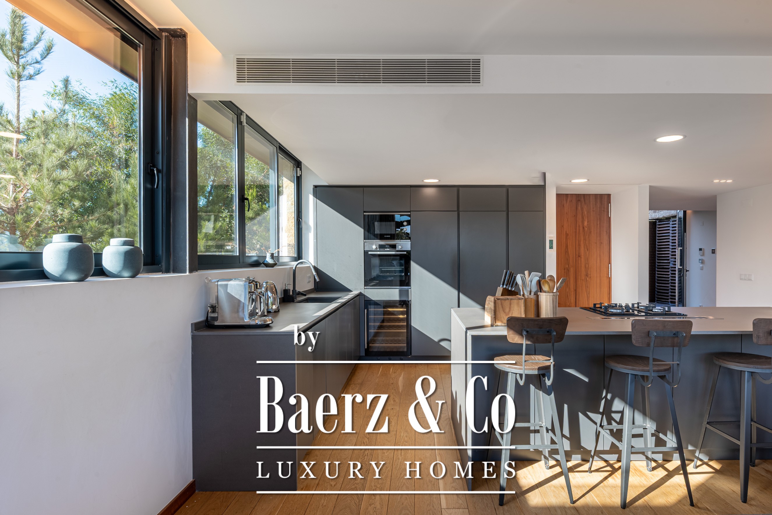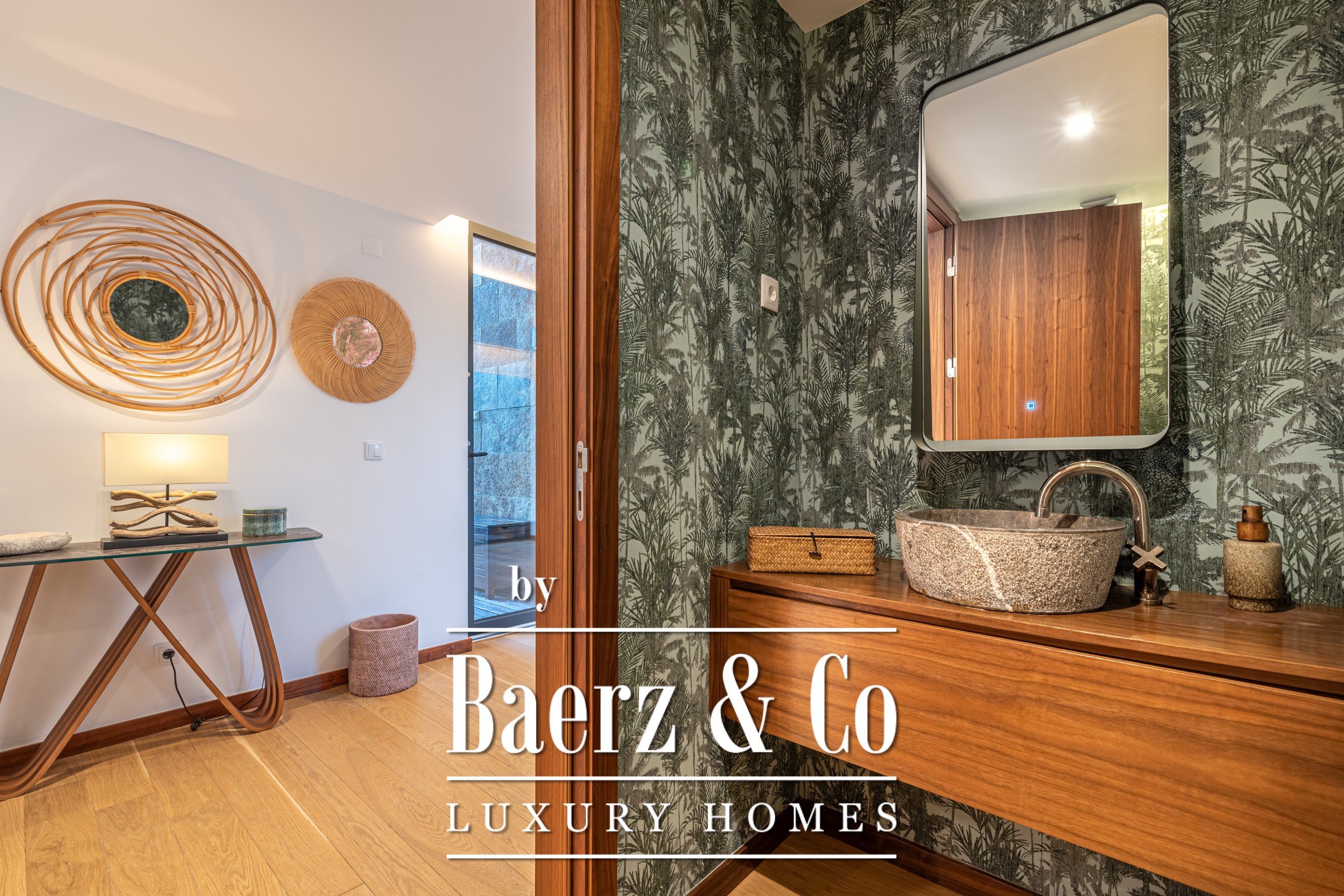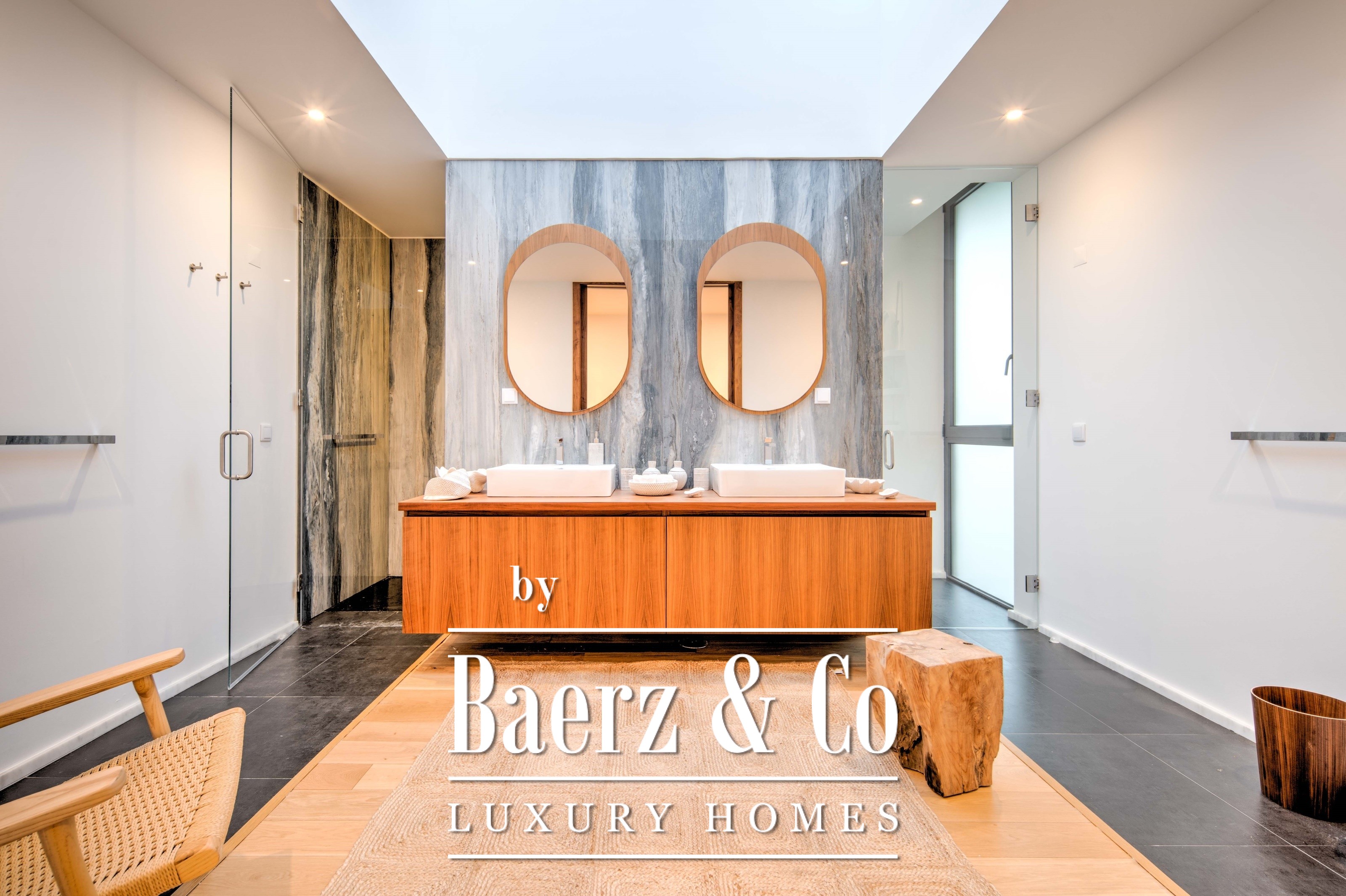 Located in exclusive Tróia Atlantic Villas near Comporta, this stunning modern villa sits moments from the Atlantic Ocean with pristine beaches just a 5-minute walk away. Only 90 minutes from Lisbon, it perfectly balances coastal tranquility with urban accessibility.The striking design features sand-coloured bricks, rich wood, and expansive glass seamlessly connecting indoors and outdoors. Floor-to-ceiling windows flood the space with natural light while showcasing sweeping garden views. An elegant wooden deck wraps around the house.Outdoor spaces shine with a sleek private pool surrounded by sun loungers, plus a handcrafted wooden dining table seating 10+ guests under warm timber beam lighting. The cozy fire pit lounge area creates intimate evening gatherings. The rooftop terrace offers breathtaking sea views—perfect for sunset drinks or stargazing.Inside, the open-plan layout maximizes natural light. The living room features velvet sofas, bold contemporary artwork, and custom lighting. The dining area includes a central island and spacious table for shared meals.Four beautifully designed suites each have king-size beds, with three