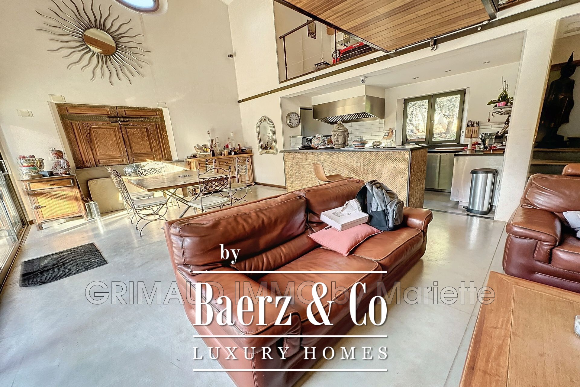 Villa Grimaud stands discreetly within easy walking distance of the village, surrounded by a wooded park measuring 1.5 hectares. The 360 m² single-story residence invites a pace of life attuned to nature and the rhythms of the French countryside. The interior is anchored by a spacious living room defined by exposed beams, continuing into an open kitchen ideal for quiet gatherings. Two ground-floor bedrooms share a shower room, while a mezzanine suite offers a private bathroom, dressing room, and access to a rooftop terrace.