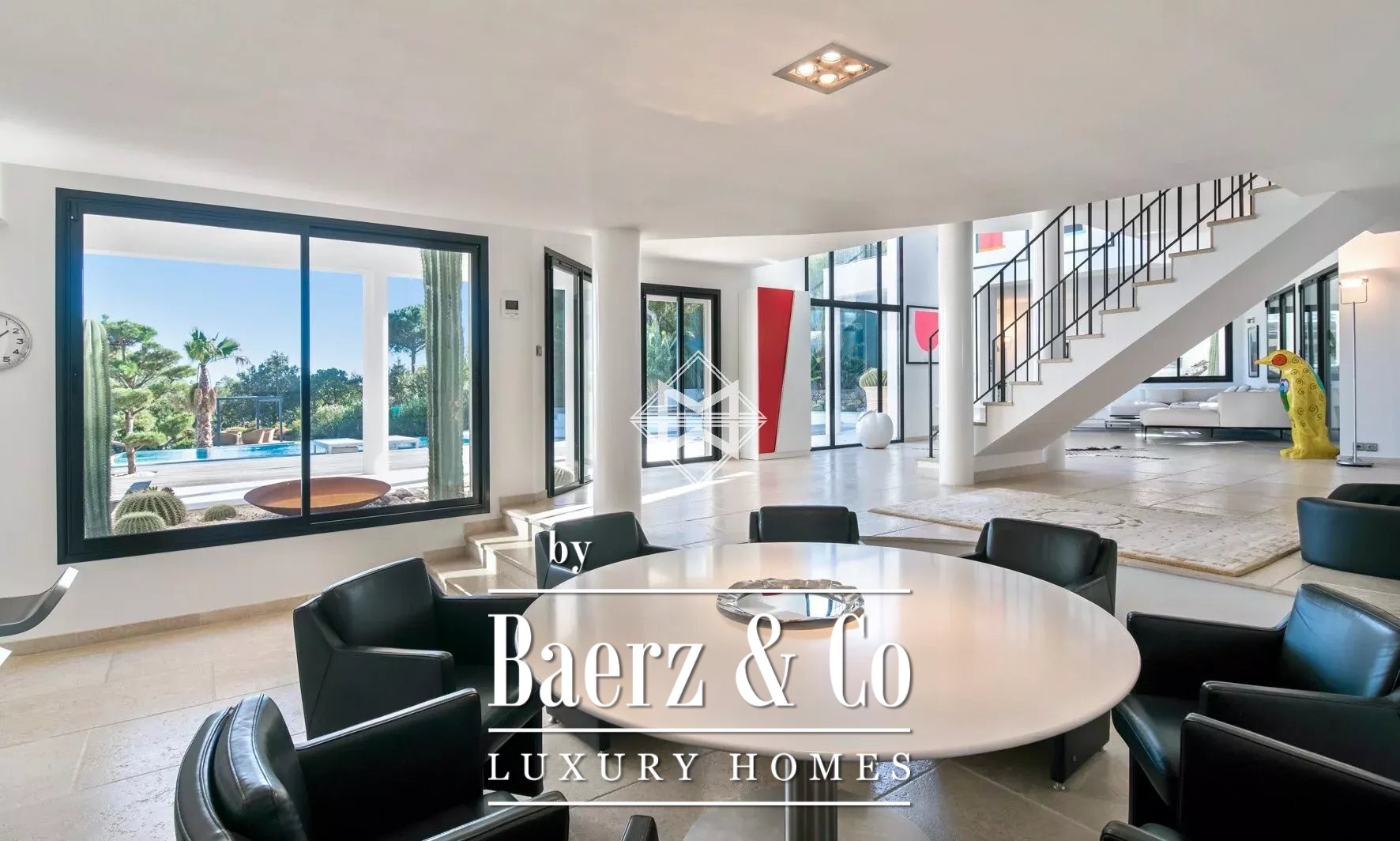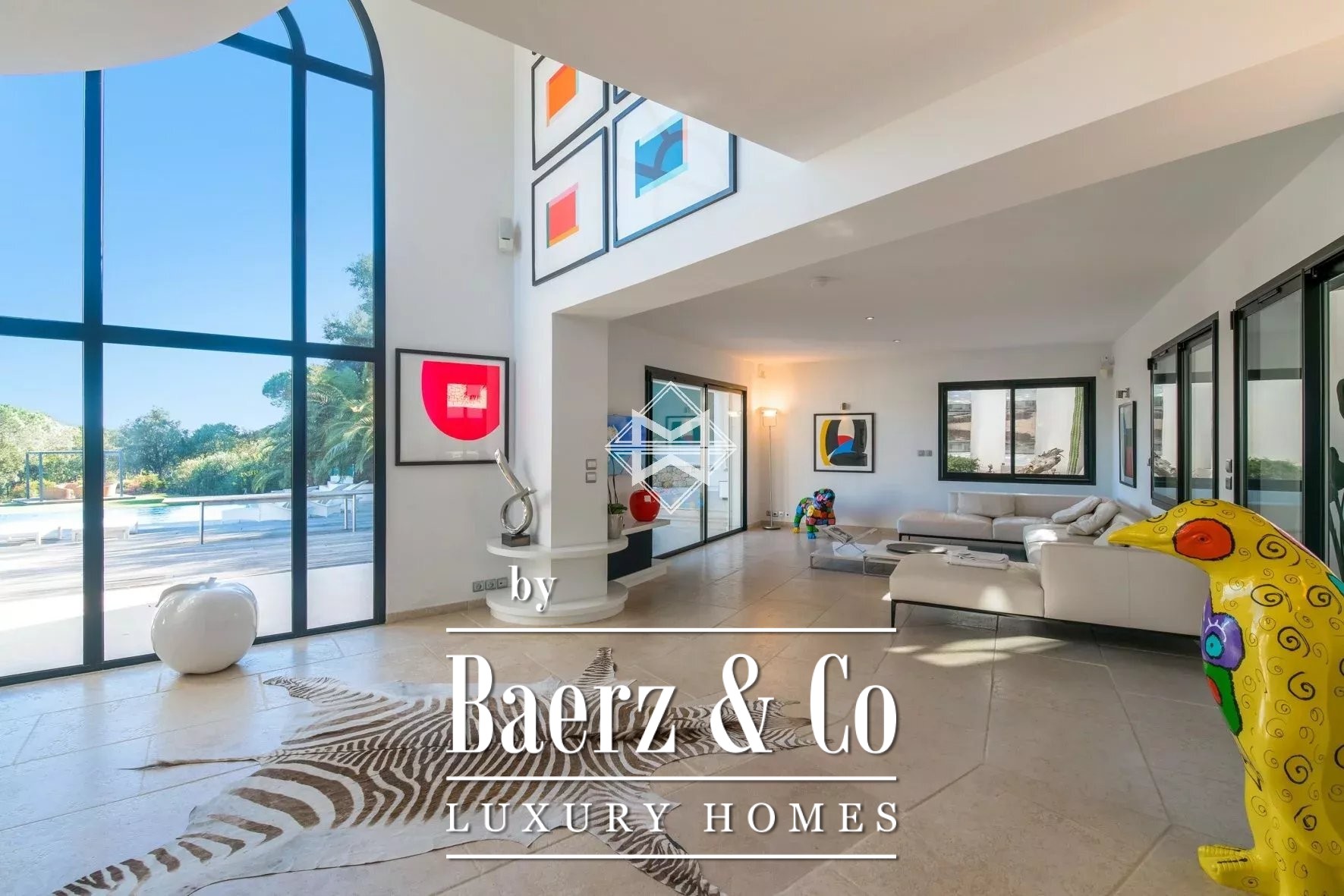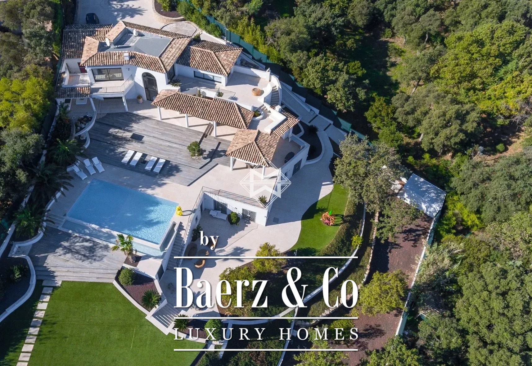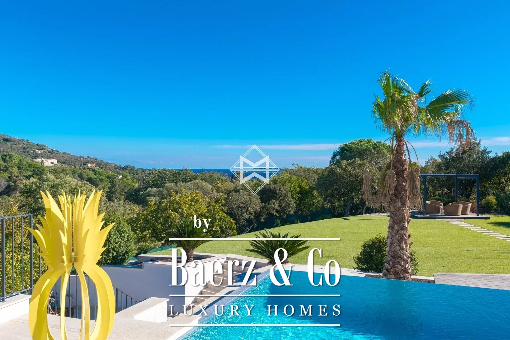 Villa Grimaud with sea views presents a modern architectural statement, shaped by clean lines and refined materials, in the heart of a prestigious estate near the Beauvallon Golf Club. Within its 400 m², the property offers a series of sunlit living spaces, four bedrooms, and four bathrooms, all arranged to convey a sense of calm and privacy. The flooring in marble and the nuanced interplay of stone and wood form a subtle palette, while expansive windows welcome the changing light and panoramic views of the sea and green hills.