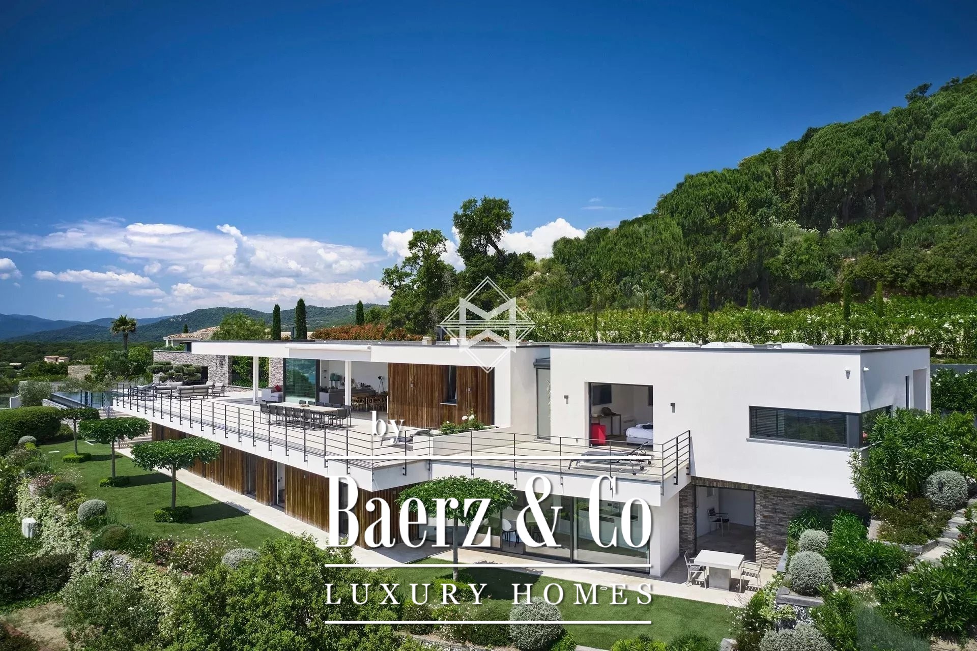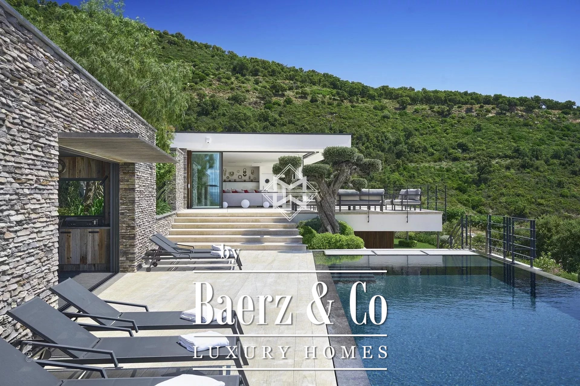 Villa Grimaud with panoramic sea views is quietly positioned in the heart of the Beauvallon Bartole estate, offering an atmosphere that speaks of both exclusivity and serenity. This contemporary villa spans approximately 423 m² across two levels, distinguished by its sweeping views over the Gulf of Saint-Tropez and the surrounding landscapes. The main living area flows seamlessly to an expansive outdoor terrace, while seven individual suites provide privacy for residents and guests alike.