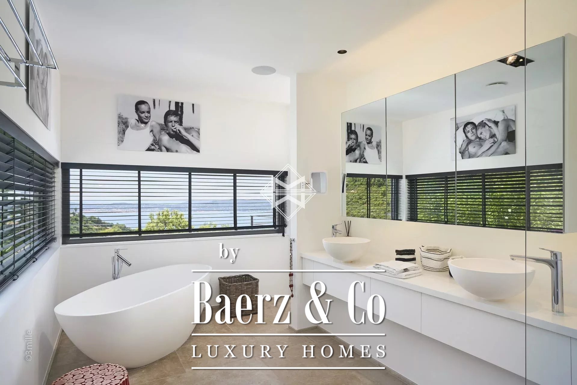 The villa’s plot, 2,503 m² in size, remains discreetly landscaped. Practical elements like solar panels and electric shutters combine with sophisticated finishes. Local destinations including Beauvallon beach and golf course are easily accessed within five minutes by car, infusing the experience of this luxury villa for sale in Grimaud with both ease and distinction.