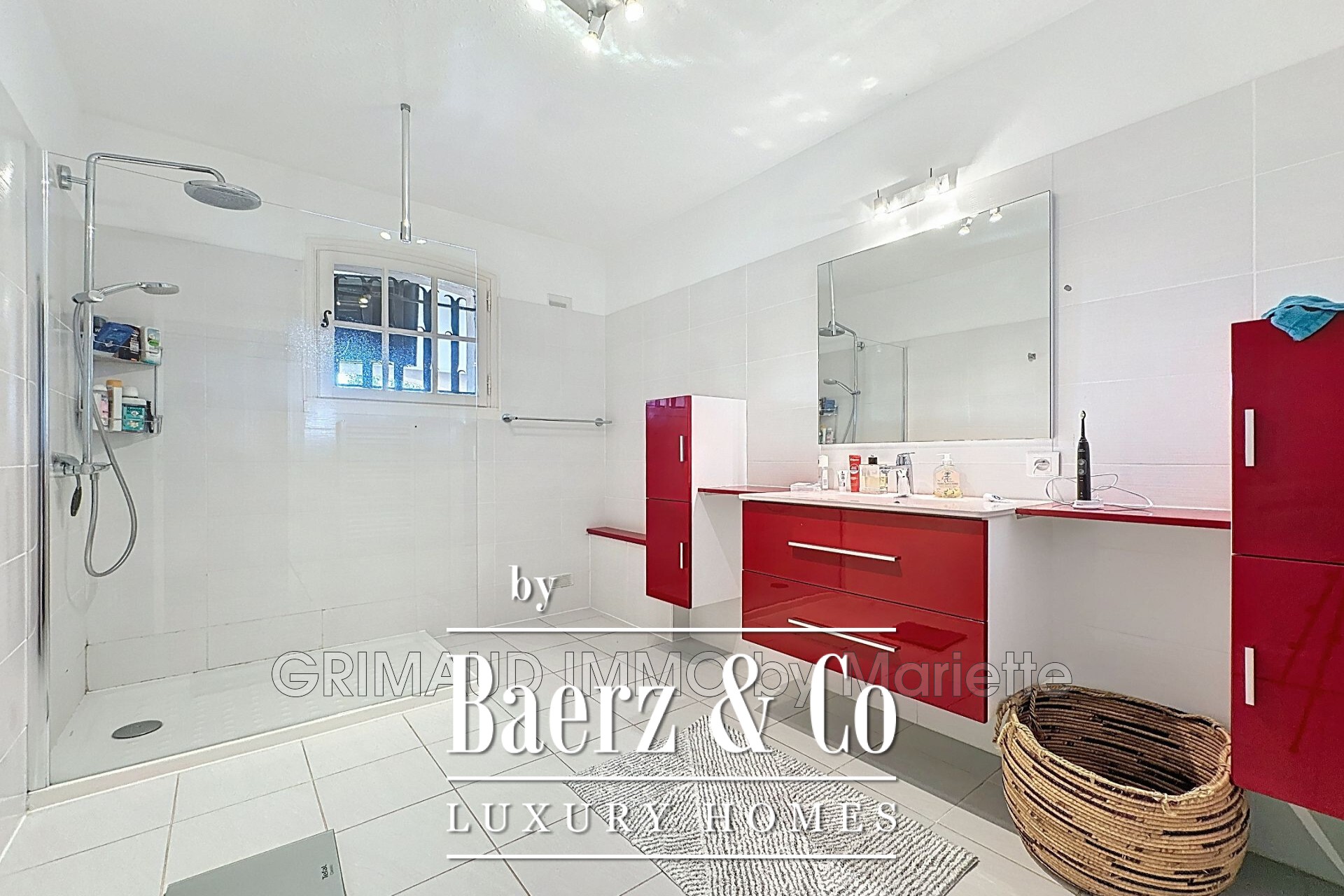 fitted kitchen, three bedrooms with two shower rooms, upstairs a master suite with its bathroom and an office. Numerous covered and uncovered terraces. Beautiful amenities and a beautiful view of the bay of Saint Tropez.