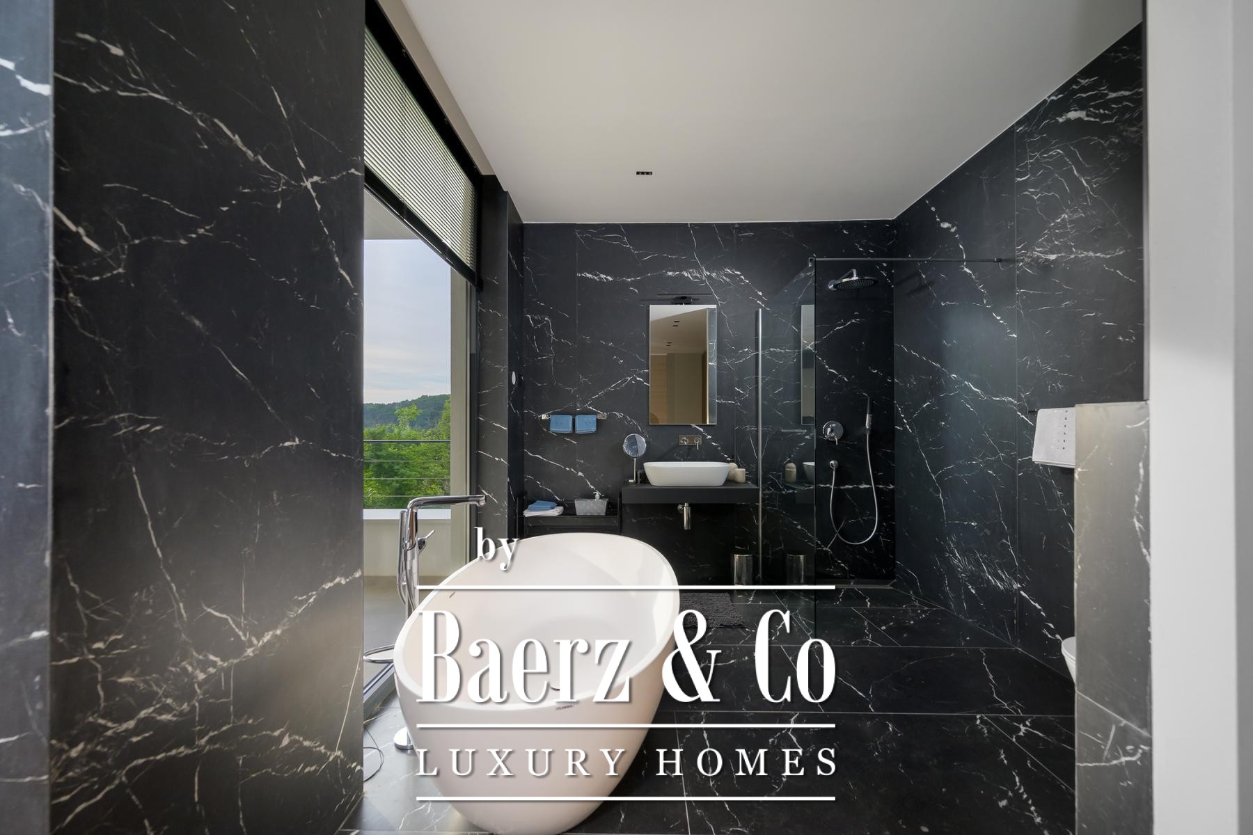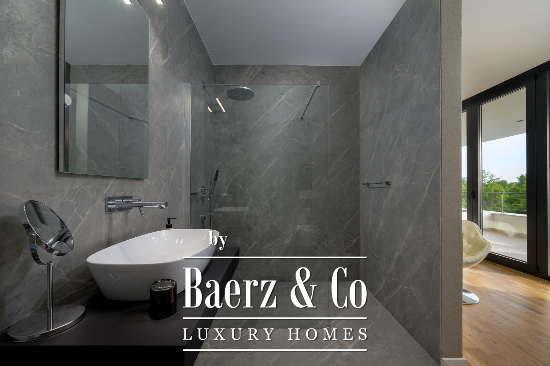A marble staircase leads to the private upper level where three bedroom suites, each with Hespo program 5* comfort and private terrace, invite mornings overlooking nature. Every bathroom features Hans Grohe and Axor fixtures and custom finishes. Throughout, details by Guzzini, Artemide, and Florim Bologna affirm the villa’s design pedigree.