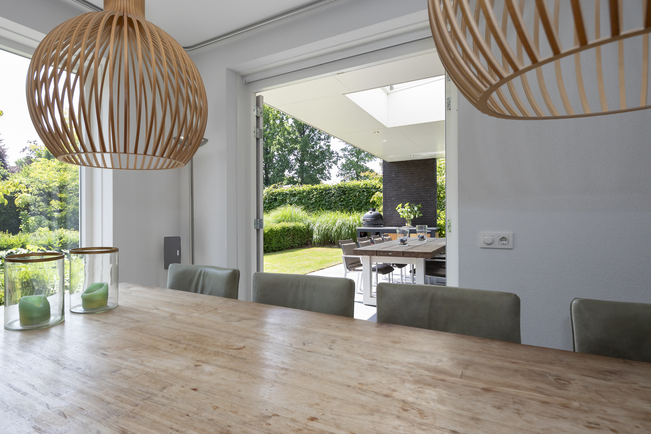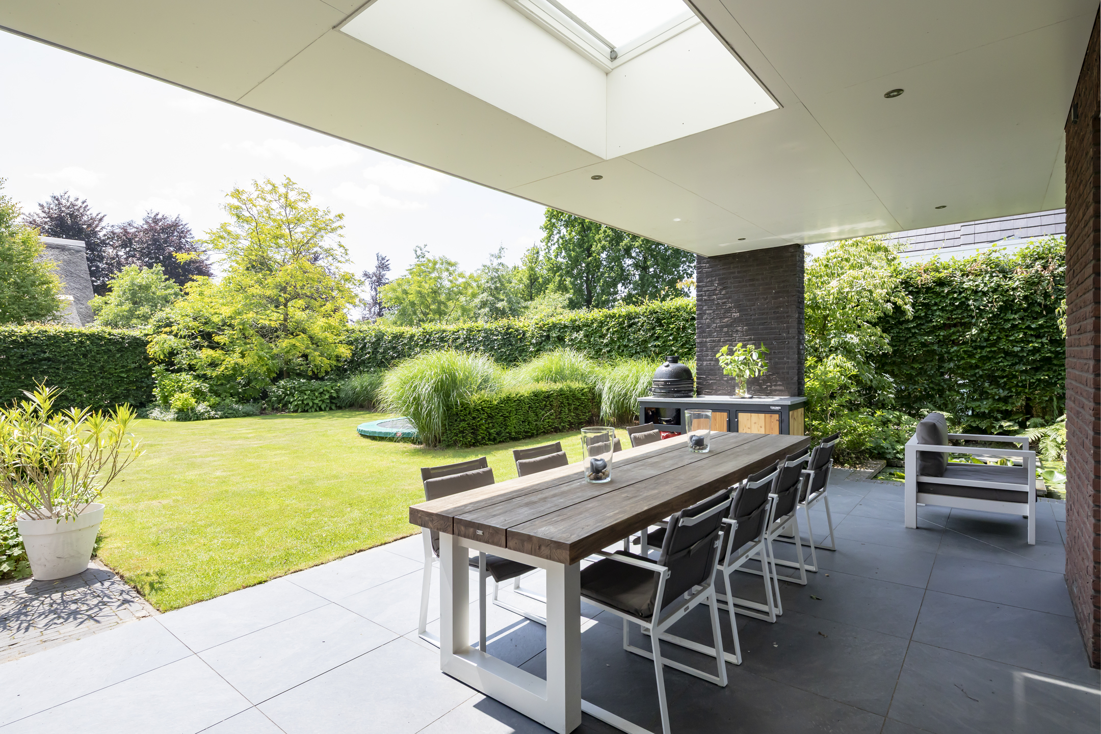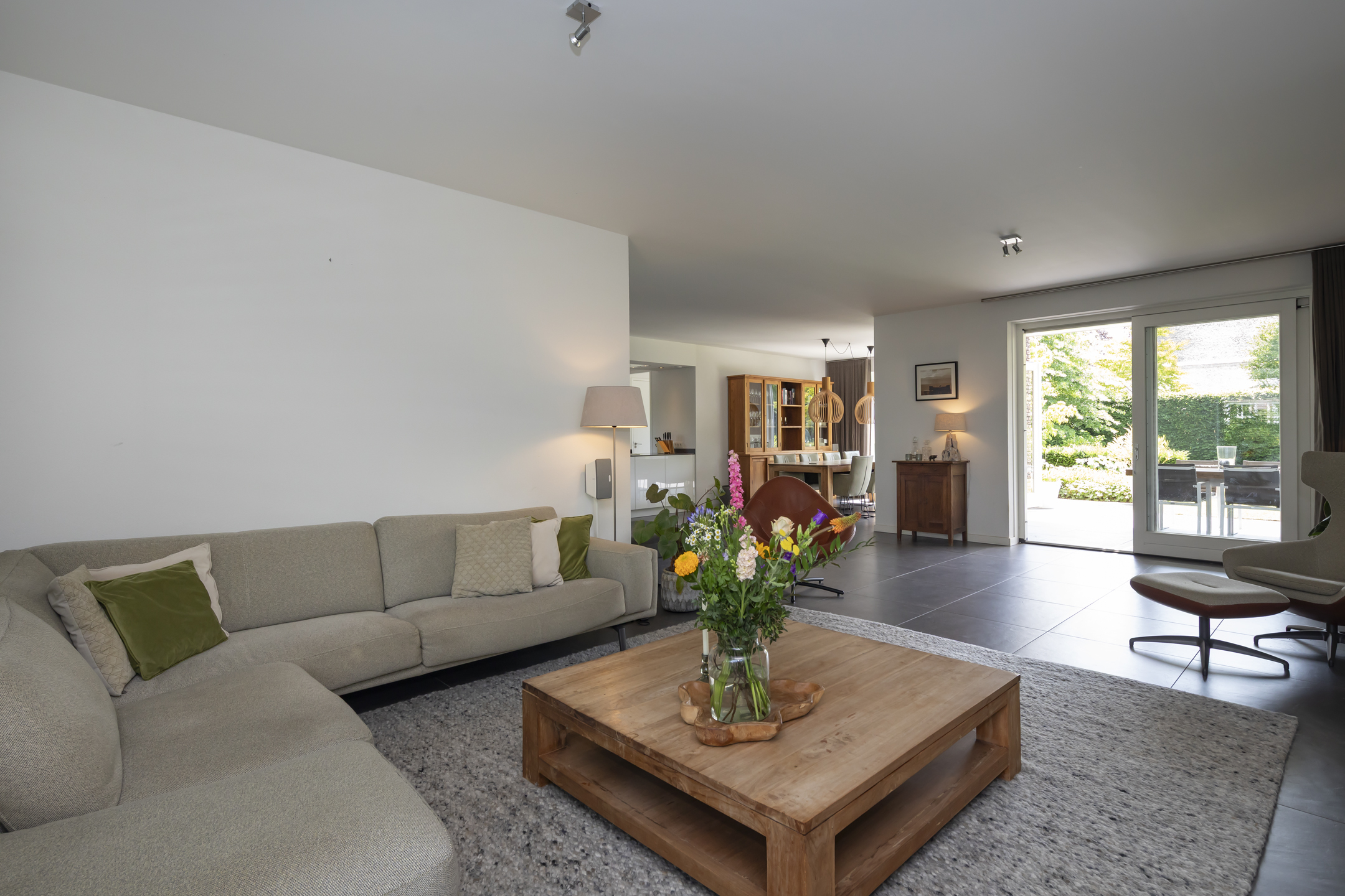 The dining area is also beautifully spacious. While seated at the table, you can enjoy the view of the beautiful garden. Double patio doors in the dining room open onto the generously sized covered terrace.