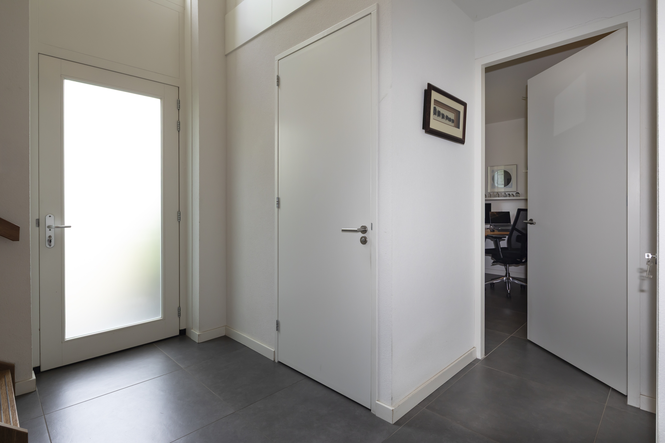 You enter the hall, where you'll find the meter cupboard, the toilet with a small sink, the staircase to the upper floor, and the entrance to the living room.