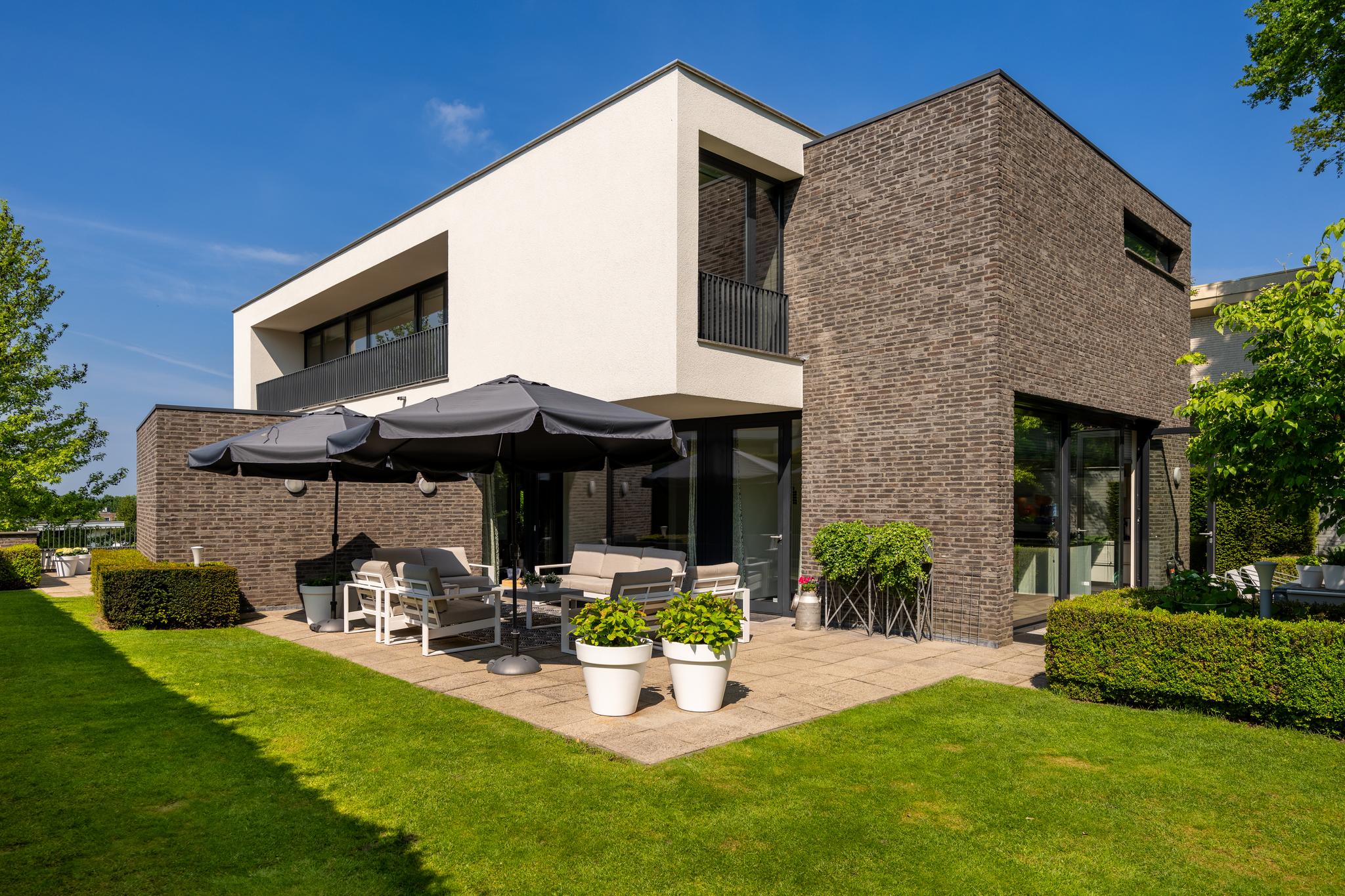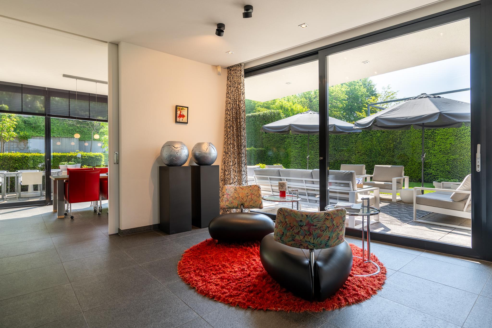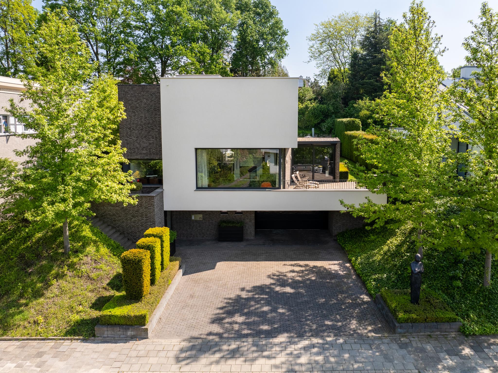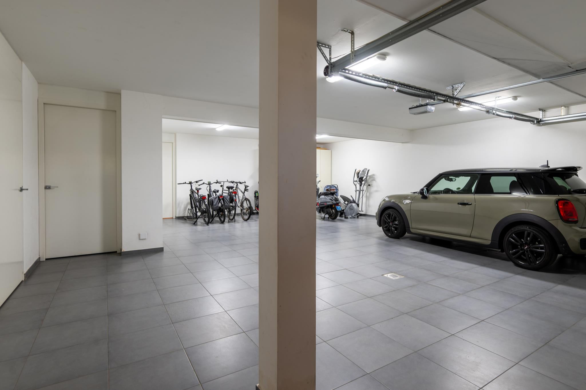 Via the spacious driveway, access is provided to the garage and covered entrance. The driveway is paved and offers space for parking multiple vehicles. Video intercom and mailbox. The entrance hall features built-in wardrobe cabinets, a utility meter cupboard, and access to the garage. Centrally located in the hall is a stately staircase leading to the living areas and the upper floor. The staircase is concrete with natural stone-finished steps. From the hall, the laundry room is accessible; it is equipped with a counter combination and connections for laundry machine. This room has a large glass sliding door, providing access to the patio and allowing ample daylight to enter. Adjacent is the studio space, which also offers access to the patio through a large glass door. The tranquility of the patio and the beautiful light make it a pleasant workspace. Behind this area is a spacious storage room. The garage accommodates multiple cars and has an extra-wide sectional door with an adjacent separate access door. Space for wine storage, a technical room with connections for the HR combi boiler (owned) and a reservoir for the central vacuum system. Storage space for waste/paper containers and an inverter for the solar panels.