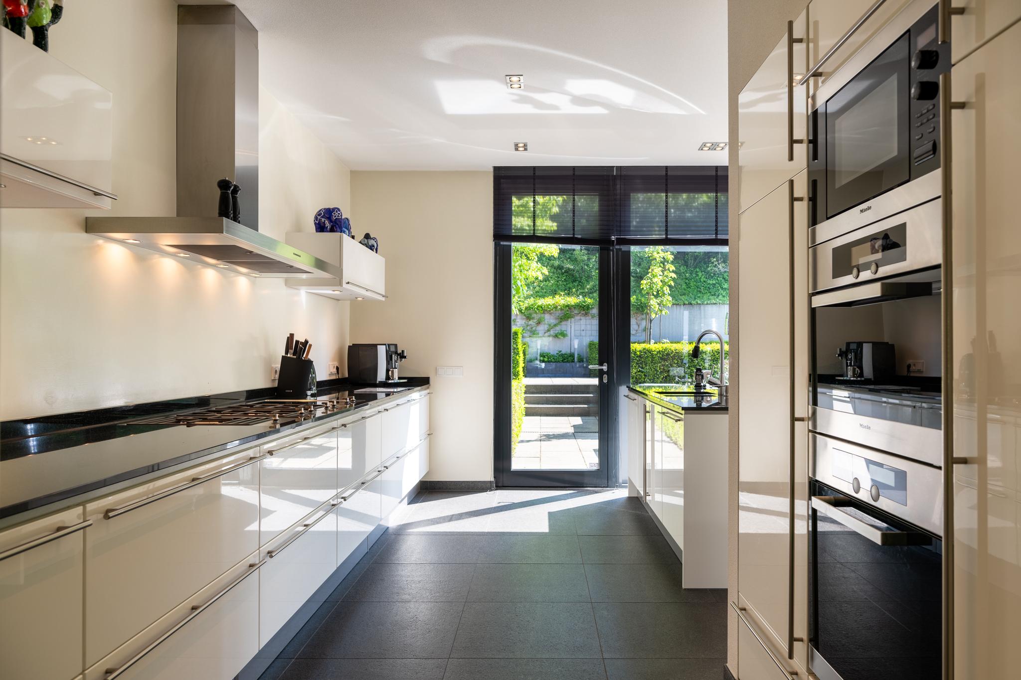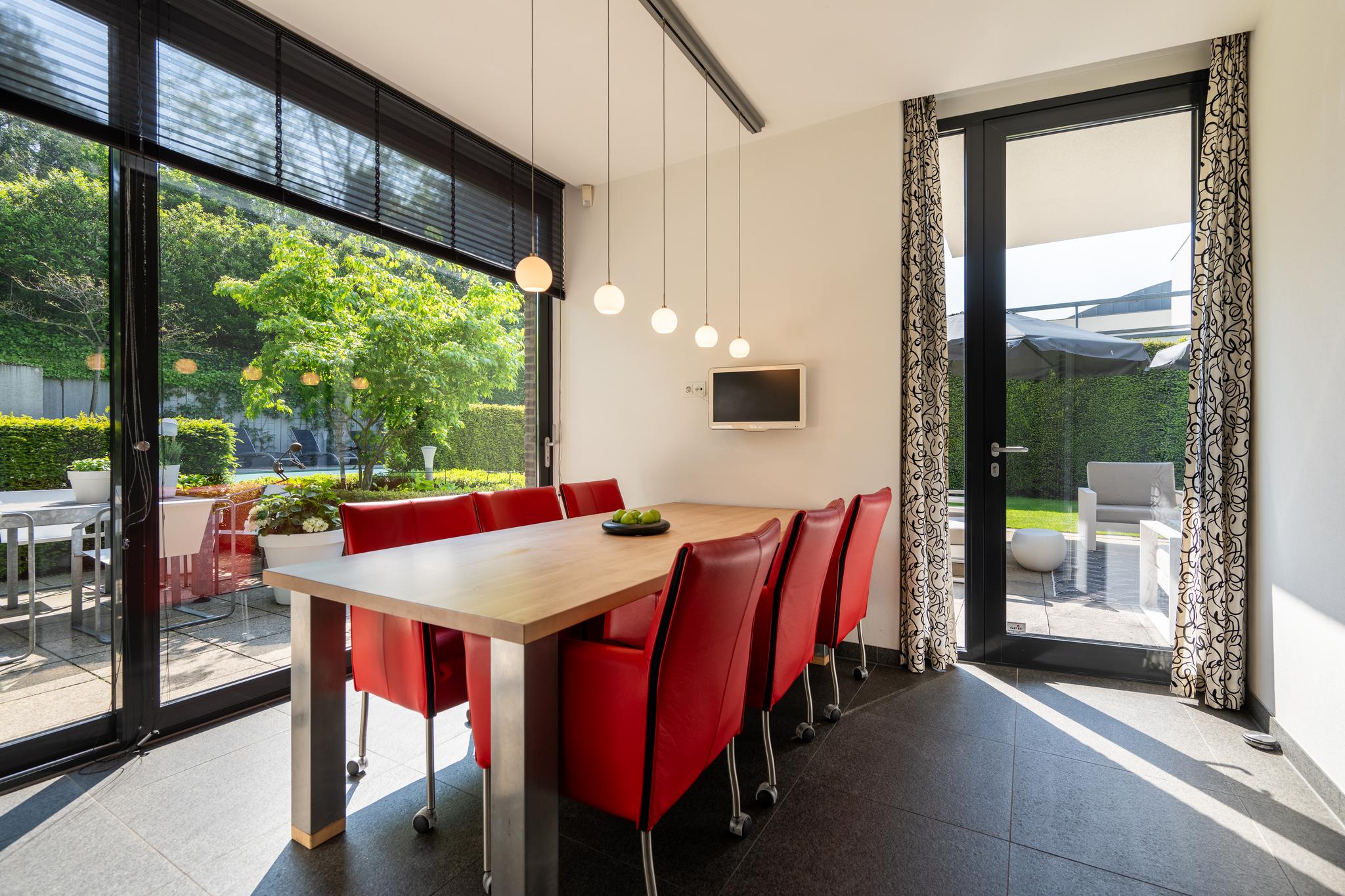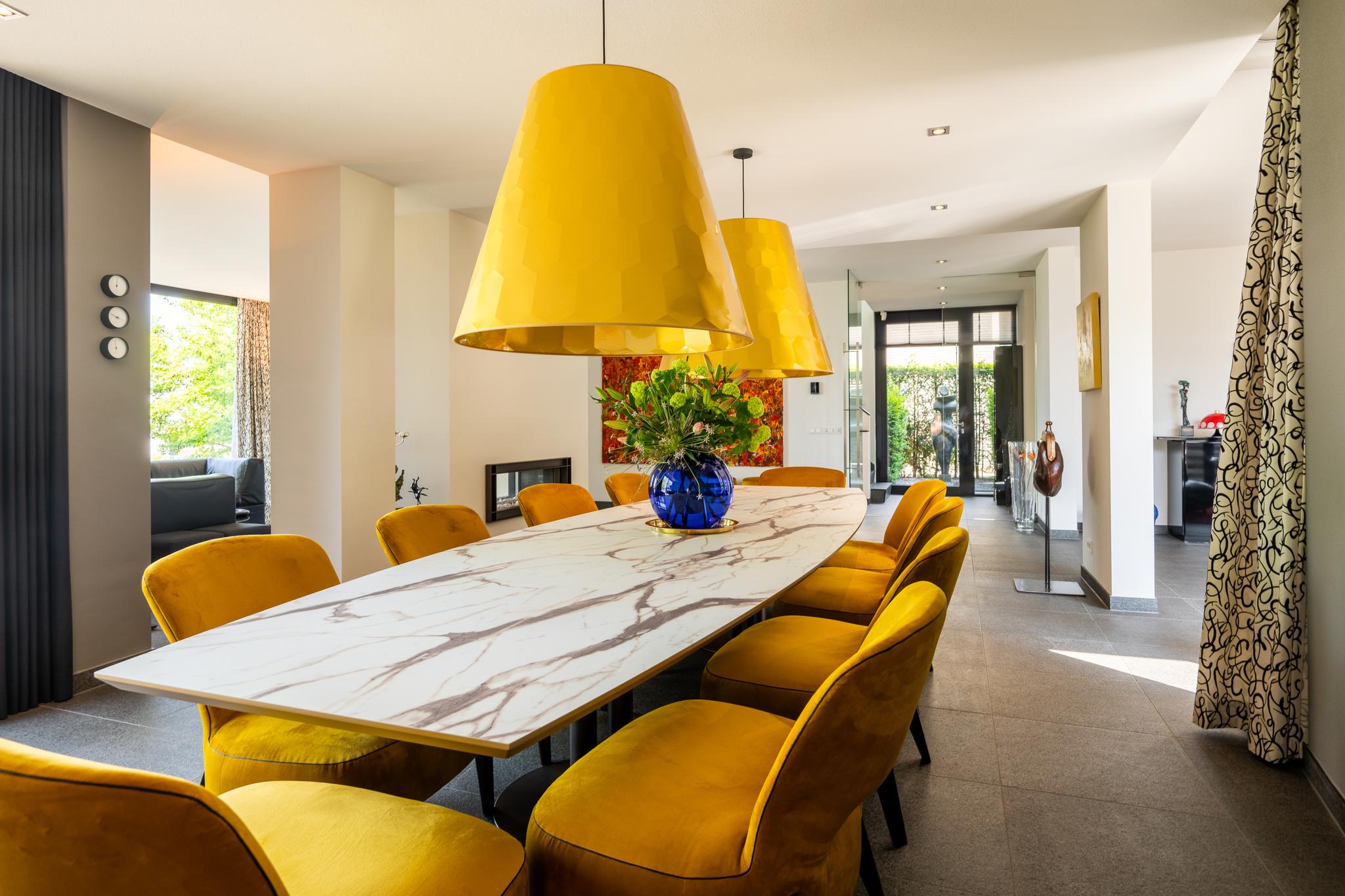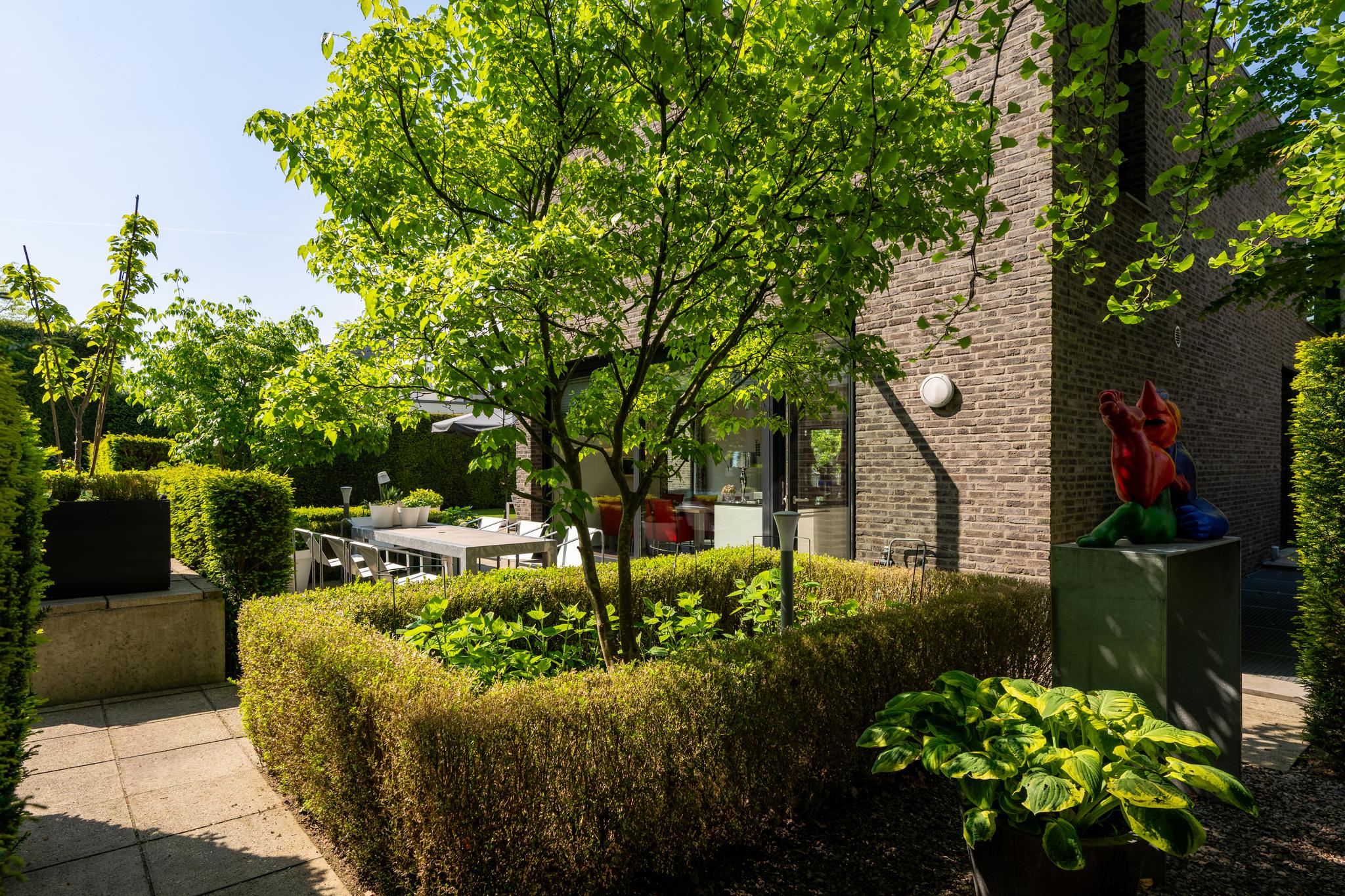 Via the spacious driveway, access is provided to the garage and covered entrance. The driveway is paved and offers space for parking multiple vehicles. Video intercom and mailbox. The entrance hall features built-in wardrobe cabinets, a utility meter cupboard, and access to the garage. Centrally located in the hall is a stately staircase leading to the living areas and the upper floor. The staircase is concrete with natural stone-finished steps. From the hall, the laundry room is accessible; it is equipped with a counter combination and connections for laundry machine. This room has a large glass sliding door, providing access to the patio and allowing ample daylight to enter. Adjacent is the studio space, which also offers access to the patio through a large glass door. The tranquility of the patio and the beautiful light make it a pleasant workspace. Behind this area is a spacious storage room. The garage accommodates multiple cars and has an extra-wide sectional door with an adjacent separate access door. Space for wine storage, a technical room with connections for the HR combi boiler (owned) and a reservoir for the central vacuum system. Storage space for waste/paper containers and an inverter for the solar panels.