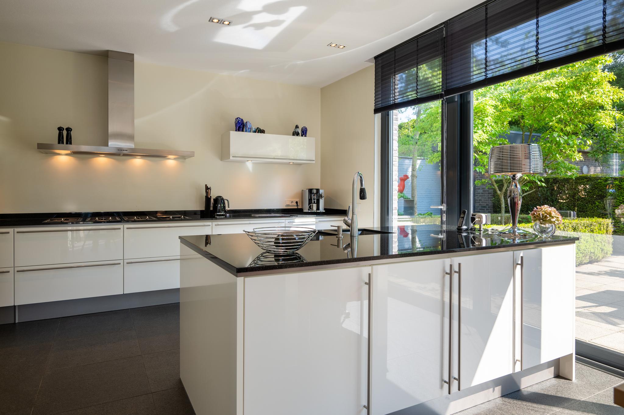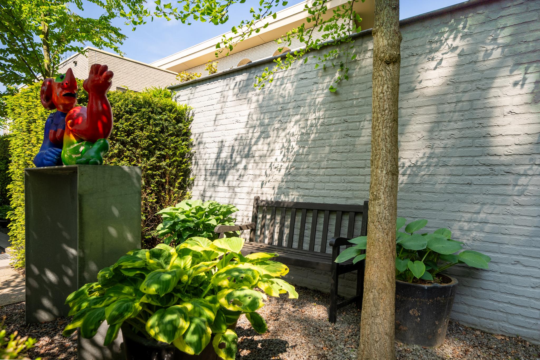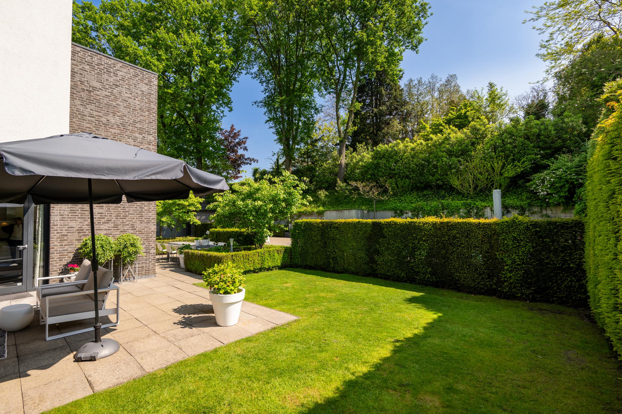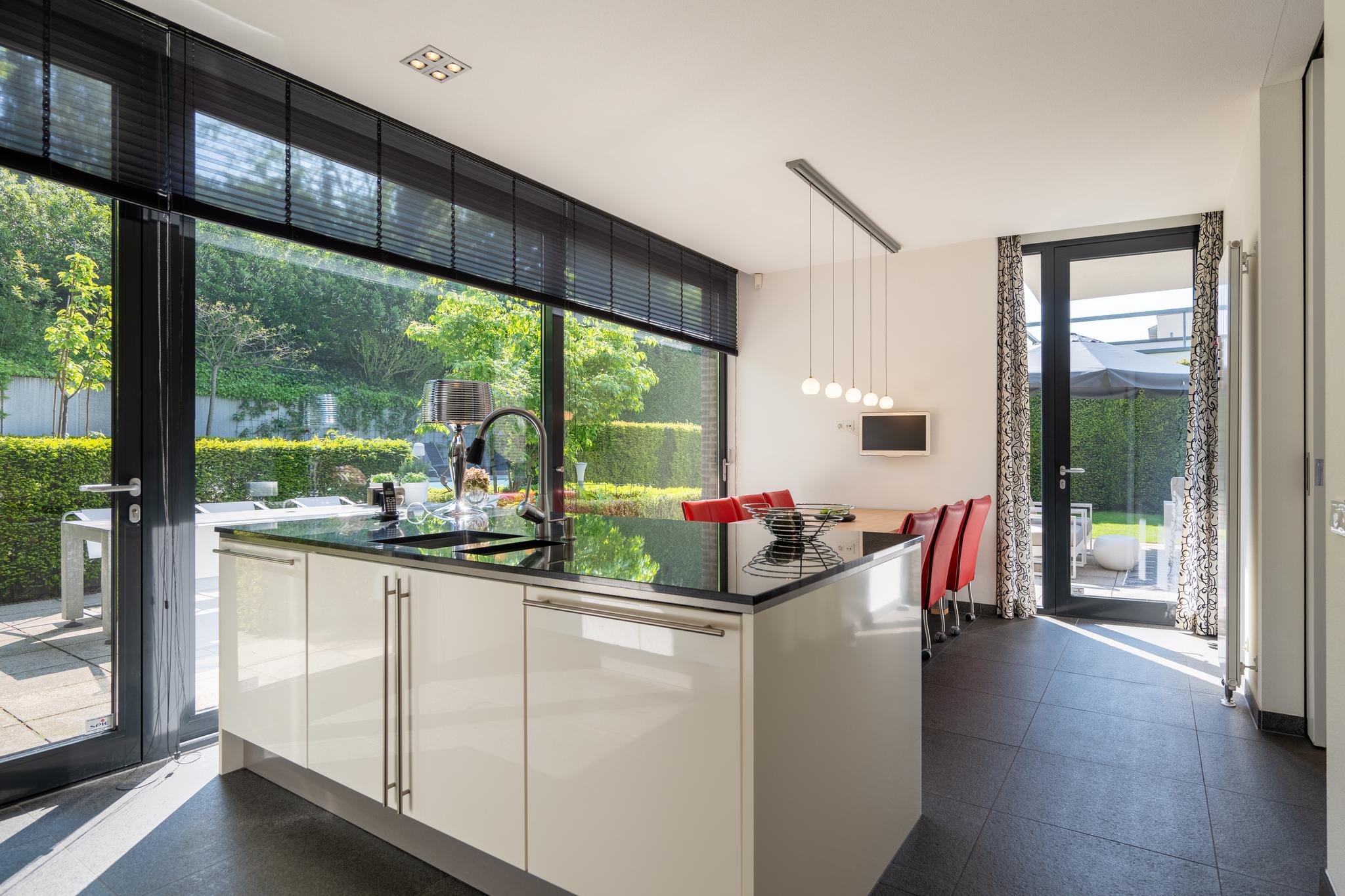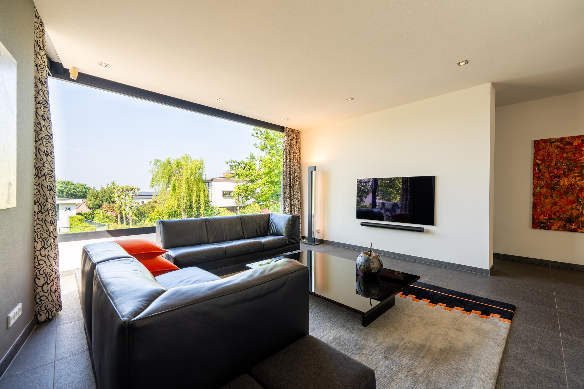 Via the spacious driveway, access is provided to the garage and covered entrance. The driveway is paved and offers space for parking multiple vehicles. Video intercom and mailbox. The entrance hall features built-in wardrobe cabinets, a utility meter cupboard, and access to the garage. Centrally located in the hall is a stately staircase leading to the living areas and the upper floor. The staircase is concrete with natural stone-finished steps. From the hall, the laundry room is accessible; it is equipped with a counter combination and connections for laundry machine. This room has a large glass sliding door, providing access to the patio and allowing ample daylight to enter. Adjacent is the studio space, which also offers access to the patio through a large glass door. The tranquility of the patio and the beautiful light make it a pleasant workspace. Behind this area is a spacious storage room. The garage accommodates multiple cars and has an extra-wide sectional door with an adjacent separate access door. Space for wine storage, a technical room with connections for the HR combi boiler (owned) and a reservoir for the central vacuum system. Storage space for waste/paper containers and an inverter for the solar panels.