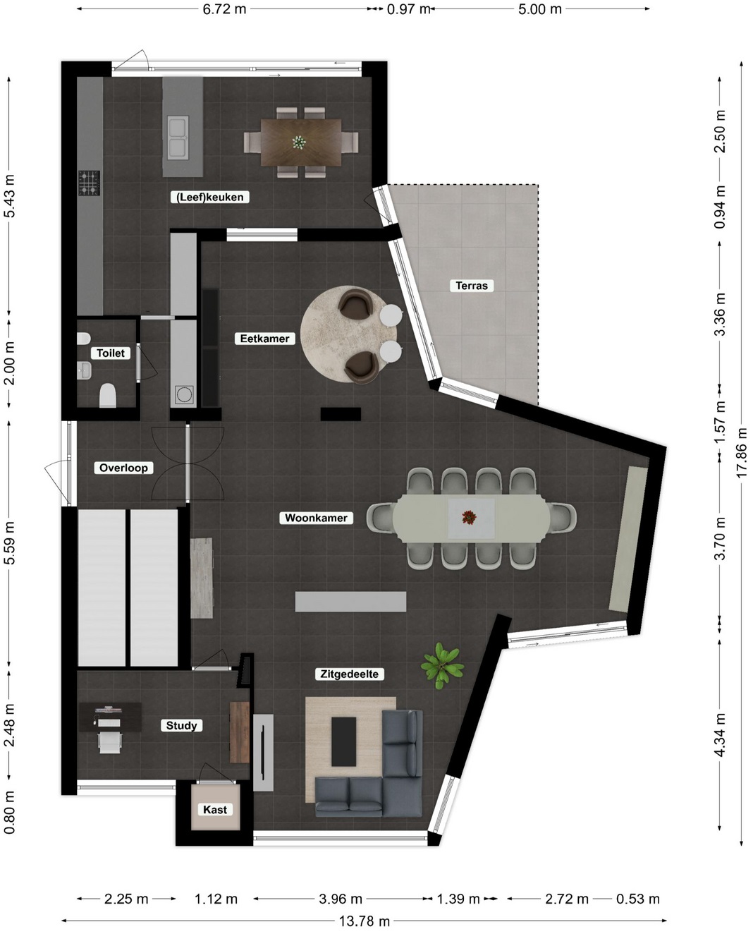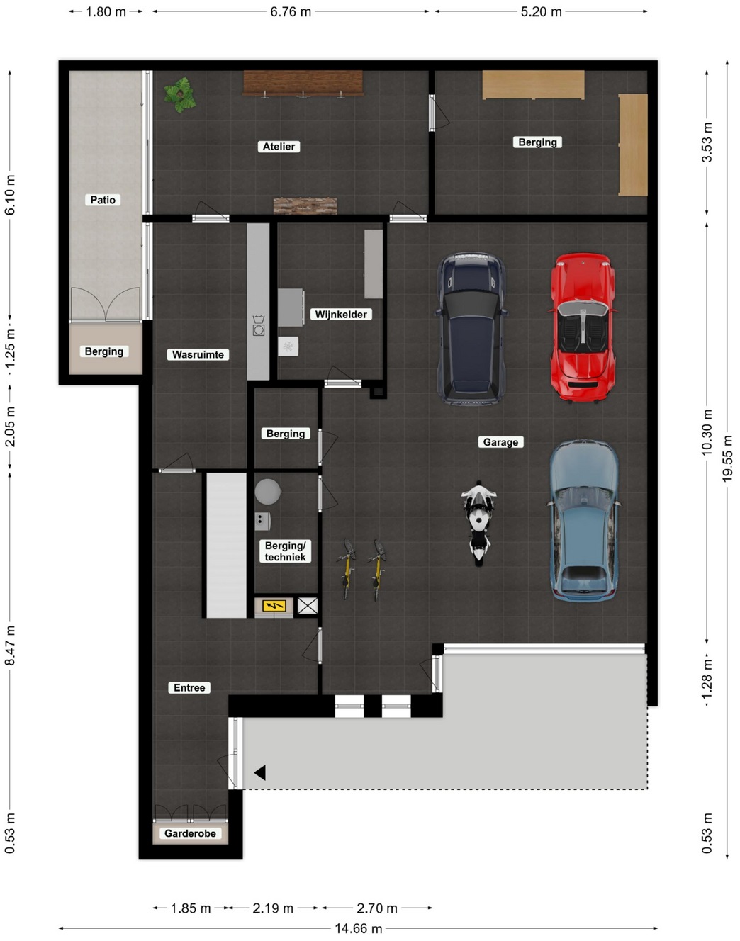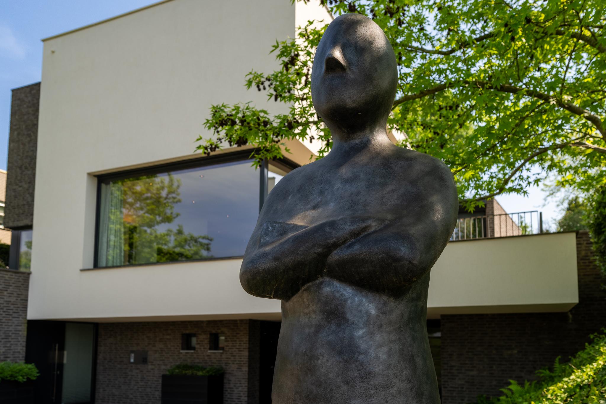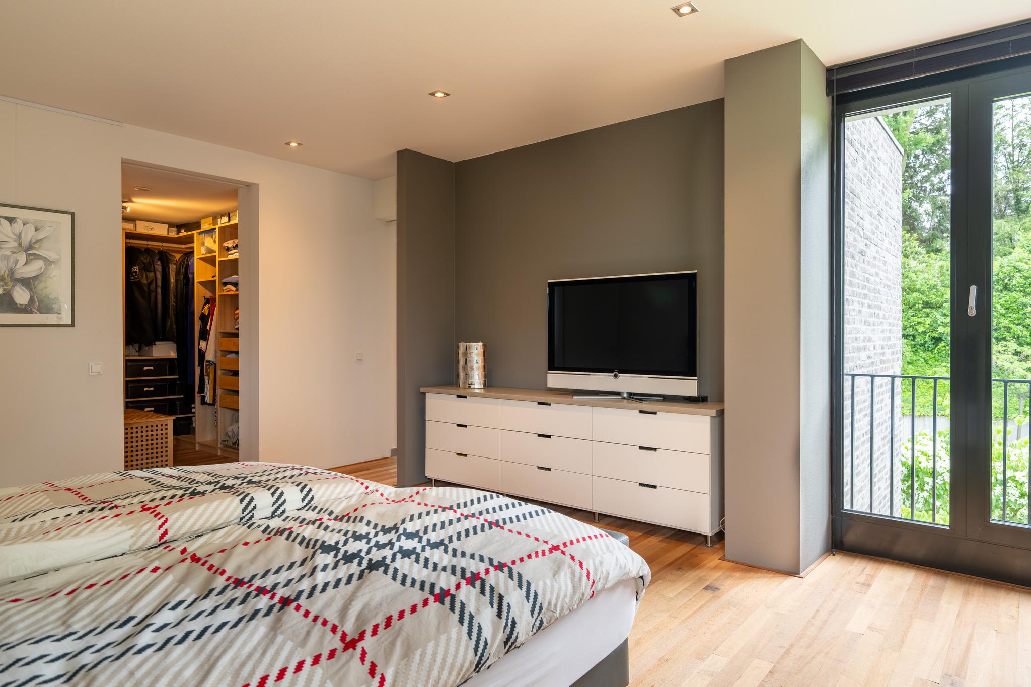 Via the spacious driveway, access is provided to the garage and covered entrance. The driveway is paved and offers space for parking multiple vehicles. Video intercom and mailbox. The entrance hall features built-in wardrobe cabinets, a utility meter cupboard, and access to the garage. Centrally located in the hall is a stately staircase leading to the living areas and the upper floor. The staircase is concrete with natural stone-finished steps. From the hall, the laundry room is accessible; it is equipped with a counter combination and connections for laundry machine. This room has a large glass sliding door, providing access to the patio and allowing ample daylight to enter. Adjacent is the studio space, which also offers access to the patio through a large glass door. The tranquility of the patio and the beautiful light make it a pleasant workspace. Behind this area is a spacious storage room. The garage accommodates multiple cars and has an extra-wide sectional door with an adjacent separate access door. Space for wine storage, a technical room with connections for the HR combi boiler (owned) and a reservoir for the central vacuum system. Storage space for waste/paper containers and an inverter for the solar panels.