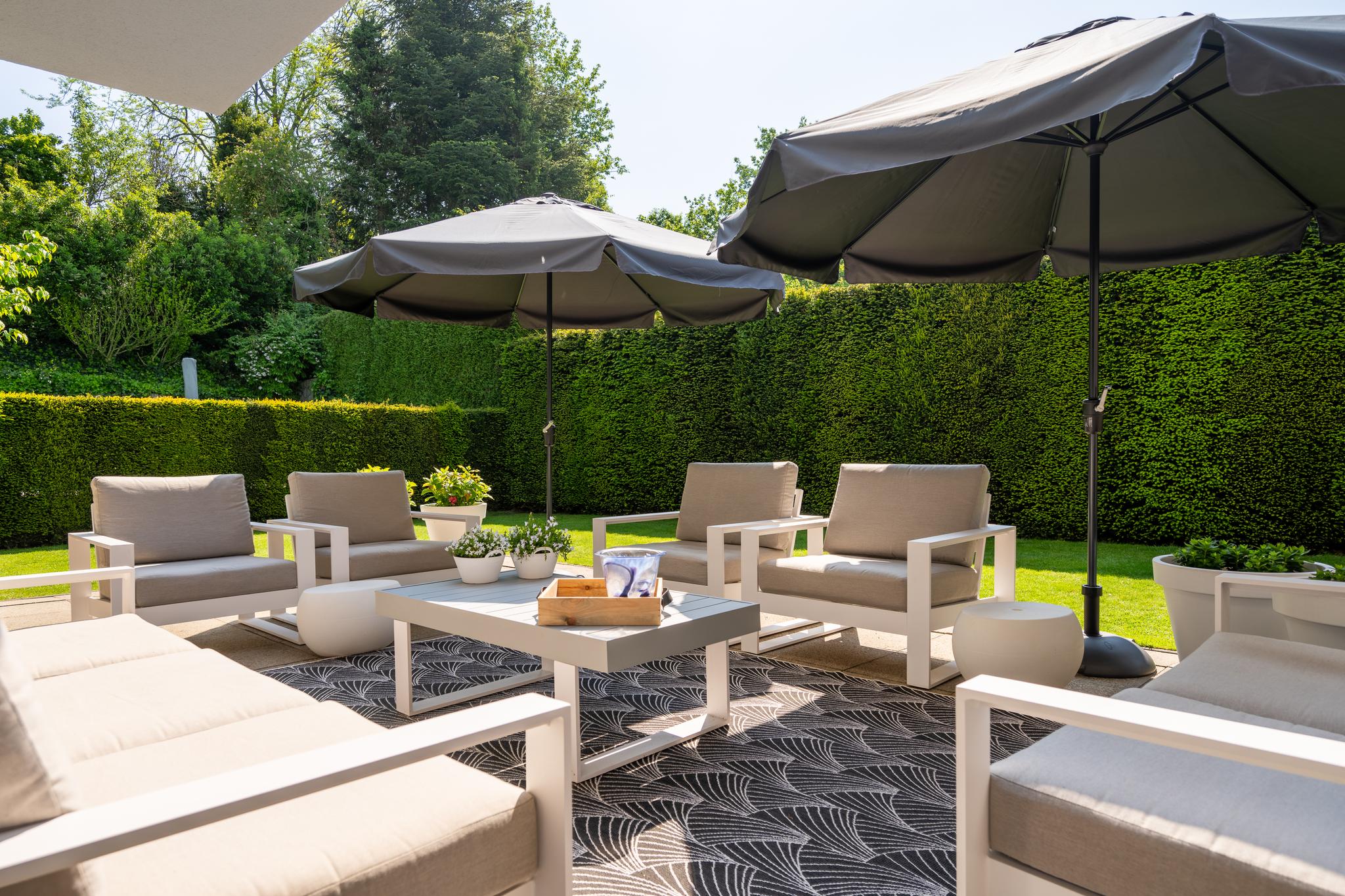 Upon entering the garden, the harmoniously integrated swimming pool immediately stands out as the central element of this beautifully designed outdoor space. The pool, with crystal-clear water, is surrounded by a natural stone terrace, solar deck, and accessible via the "Roman-style" steps. The pool’s technical equipment, such as the filtration system and heat pump, is housed in a brick-built technical room/storage area. Various beautifully designed trees around the pool not only provide aesthetic value but also offer shade and privacy. The trees are carefully positioned to maximize privacy without losing the sense of openness and space. The dense foliage forms a natural screen, allowing for complete relaxation without outside intrusion. The garden is architecturally designed with a keen eye for detail and balance. The lighting plan creates a beautiful atmosphere.