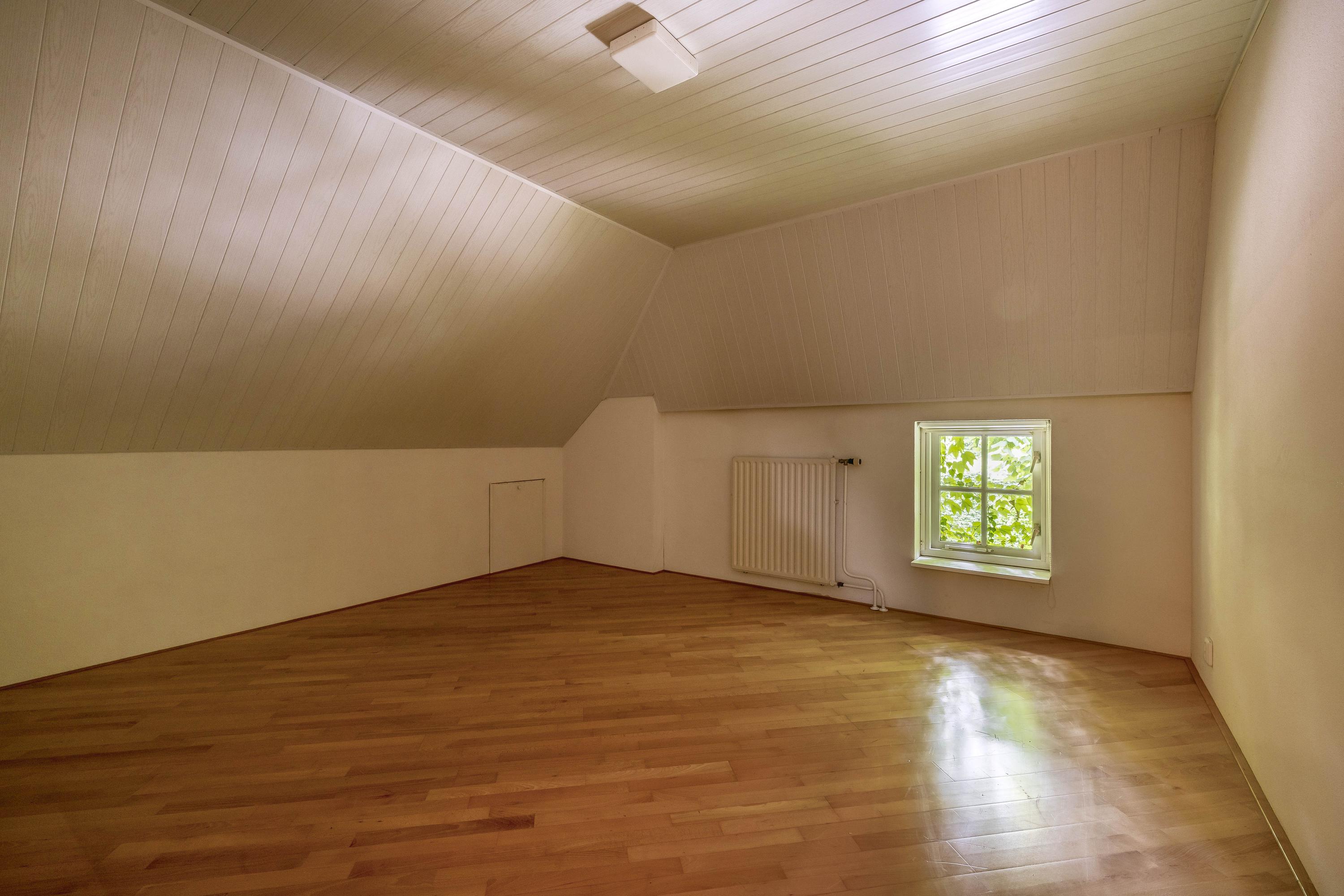 recessed lighting. A dormer window provides natural light and ventilation. A fixed staircase provides access to the attic. The storage room also has parquet flooring, stucco walls and a panelled ceiling. Bedroom II is finished with parquet flooring, stucco walls and a panelled ceiling. A dormer window and a window provide natural light and ventilation. Storage space has been created under the sloping roof. Bedroom III also has parquet flooring, stucco walls and a panelled ceiling. A window provides natural light and ventilation. Here too, storage space has been created under the sloping roof. The attic space has a wooden floor. Five skylights ensure that the space enjoys plenty of natural light. There is also an owl box. From the first floor, a second staircase provides access to the kitchen on the ground floor.