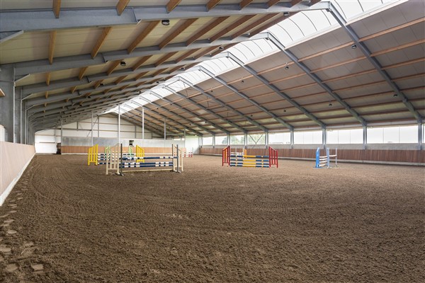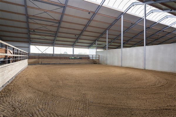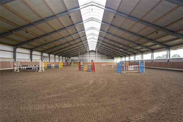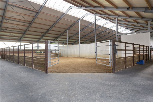 The detached riding hall was built in 2019 and equipped with an indoor arena, a lunging/running arena, 2 stable units with a total of 28 spacious boxes and a canteen with toilet, shower and washing area. The stable units each have a tack room, a washing and a grooming area. The indoor arena (approx. 30x50 m) is equipped with a professional soil, a hardwood box base and plenty of natural light through windows in the side wall and a skylight in the ridge of the roof.
