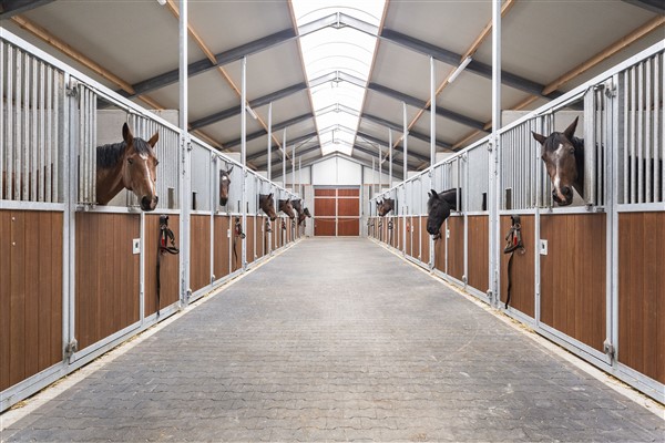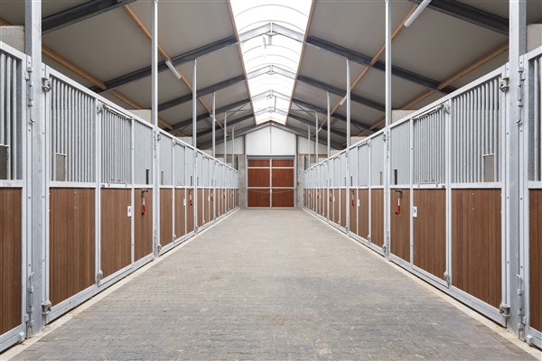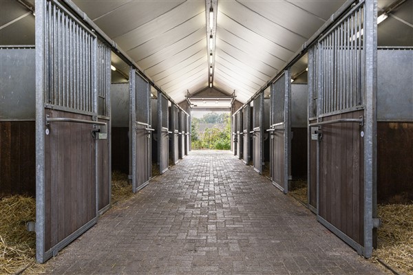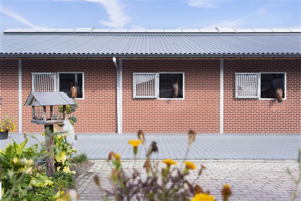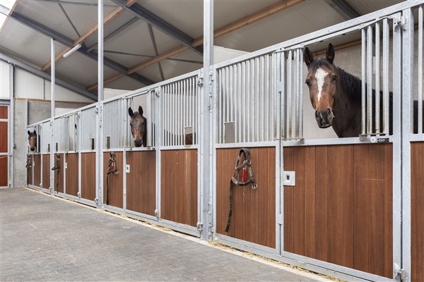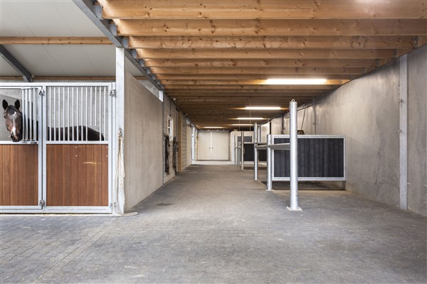The detached stable is furnished with 17 horse boxes (Corton), of which 14 boxes measure approx. 3x3 metres and 3 boxes measure approx. 3x5 metres. The stable is built from brickwork and the roof is insulated.