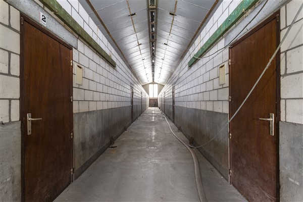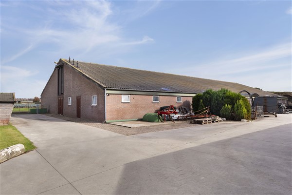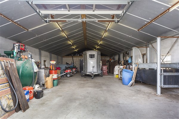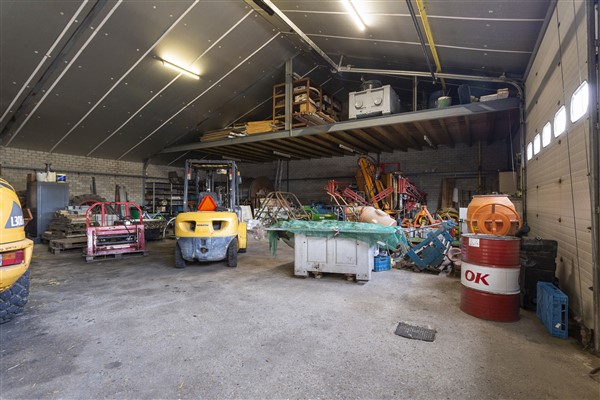 The detached field barn is closed with 2 large rolling doors and mainly used for storing machines and tools. The walls are built from brickwork and steel trusses. The roof is covered with asbestos corrugated iron. In addition, part of the barn is in use as a workshop and as a cold store.