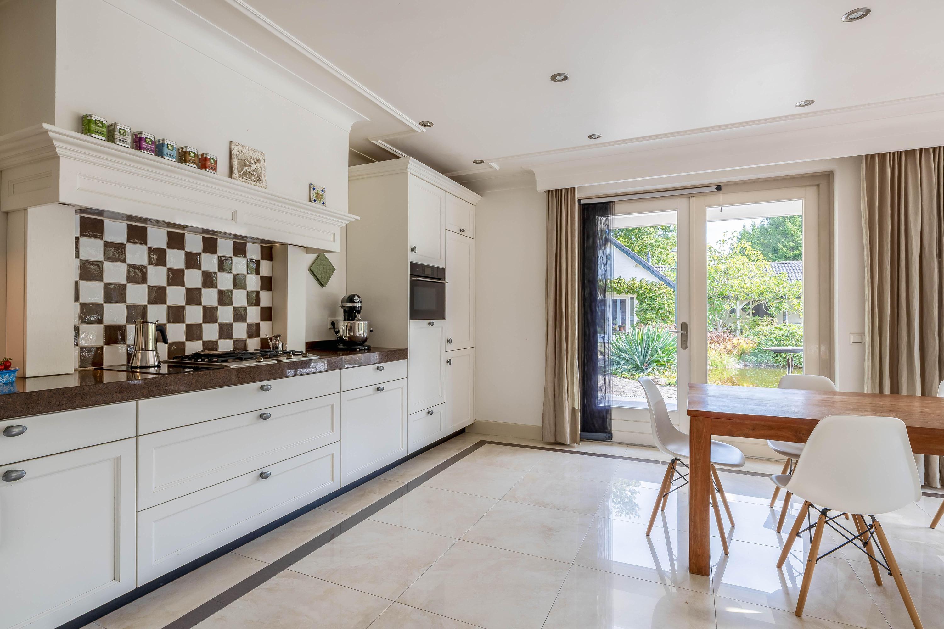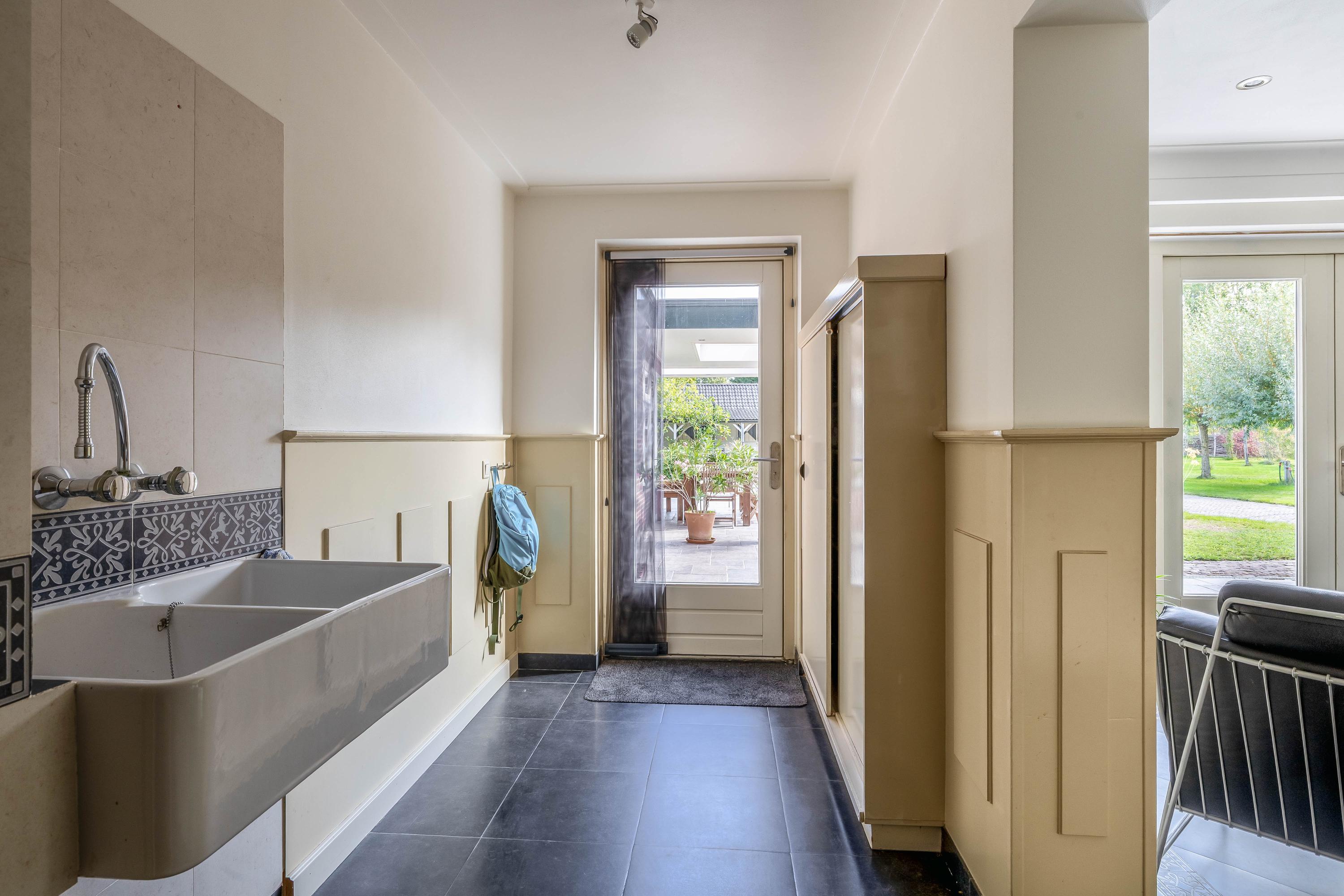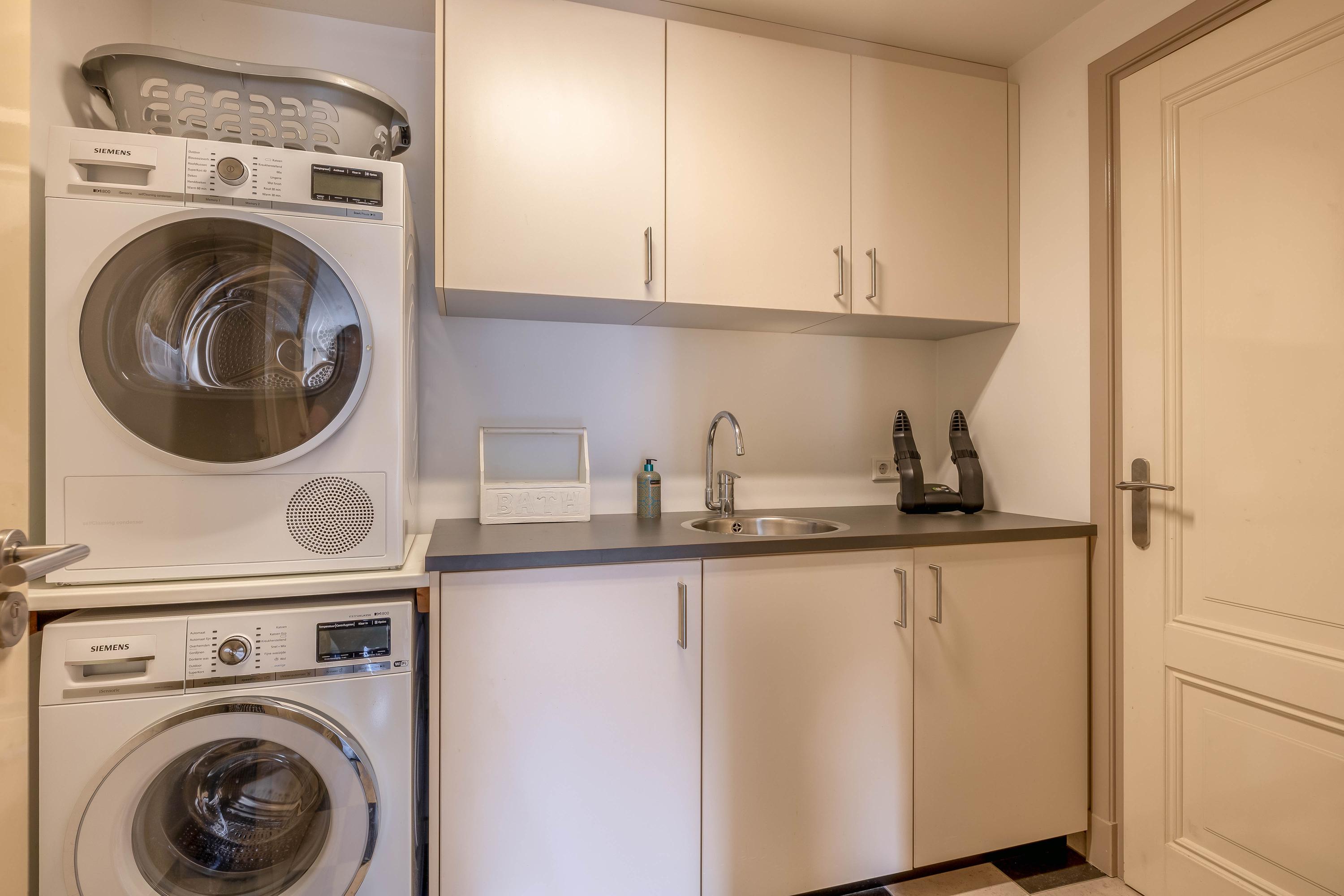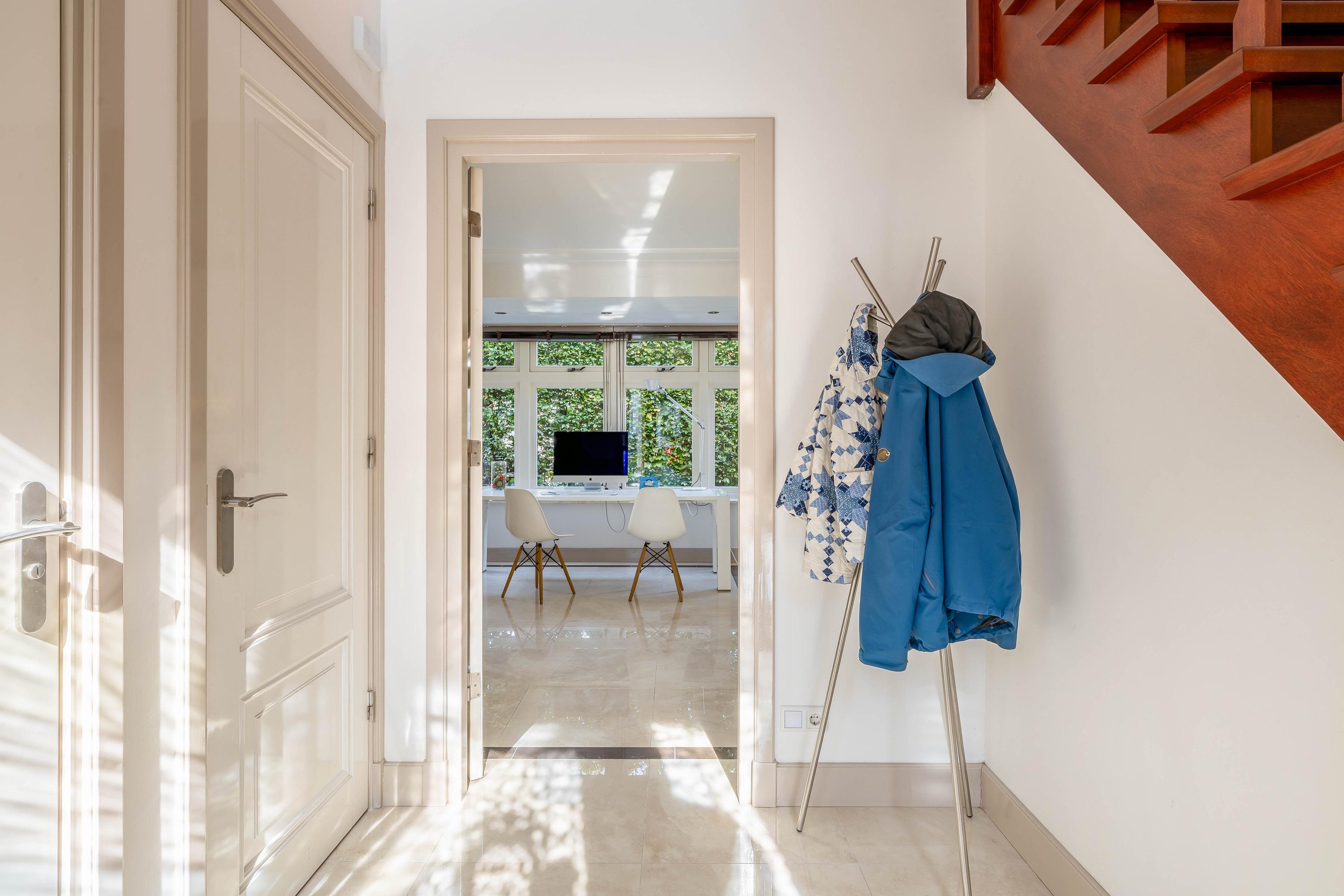 window provides access to the living room. The living room has a marble tiled floor with underfloor heating, stucco walls and a stucco ceiling with decorative mouldings. Thanks to the many windows and a large bay window, the room enjoys plenty of natural light, creating a spacious effect. Adjacent to the living room is a versatile space, ideal for an inspiring workspace or a cosy play area. The space can be closed off with a sliding door with stained glass. The kitchen has a corner layout and is equipped with a 5-burner gas hob, combination microwave/oven, sink, American fridge and dishwasher. Various base and wall cabinets provide storage space. There is enough space to place a dining table. The kitchen has a tiled floor with bis. The walls are partly finished with sleek stucco and partly with wooden panelling. The ceiling has stucco with decorative mouldings. The kitchen is open to the adjoining garden room. Here too, large windows provide a sea of light and a beautiful view of the surrounding garden. A wonderful place to relax! The walls are partly finished with sleek stucco and partly with wooden panelling. The ceiling is also finished with stucco and decorative mouldings. French doors provide access to the garden. There is also access to the utility room from here. The utility room is a practical space, equipped with a sink, a storage cupboard and a fixed cupboard wall with sliding doors. There is also a toilet. A door provides access to the garden. You can also reach the rear of the house from this room.