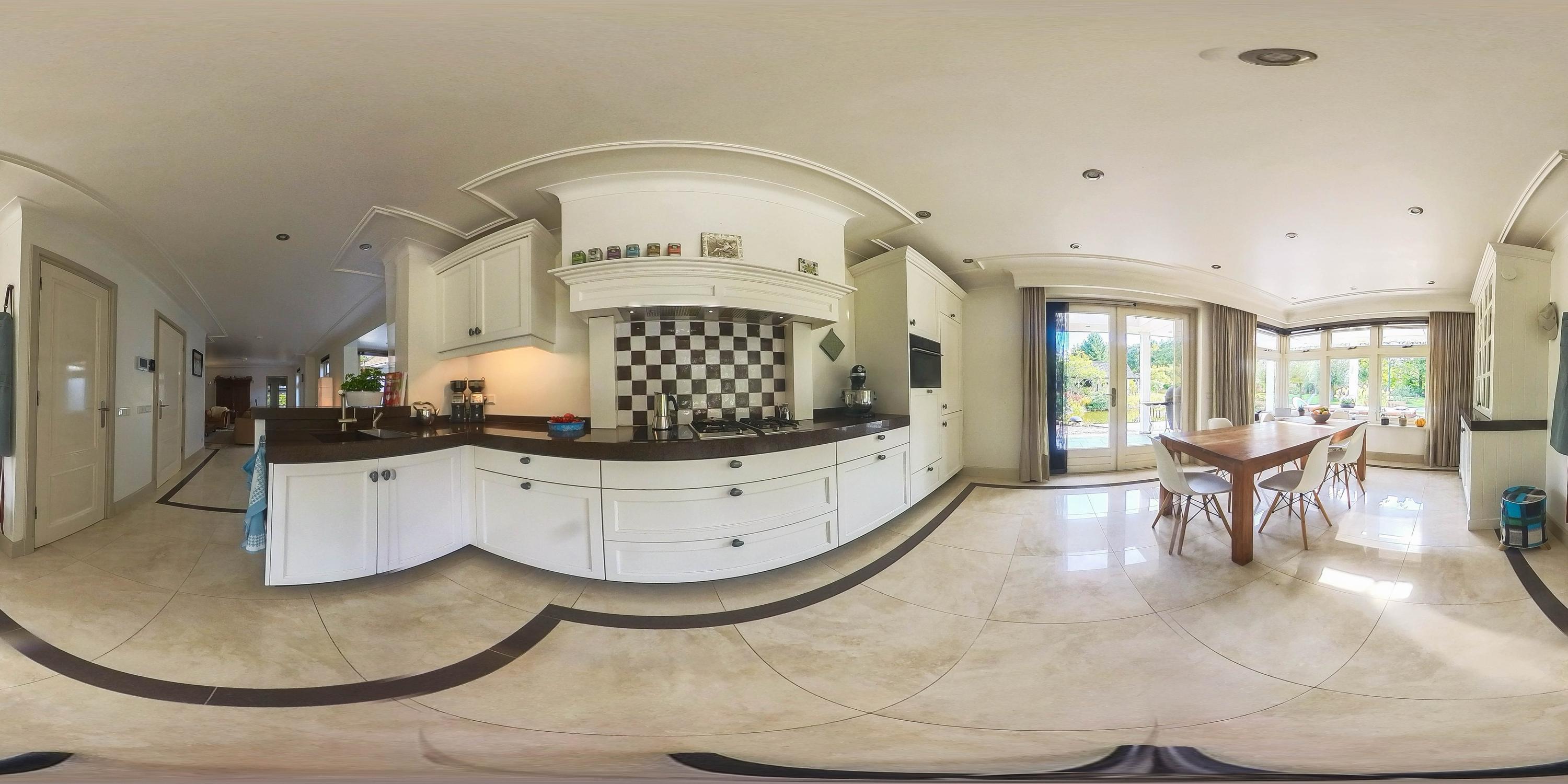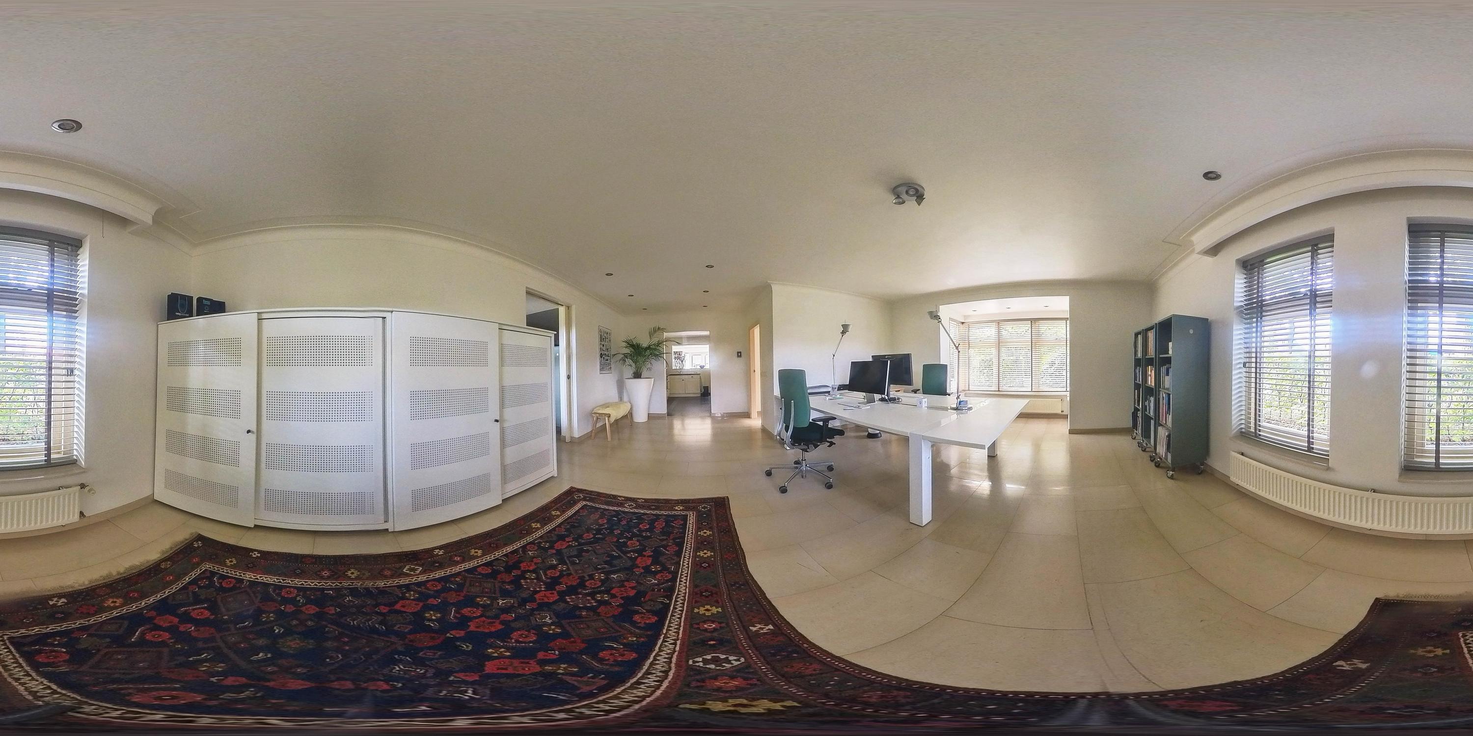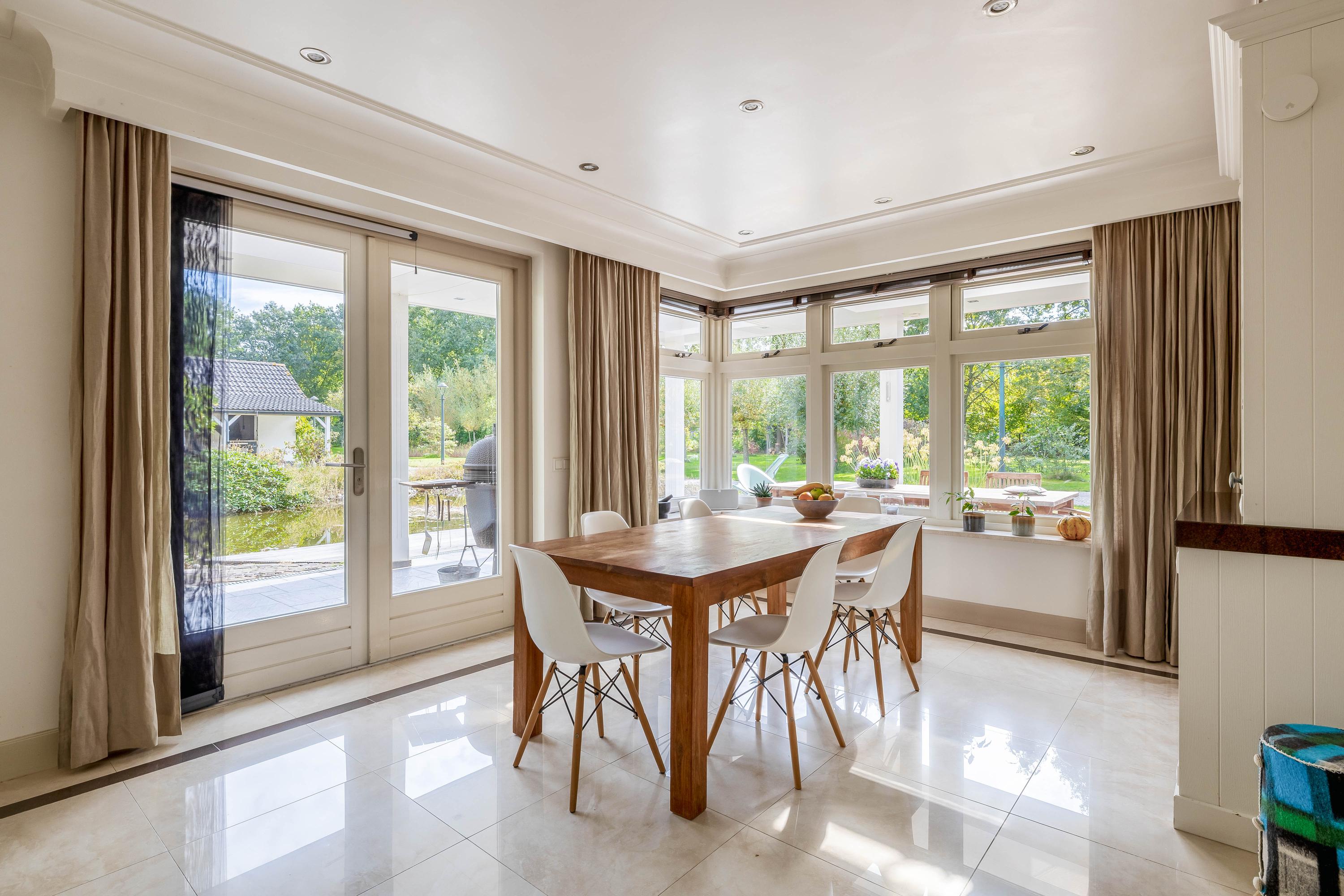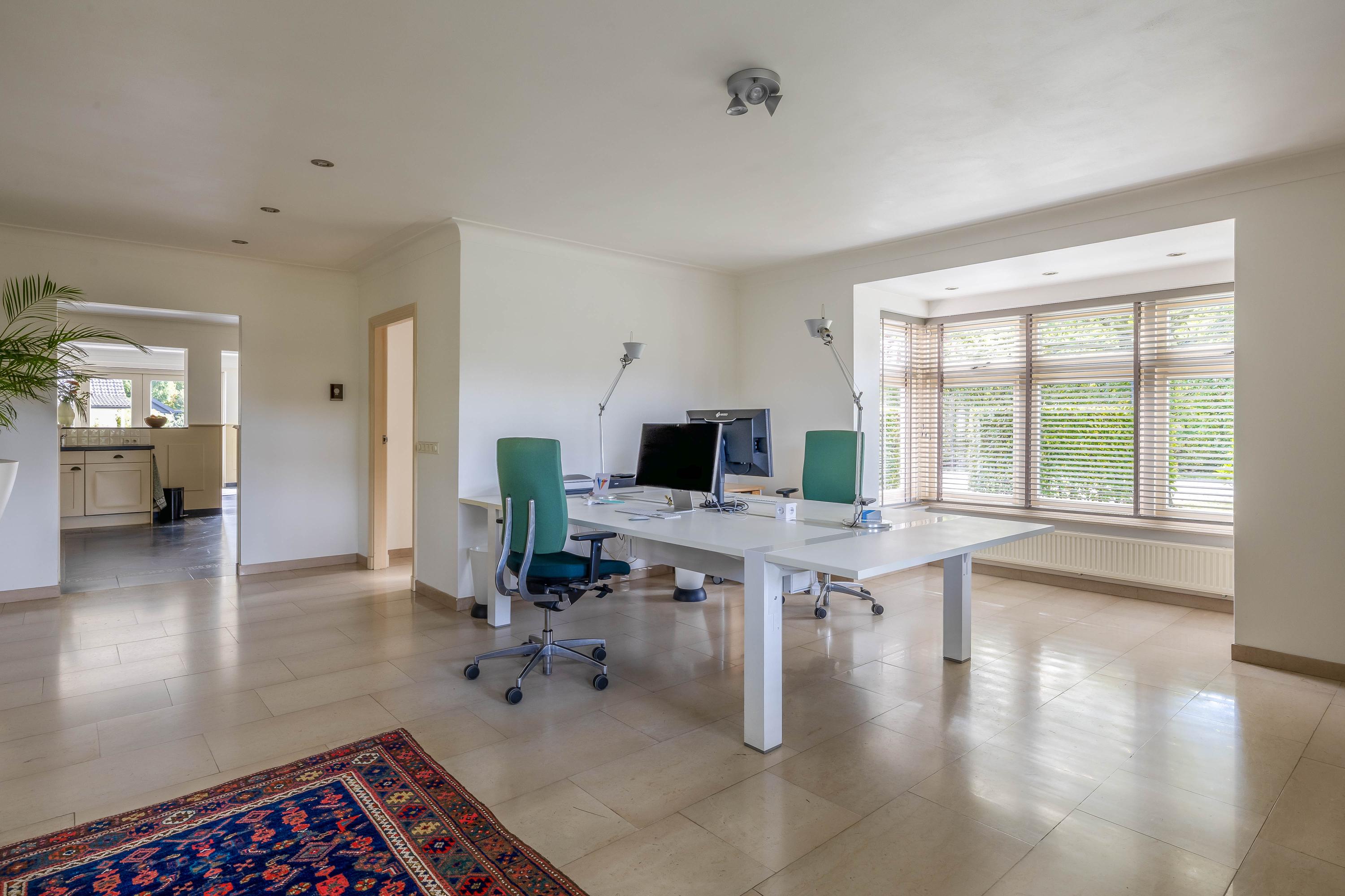 window provides access to the living room. The living room has a marble tiled floor with underfloor heating, stucco walls and a stucco ceiling with decorative mouldings. Thanks to the many windows and a large bay window, the room enjoys plenty of natural light, creating a spacious effect. Adjacent to the living room is a versatile space, ideal for an inspiring workspace or a cosy play area. The space can be closed off with a sliding door with stained glass. The kitchen has a corner layout and is equipped with a 5-burner gas hob, combination microwave/oven, sink, American fridge and dishwasher. Various base and wall cabinets provide storage space. There is enough space to place a dining table. The kitchen has a tiled floor with bis. The walls are partly finished with sleek stucco and partly with wooden panelling. The ceiling has stucco with decorative mouldings. The kitchen is open to the adjoining garden room. Here too, large windows provide a sea of light and a beautiful view of the surrounding garden. A wonderful place to relax! The walls are partly finished with sleek stucco and partly with wooden panelling. The ceiling is also finished with stucco and decorative mouldings. French doors provide access to the garden. There is also access to the utility room from here. The utility room is a practical space, equipped with a sink, a storage cupboard and a fixed cupboard wall with sliding doors. There is also a toilet. A door provides access to the garden. You can also reach the rear of the house from this room.