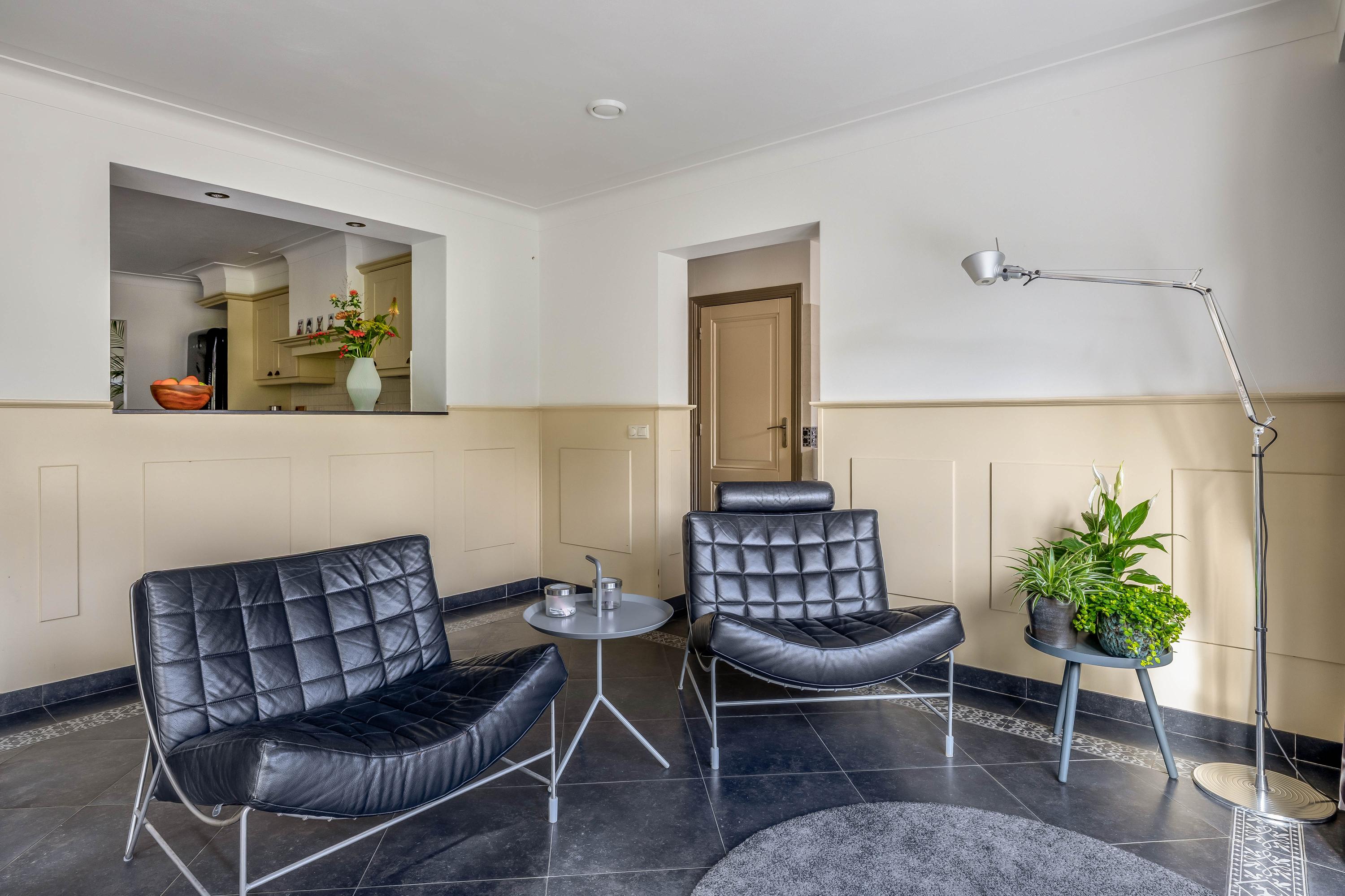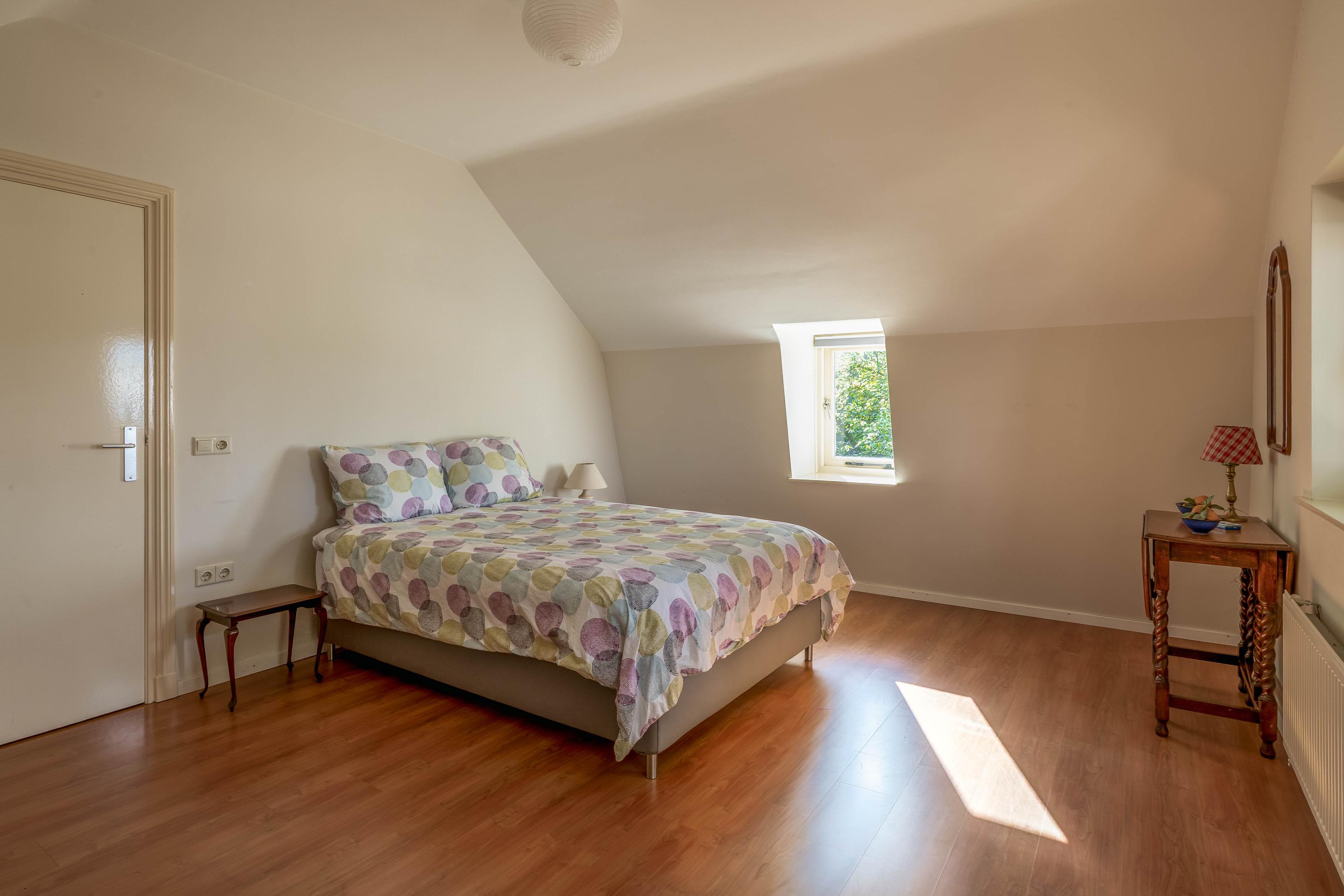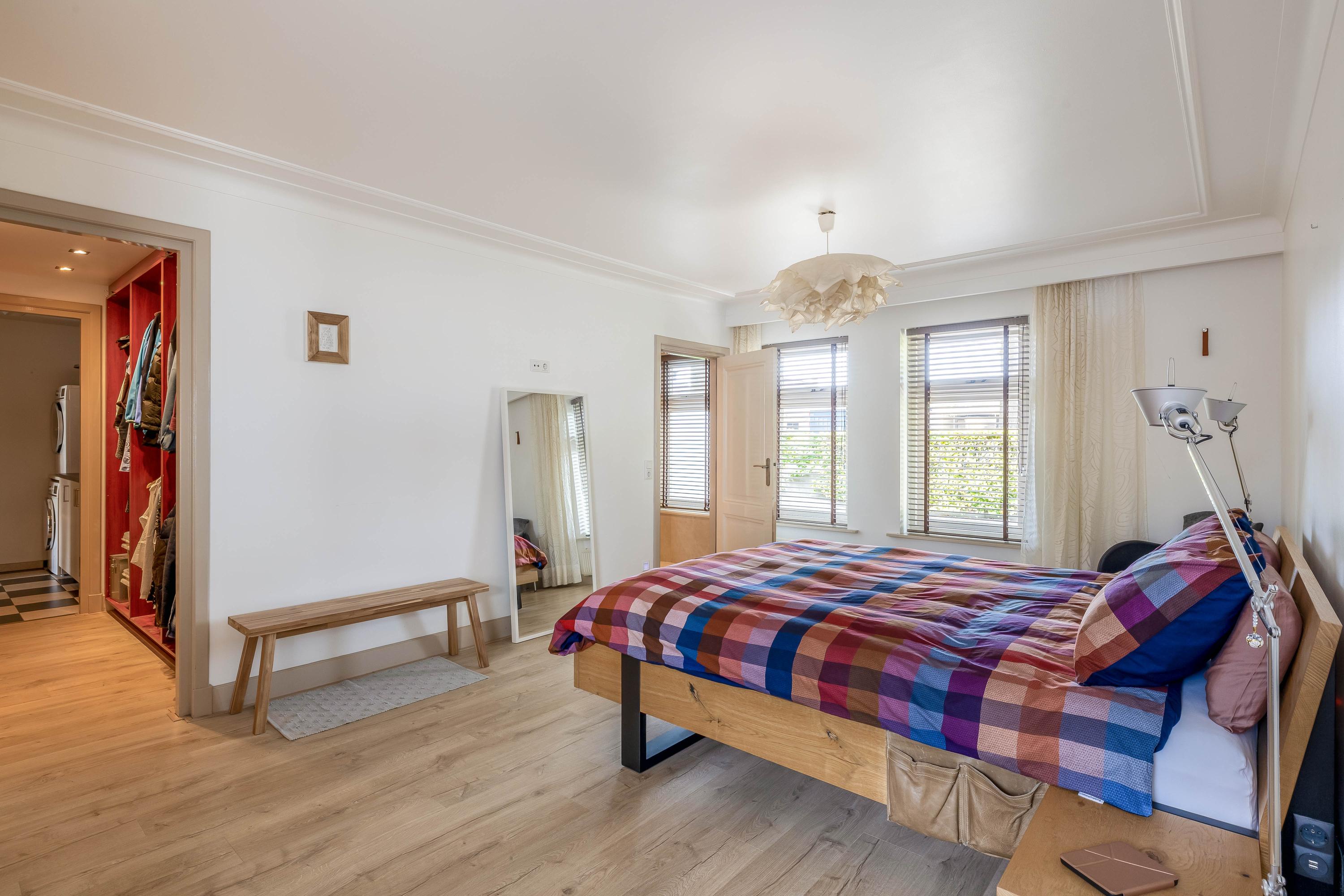 The toilet is fully tiled and equipped with a washbasin and wall-mounted toilet. The attractive living room is accentuated by high-quality ceramic tile flooring with bis and stucco, both on the walls and on the ceiling. The beautiful mouldings give the interior a classic look. The marble fireplace with gas fire provides extra warmth and atmosphere on colder days. A spacious bay window, currently furnished as a workspace, provides extra light in the room. The custom-made kitchen was designed by Hans Kwinten Interiors Projects. This high-quality kitchen is L-shaped and fully equipped with an advanced hob (with a wok burner, two gas burners and two induction burners) and a combi oven that also serves as a steam oven and microwave. In addition, you will find a dishwasher, freezer, refrigerator and a Quooker boiling water tap. French doors and various windows provide a beautiful view of the garden and direct access to the covered terrace and garden. The kitchen provides access to a spacious, man-sized storage cellar. The bedroom with en-suite bathroom and walk-in wardrobe is a delightful space. The floor is finished with laminate. The bathroom is fully tiled and equipped with a Whirlpool bathtub with light therapy, a double sink with a cabinet, a floating toilet and a walk-in shower with a seat. Various niches are an extra nice detail in the room. There is also underfloor heating in the bathroom. The walk-in closet with fixed cupboards and lighting offers optimal clothing storage. From the