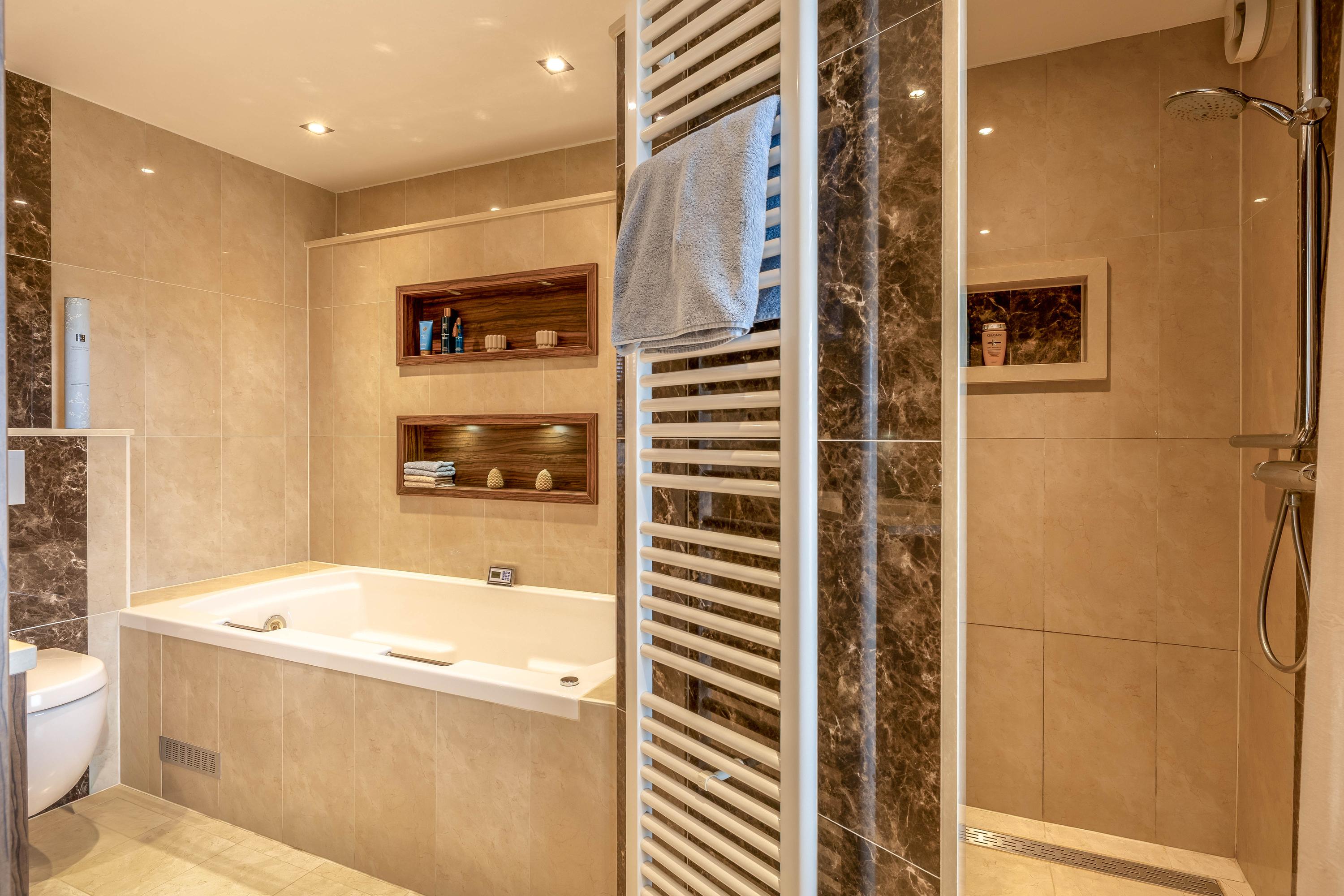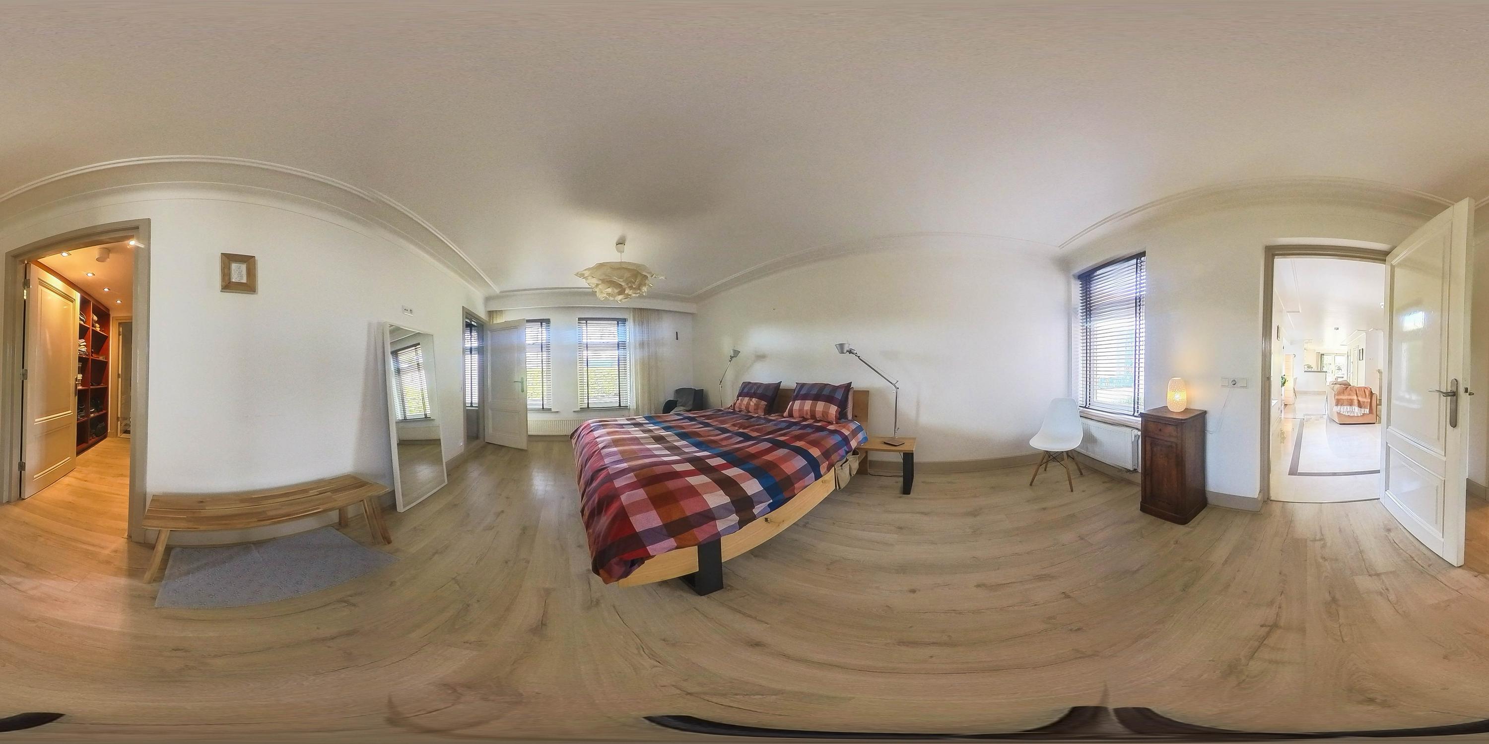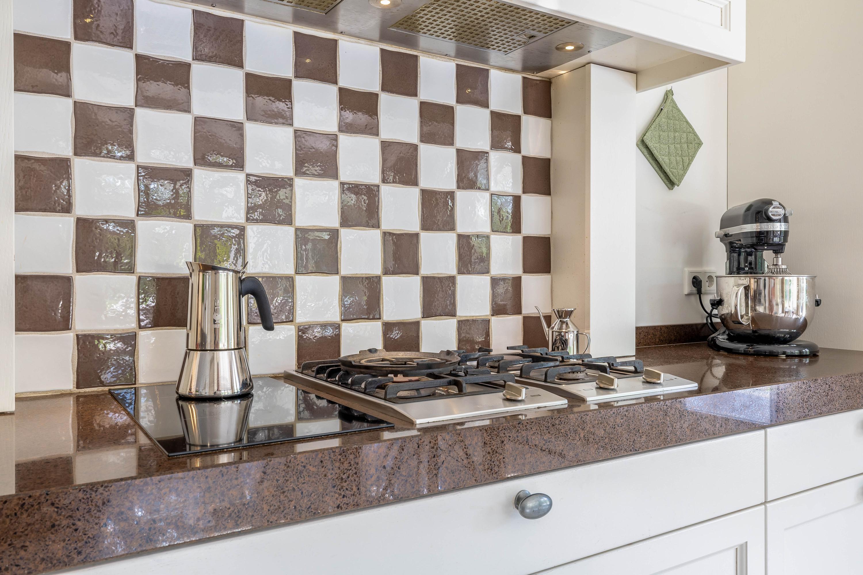 The toilet is fully tiled and equipped with a washbasin and wall-mounted toilet. The attractive living room is accentuated by high-quality ceramic tile flooring with bis and stucco, both on the walls and on the ceiling. The beautiful mouldings give the interior a classic look. The marble fireplace with gas fire provides extra warmth and atmosphere on colder days. A spacious bay window, currently furnished as a workspace, provides extra light in the room. The custom-made kitchen was designed by Hans Kwinten Interiors Projects. This high-quality kitchen is L-shaped and fully equipped with an advanced hob (with a wok burner, two gas burners and two induction burners) and a combi oven that also serves as a steam oven and microwave. In addition, you will find a dishwasher, freezer, refrigerator and a Quooker boiling water tap. French doors and various windows provide a beautiful view of the garden and direct access to the covered terrace and garden. The kitchen provides access to a spacious, man-sized storage cellar. The bedroom with en-suite bathroom and walk-in wardrobe is a delightful space. The floor is finished with laminate. The bathroom is fully tiled and equipped with a Whirlpool bathtub with light therapy, a double sink with a cabinet, a floating toilet and a walk-in shower with a seat. Various niches are an extra nice detail in the room. There is also underfloor heating in the bathroom. The walk-in closet with fixed cupboards and lighting offers optimal clothing storage. From the