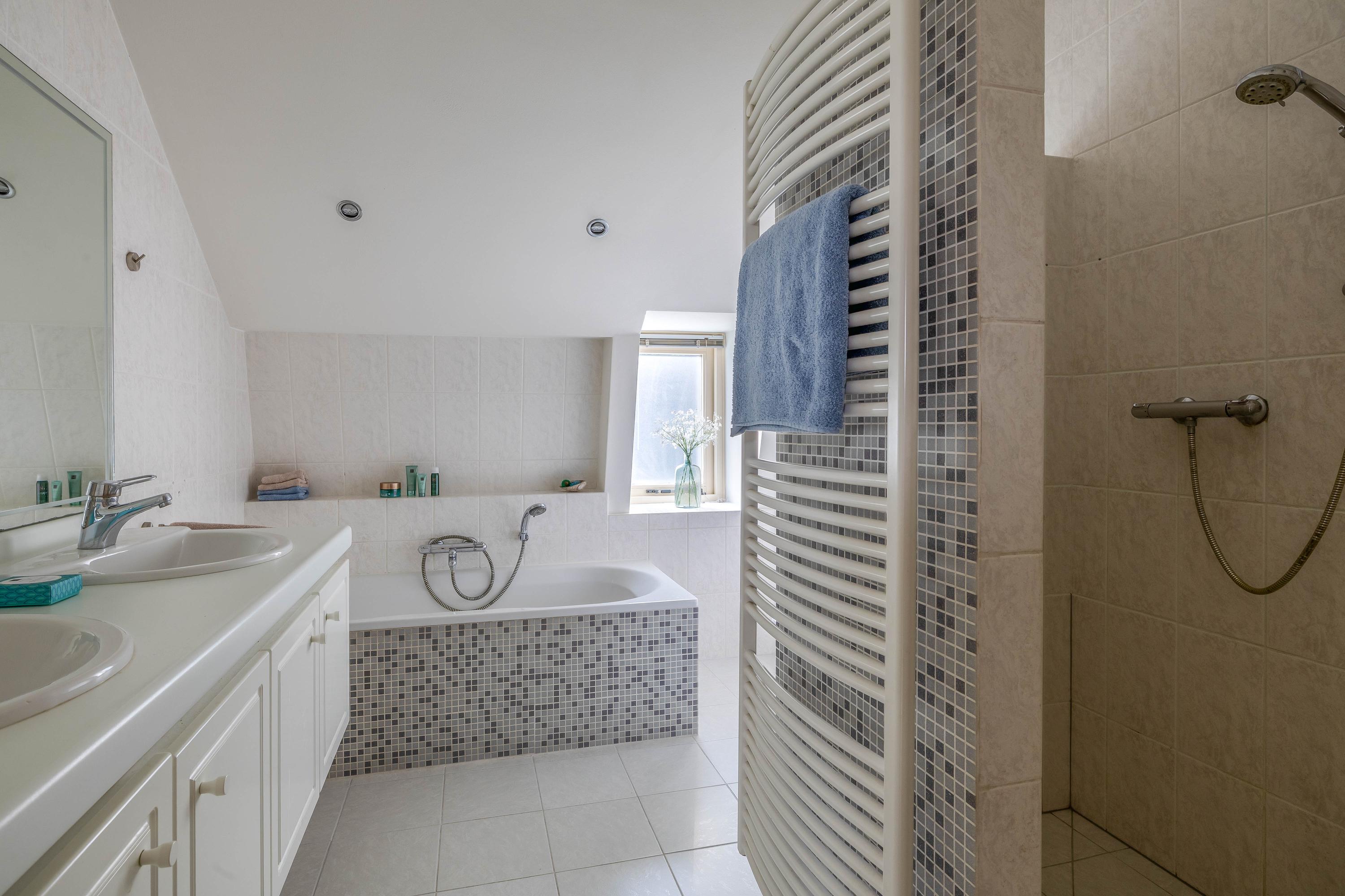 From the landing, you have access to two comfortable bedrooms, which are finished with laminate flooring and stucco walls and ceilings. A dormer window and two sets of windows provide natural light and ventilation. The second bathroom is also fully tiled and equipped with a walk-in shower, a washbasin and a floating toilet. A skylight provides sufficient natural light and fresh air. The practical central heating room/storage room has the central heating boiler (Nefit, Topline).