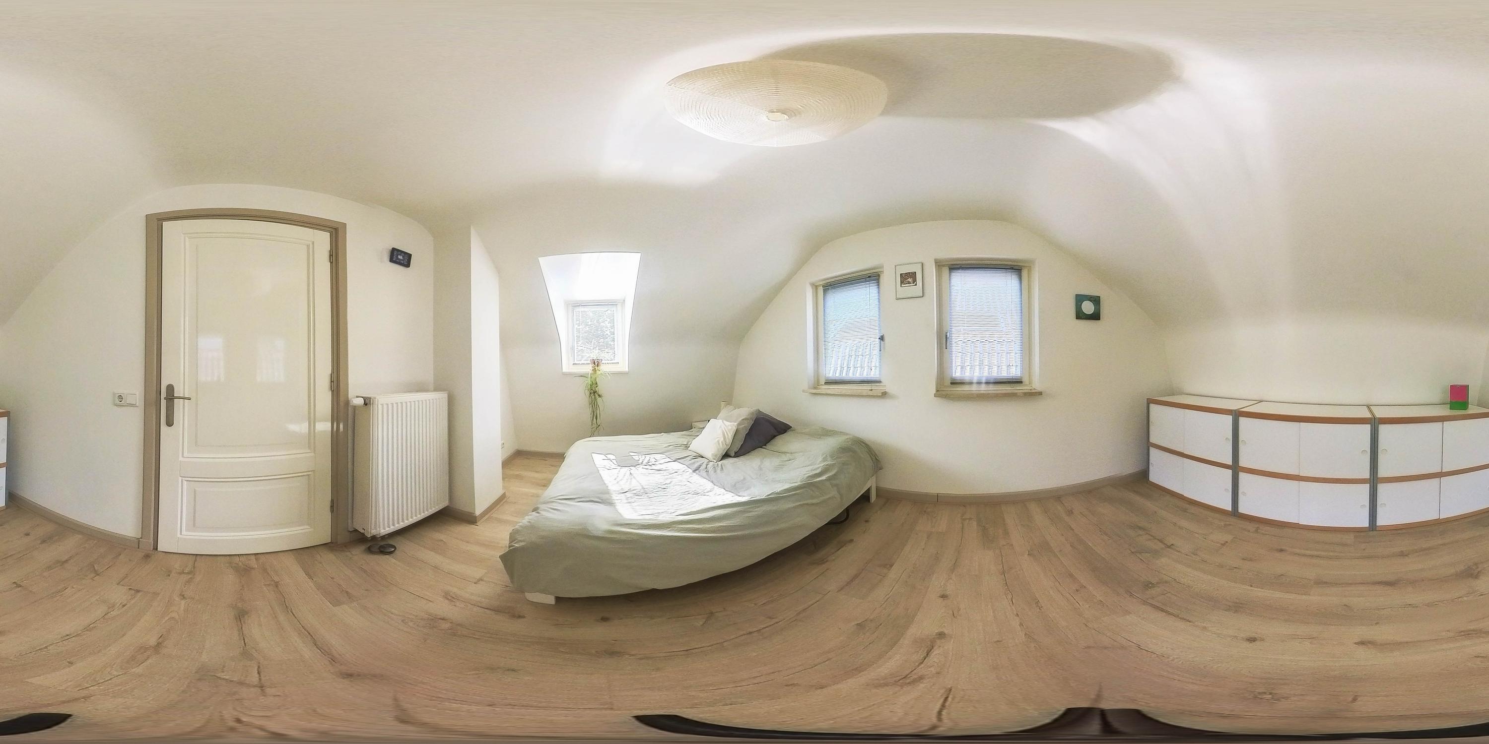 the same finish: laminate flooring, stucco walls and a stucco ceiling. The bedroom on the right has French doors that provide access to the flat roof. From here you have a beautiful view of the garden. The largest bedroom is currently furnished as a hobby room and has a walk-in wardrobe, storage room and a central heating