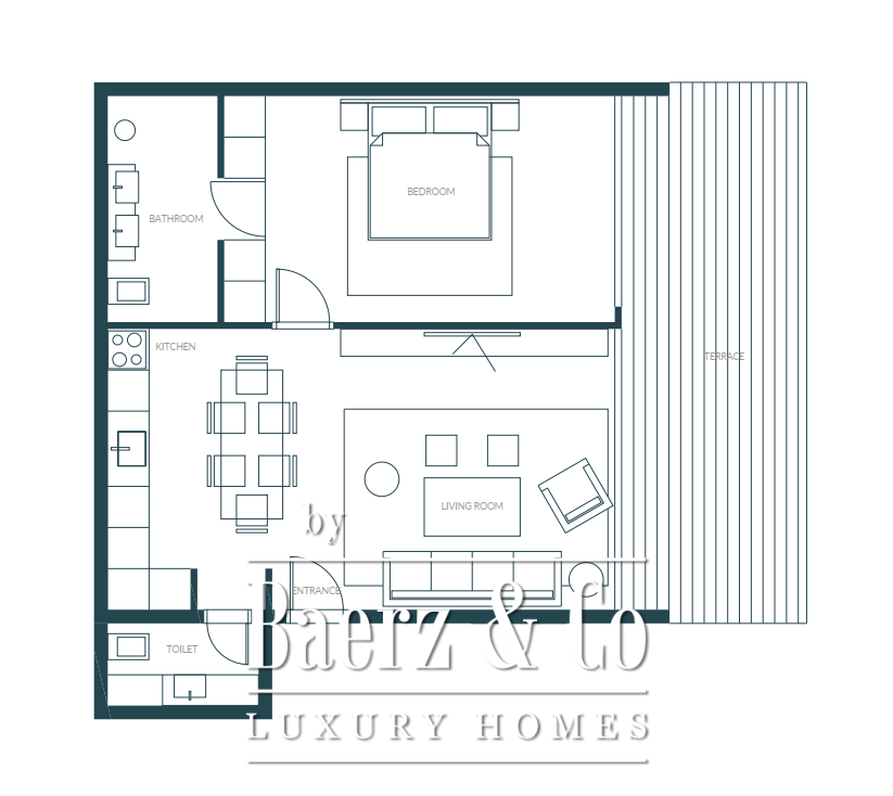 Structure of the apartment: living room with kitchen and dining table, a bedroom, a bathroom, a toilet and a terrace. It has a sea view and the view of the mountains that surround it. It will be delivered with finished floors, finished tiles, equipped bathroom and equipped air conditioning.