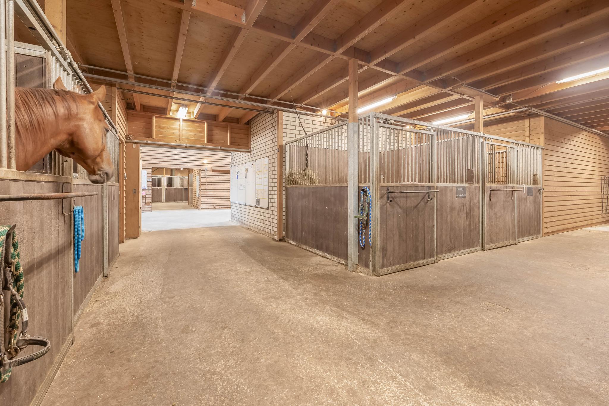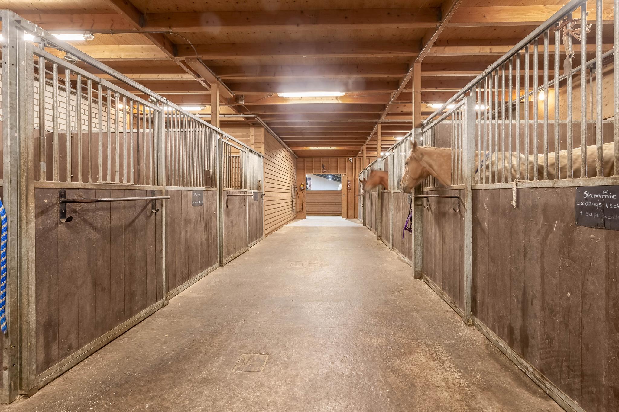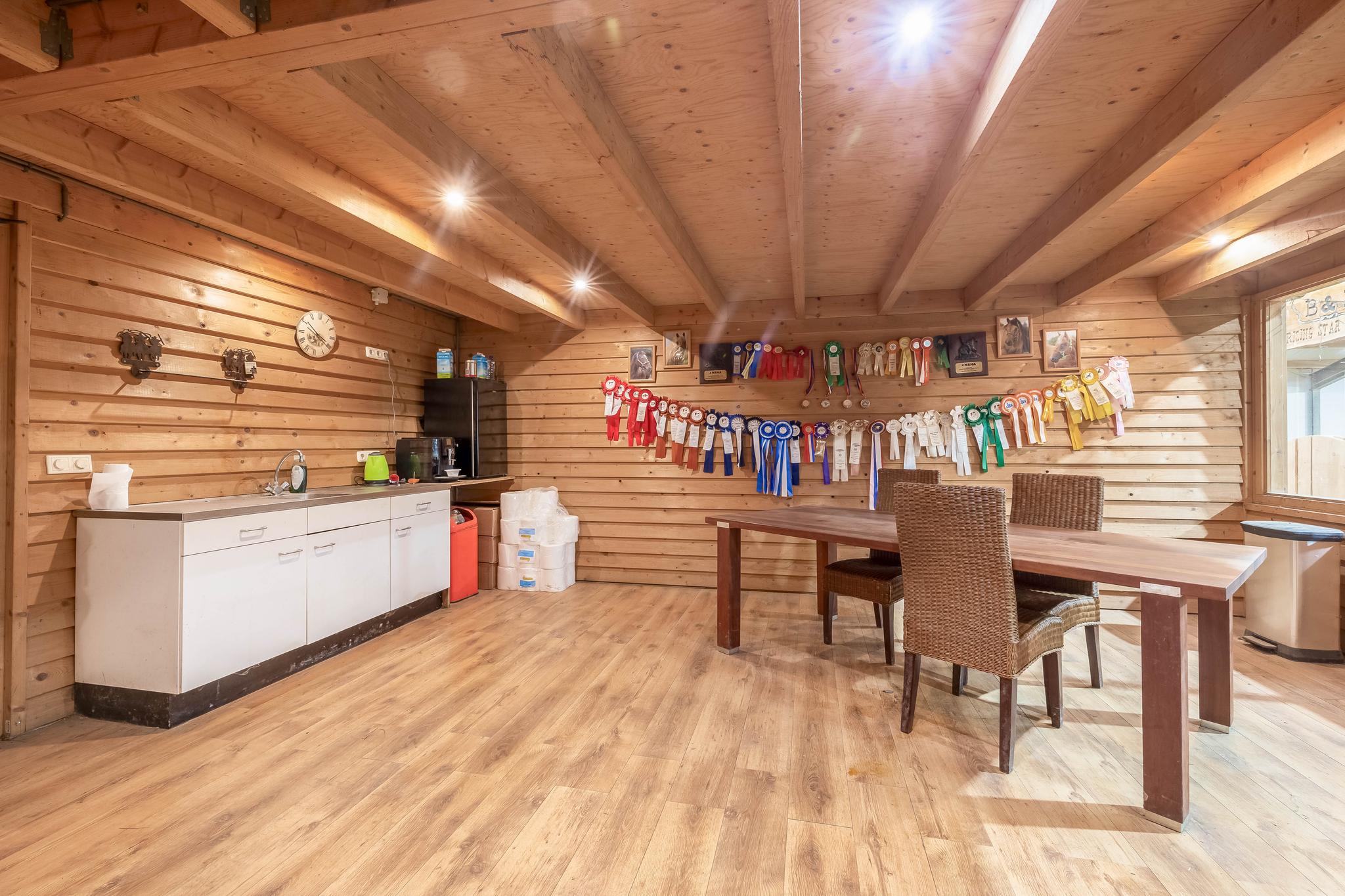 The accommodation currently has 16 horse stalls, divided over 2 stable units (7 and 9 stalls). These spacious stalls have partially galvanised, partially plastic front walls with sliding doors and a rubber tile floor. Some of the stalls have an outside hatch. The wooden finish in the canteen/reception area creates a pleasant atmosphere. A large window offers a direct view of the indoor arena. There is also a kitchen unit with a sink and storage space.