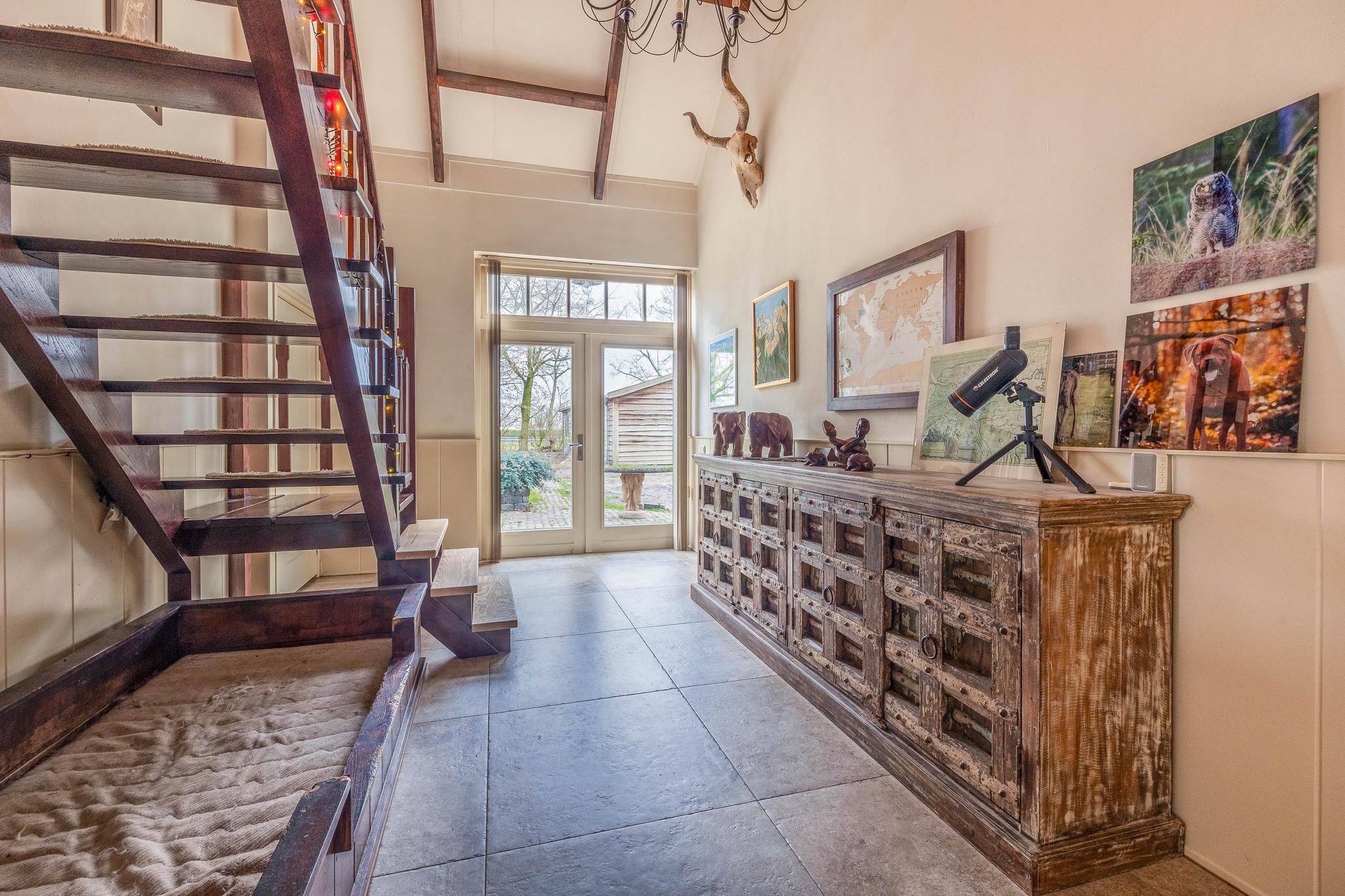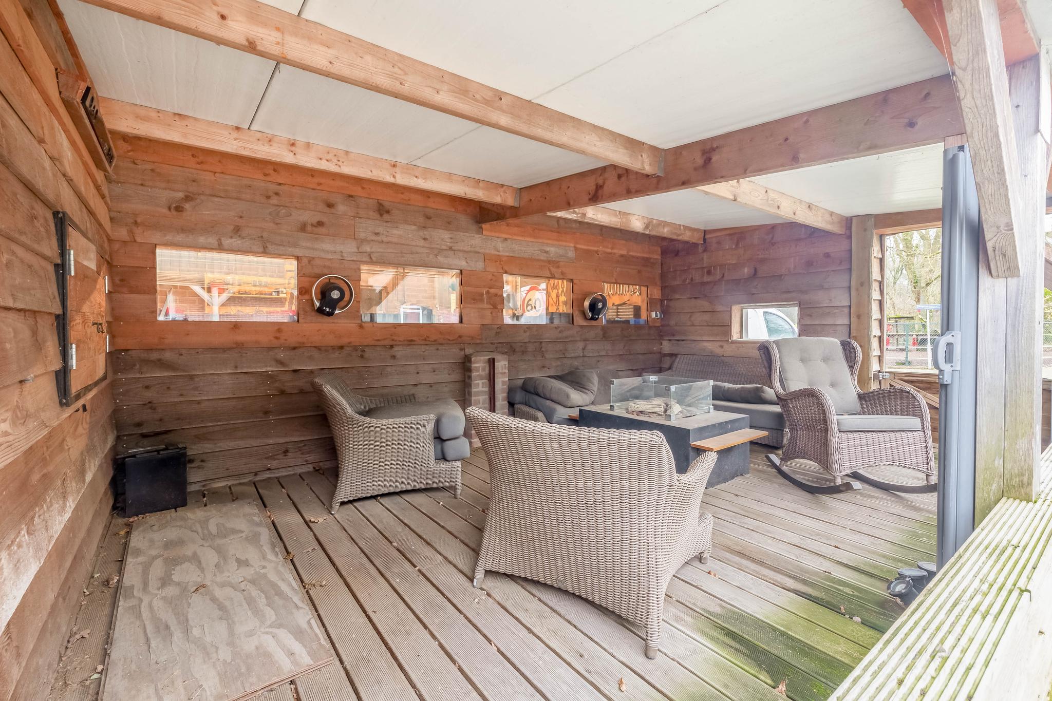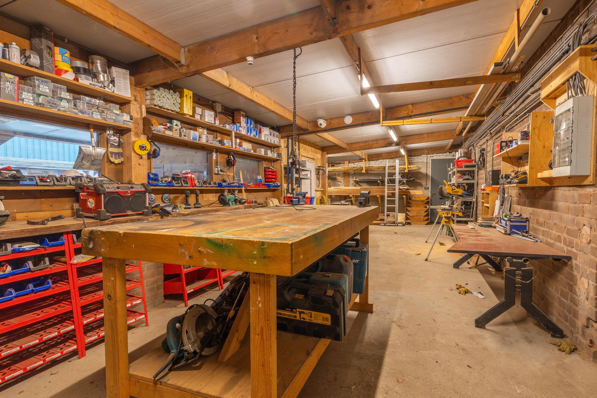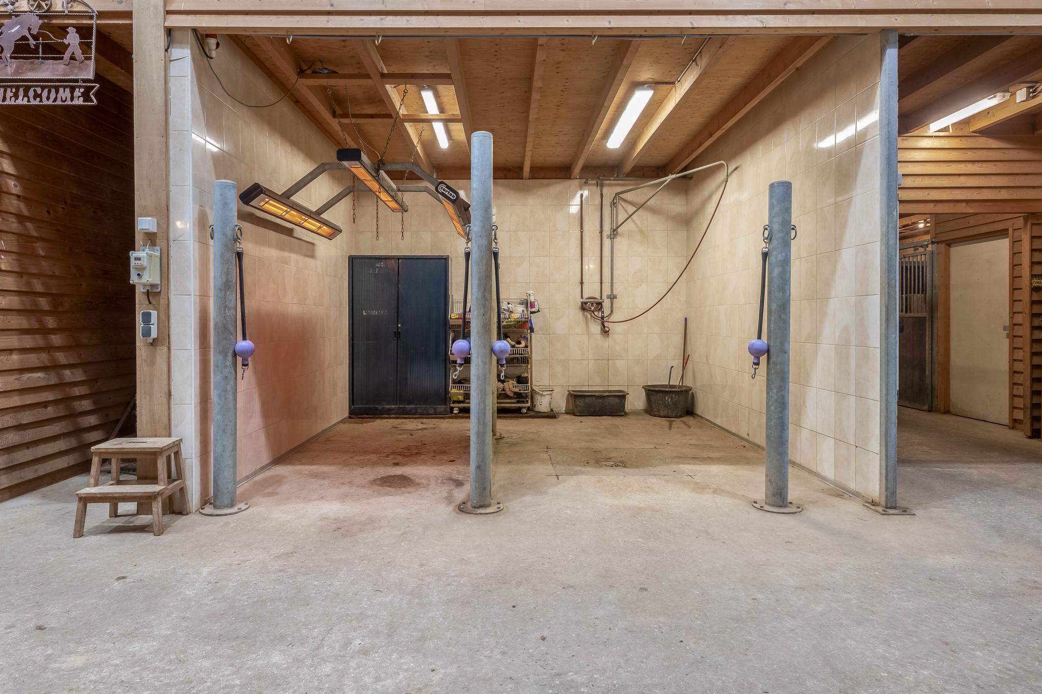 The detached roofed barn with workshop and storage space offers extra flexibility for maintenance and material storage. The four quarantine stables at the rear provide extra safety and control. The cosy covered terrace is a nice place to rest after a hard day's work. The workshop has a concrete floor, panelled walls and an insulated roof. French doors and a wicket door provide access to the yard. The adjacent storage space has a concrete floor, brick walls and an insulated roof. French doors also provide access to the yard from this space. This outbuilding also has a laundry room and an extra storage room. At the rear are four quarantine stalls, and the open front allows the stalls to be clearly seen from the farmhouse. The covered terrace has a wooden floor and walls finished in wood. It offers a beautiful view of the equestrian accommodation, the paddocks and the yard.