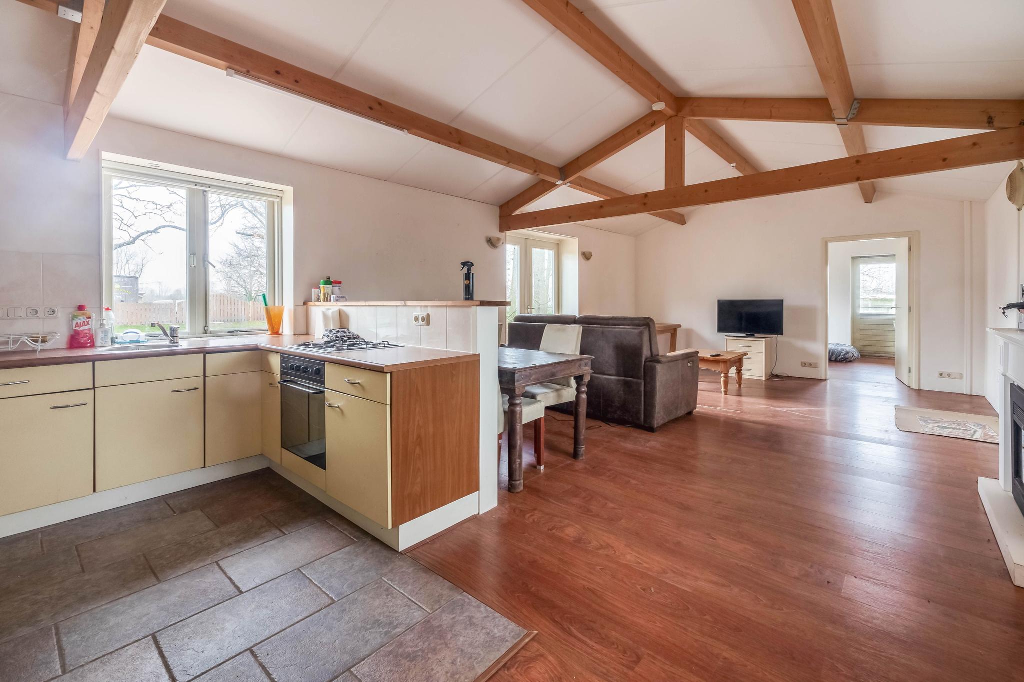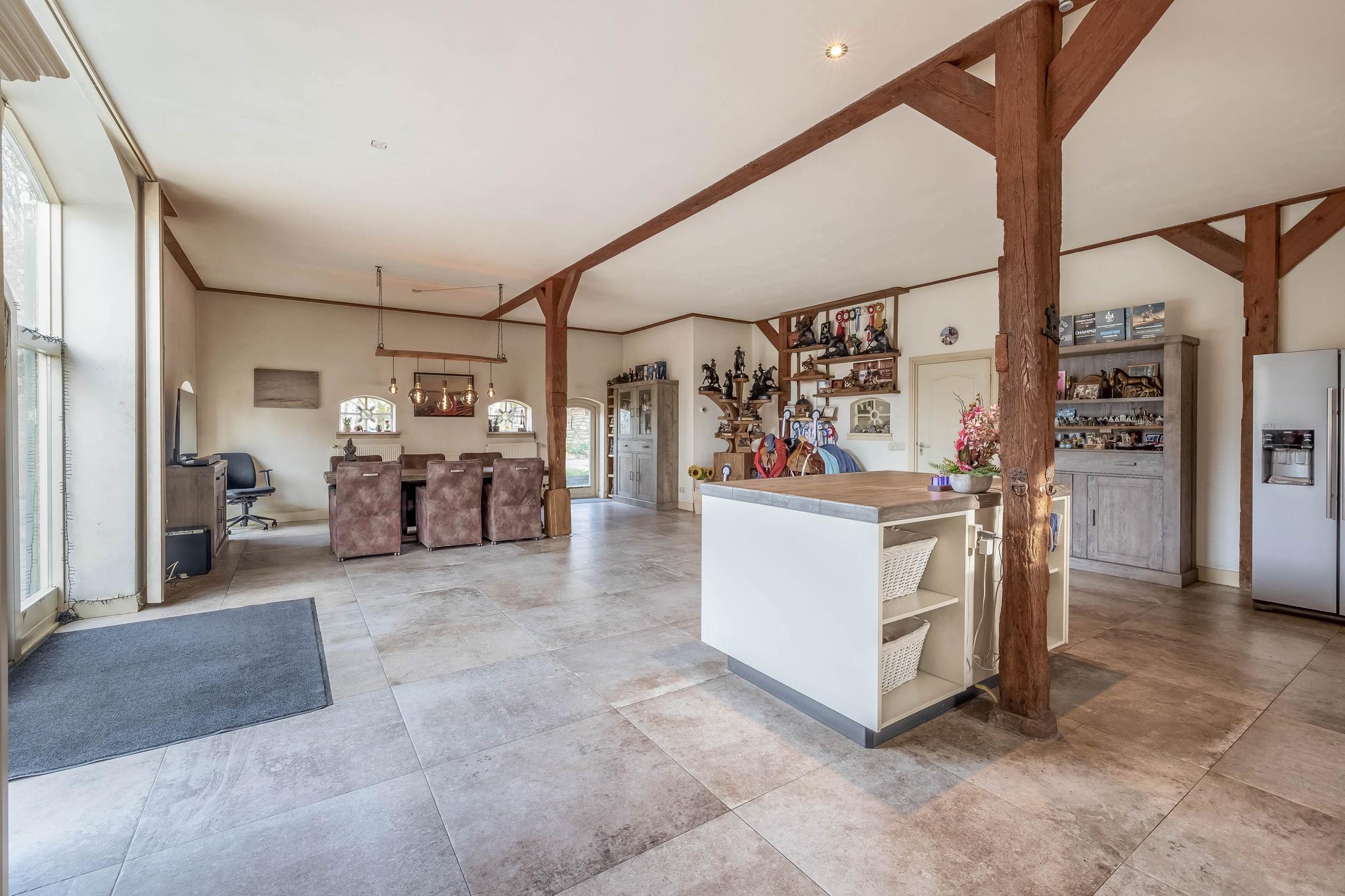 The entrance hall has a tiled floor and the stucco walls are finished with wooden panelling. A staircase with a landing provides access to the first floor from the hall. The partly tiled toilet is also located in the hall. A spacious kitchen diner forms the heart of the farmhouse, the place where everyone gathers to eat or spend time together. The kitchen has a tiled floor with underfloor heating and stucco walls. The farmhouse's attractive wooden trusses are clearly visible in this pleasant living space. Air conditioning provides additional cooling and heating in the summer and winter months. The spacious kitchen is equipped with a double sink, a 5-burner gas stove with an oven, a refrigerator, a dishwasher and a combination microwave. The entrance hall has a tiled floor and the stucco walls are finished with wood panelling. A staircase with a landing provides access to the first floor from the hall. The partially tiled toilet is also located in the hall. A spacious kitchen forms the heart of the farmhouse, the place where everyone gathers to eat or spend time together. The kitchen has a tiled floor with underfloor heating and stucco walls. The farmhouse's attractive wooden trusses are clearly visible in this pleasant living space. Air conditioning provides additional cooling and heating in the summer and winter months. The spacious kitchen is equipped with a double sink, a 5-burner gas stove with an oven, a refrigerator, a dishwasher and a combination microwave.