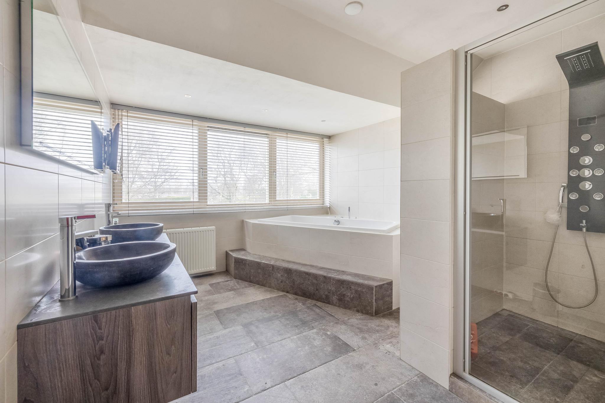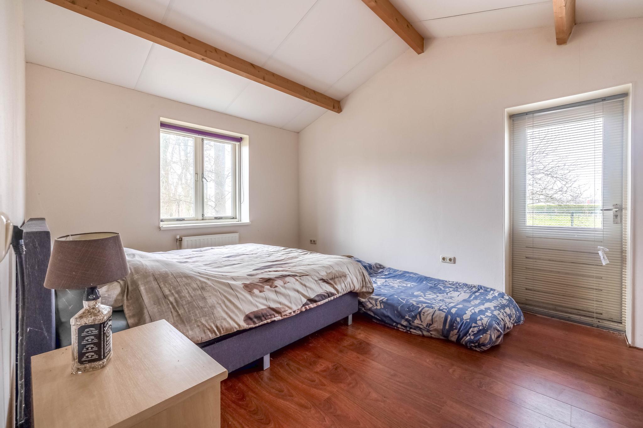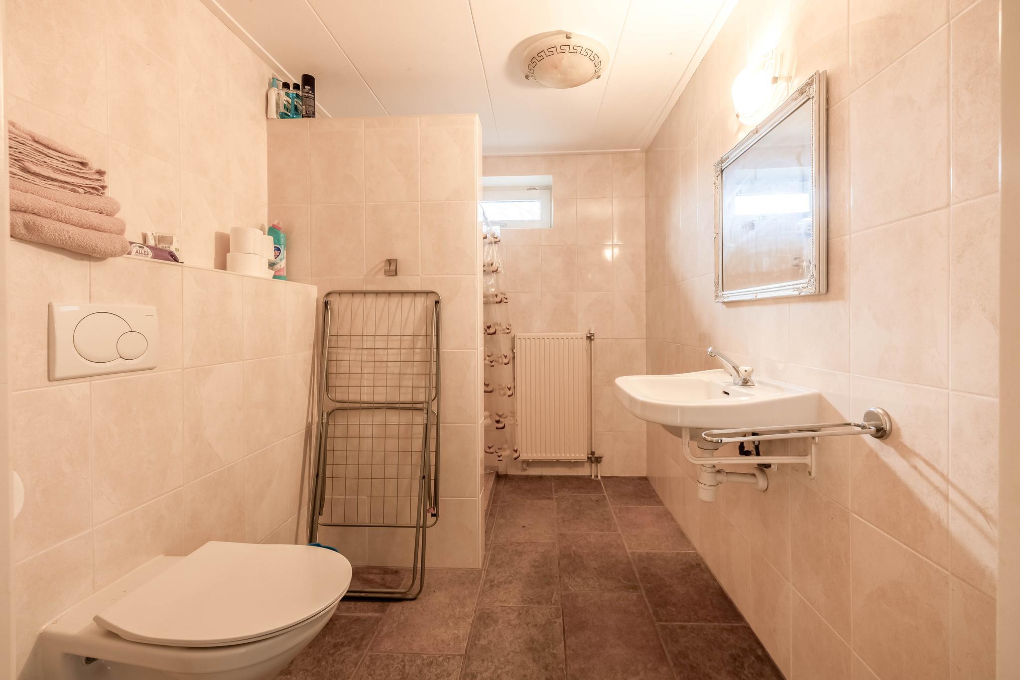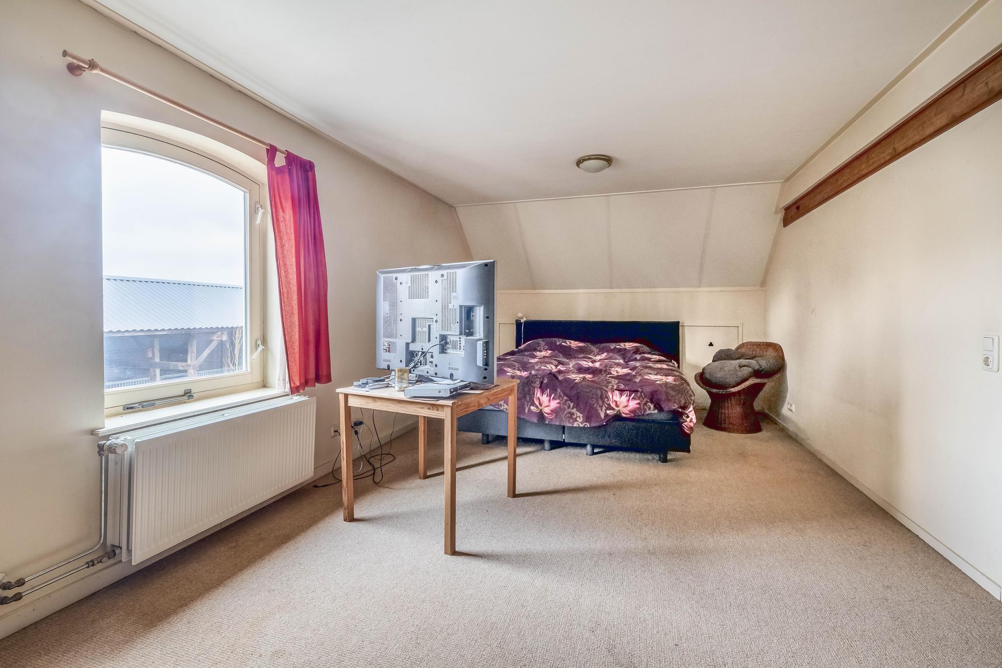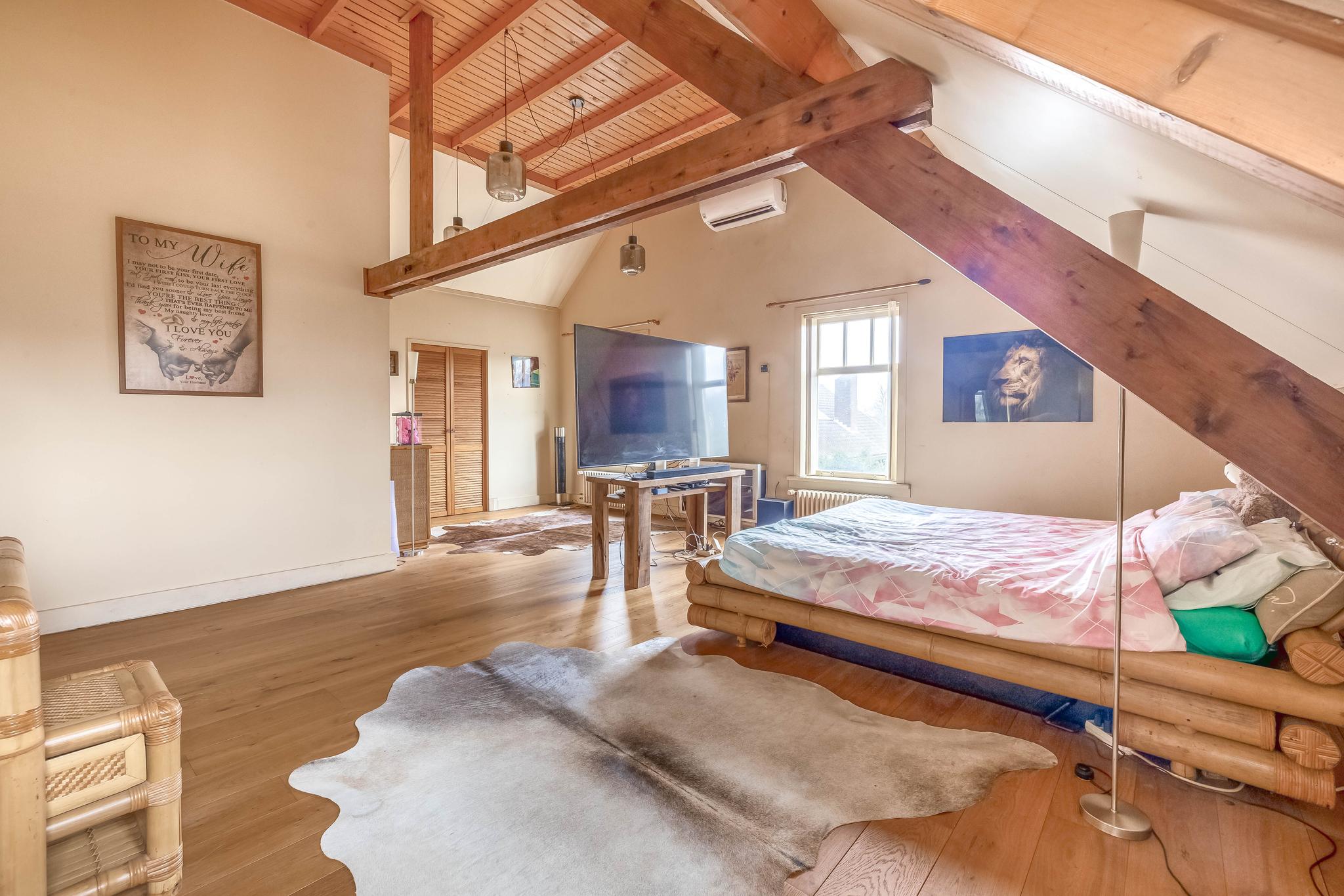 Four bedrooms have carpeted floors, stucco walls and stucco ceilings. Extra storage space has been created under the sloping roof. One of the rooms has a staircase providing access to the attic on the second floor. The fully tiled bathroom is equipped with a bathtub with water jets and a small television, a sun shower and a double washbasin with a storage unit. A dormer window provides plenty of natural light and ventilation. The bathroom is heated by electric underfloor heating. The fifth bedroom has a wooden floor and stucco walls. The beautiful wooden trusses of the farm are also clearly visible in this room. Two built-in cupboards provide extra storage space and air conditioning provides the necessary cooling and heating.