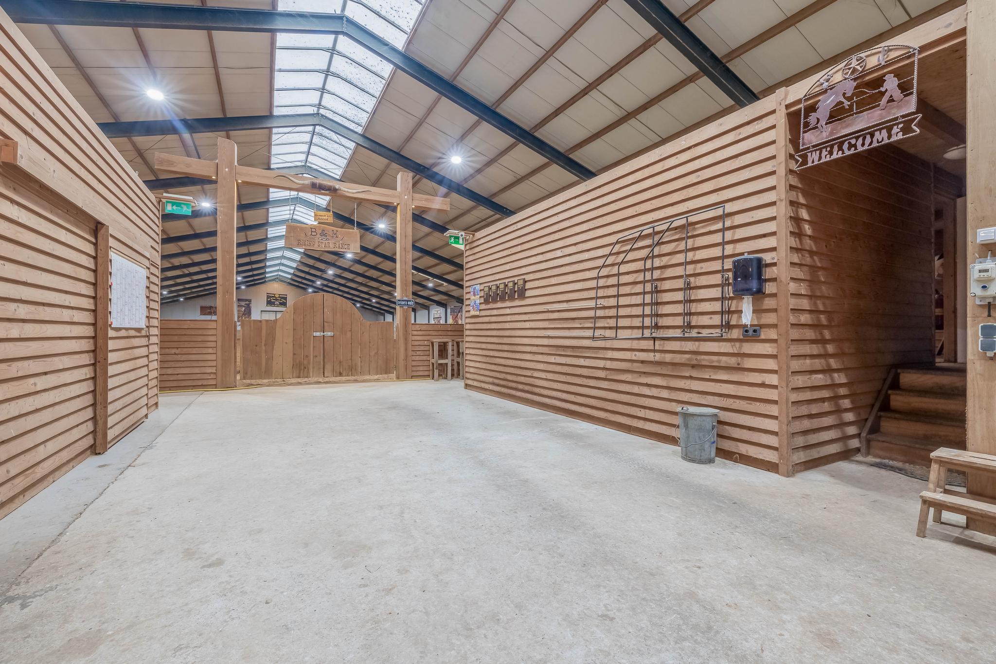 The outdoor area is fully equipped to meet the requirements of a professional western rider. With a lunging circle, various loose boxes, a hay barn and spacious paddocks, your horses have all the space they need to perform optimally and recover. The hay barn is equipped with fire protection and has a paved floor, clapboard siding and a sheet-pile roof. A separate room has been created at the back of the riding hall, which is ideal for placing an aquatrainer (the existing aquatrainer can be taken over). The electrically heated space is accessible from the yard through two rolling doors and has its own meter cupboard. The lunging circle/round pen is fenced off with wood and has a sand base. The paddocks have a sand or grass base and a wire mesh fence. There are various loose boxes, which are made of wooden façades and the roof is covered with roof tile-patterned panels.