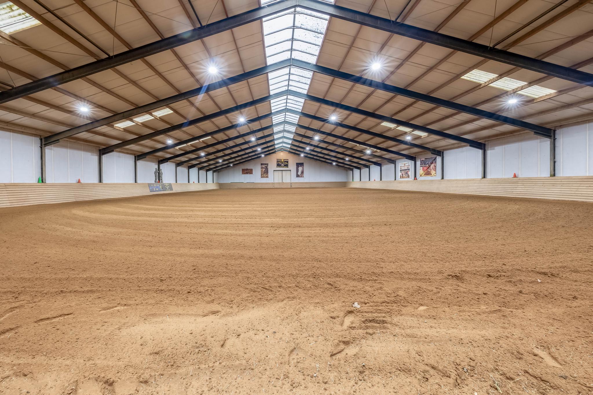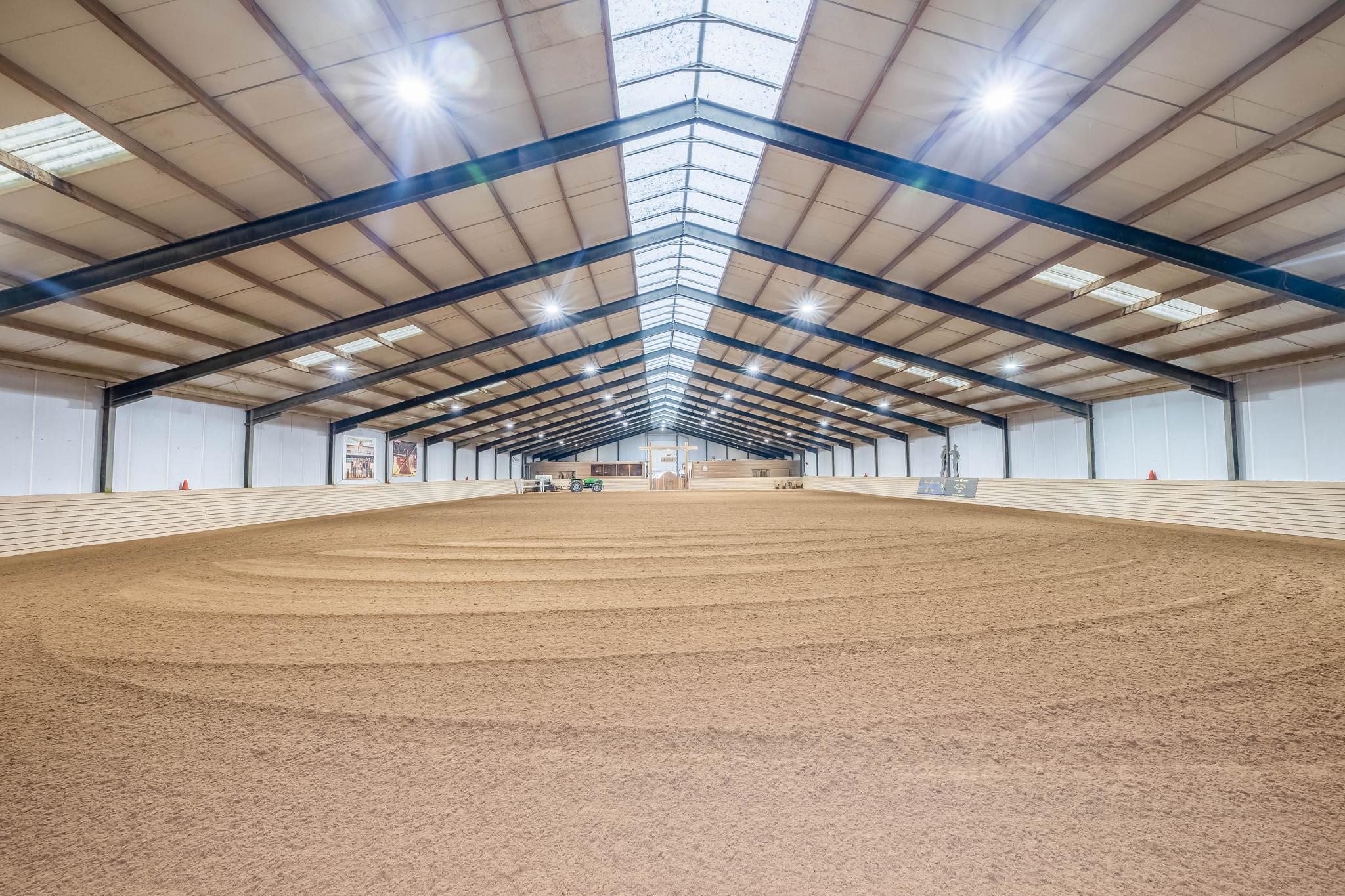 The indoor arena (approx. 30x60 metres) has a reining surface and is surrounded by a wooden border. The hall is constructed with steel trusses and the walls and roof are made of insulated sandwich panels. A skylight has been installed in the ridge of the roof. The yard can be reached from the inner ring via sliding doors in the rear and side walls. There is one heated tack room and one heated rug room with ample storage space. The wash area with solarium offers space for 2 horses and has hot and cold running water. The practical feeding area has a concrete floor, brickwork and wood-panelled walls and a wooden beamed ceiling.