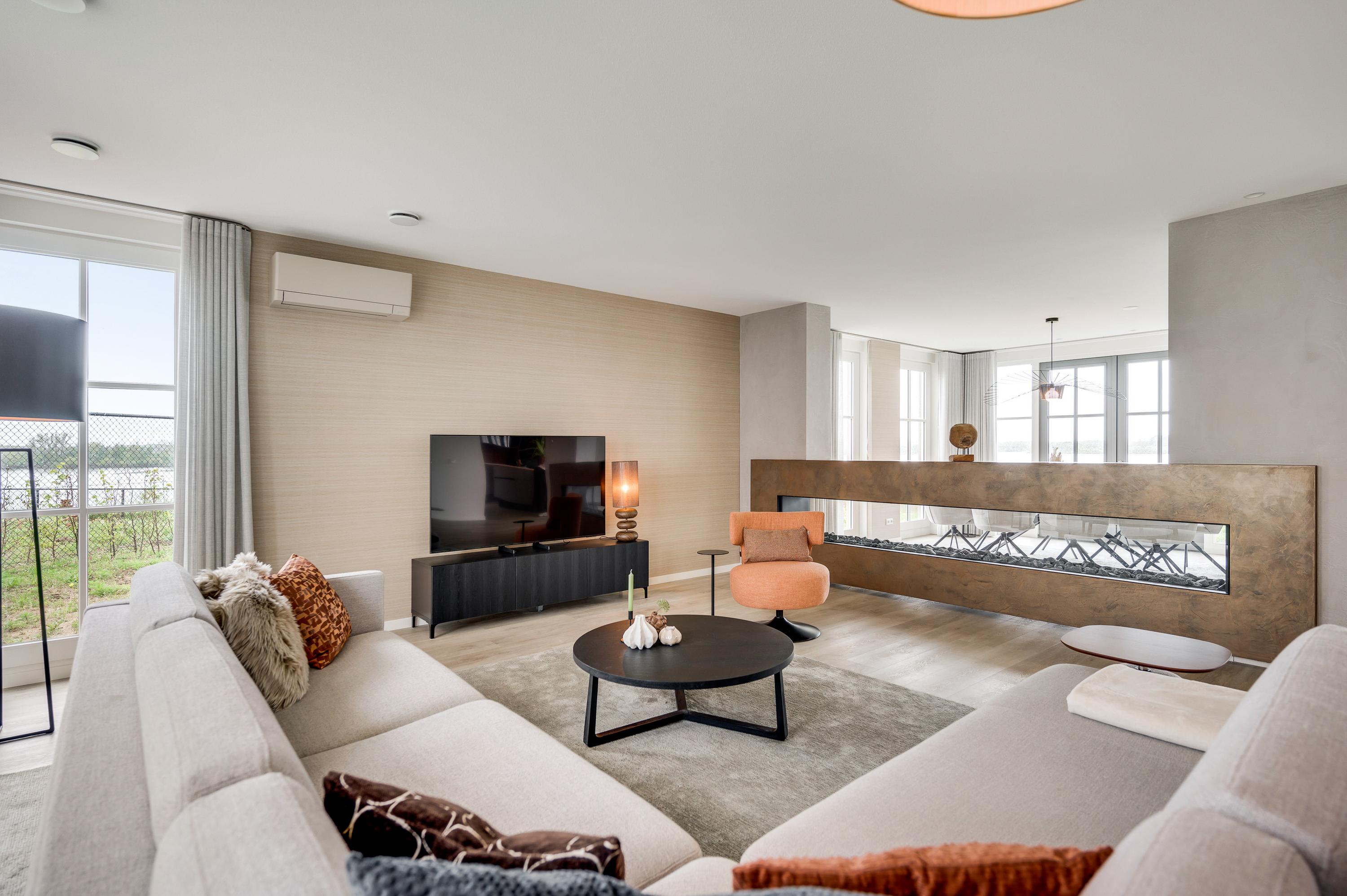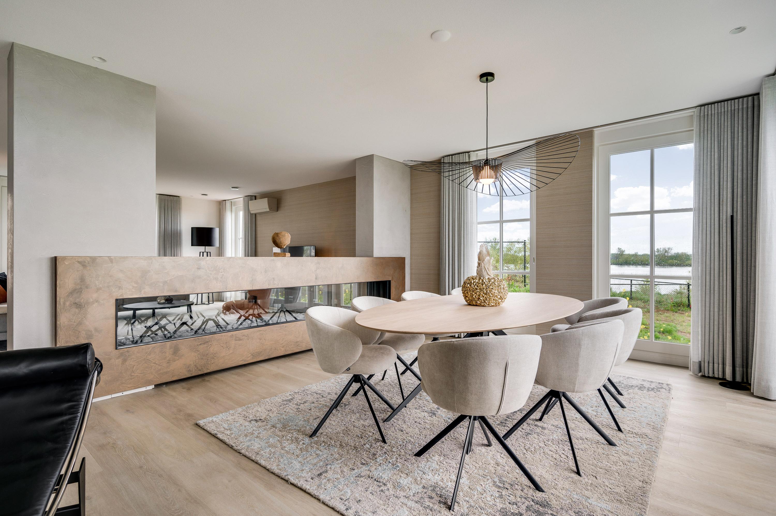 The eye-catcher in this room is the spacious gas fireplace, which serves in a luxurious way as a room divider between the living room and the dining room.