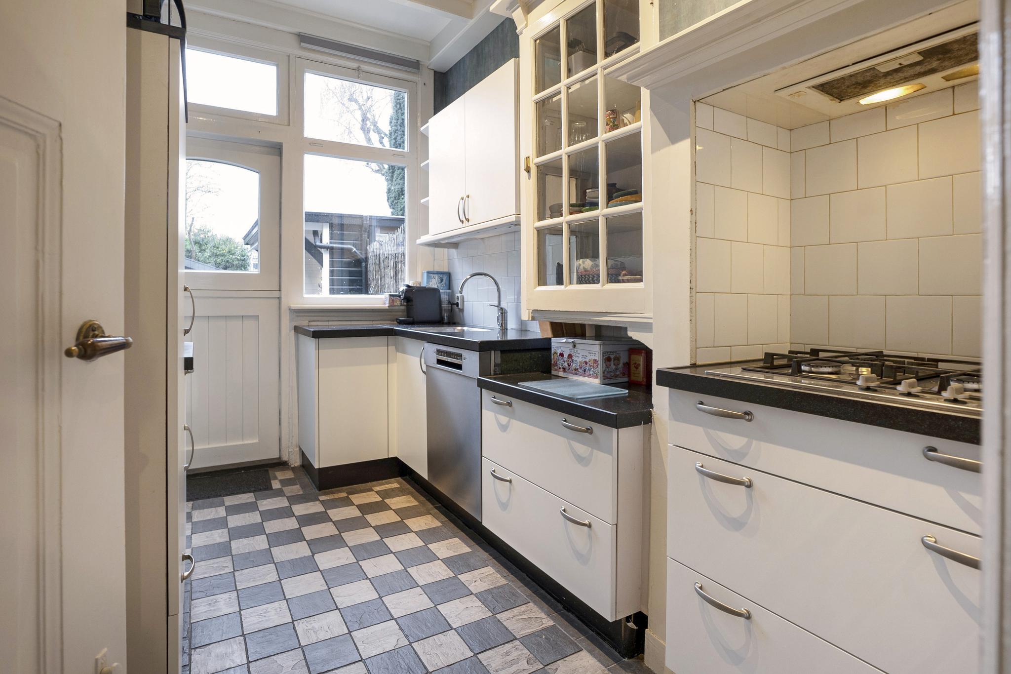 Through the vestibule, which features an original marble floor, you enter the hall with a tiled floor that extends into the kitchen. The kitchen has been updated with new cupboard doors and a stove, combined with a glass cabinet. It is equipped with a dishwasher (2023), a four-burner gas hob, a refrigerator, and a natural stone countertop. From the hall, you can access the toilet, the under-stair cupboard, and a spacious cellar (with sufficient headroom), which houses the central heating boiler and connections for a washing machine and dryer. The living room with en-suite doors, featuring oak plank flooring and a gas fireplace, is also accessible from the hall. The conservatory, designed in an authentic style, has French doors that open onto the back garden, which is also accessible from the kitchen.