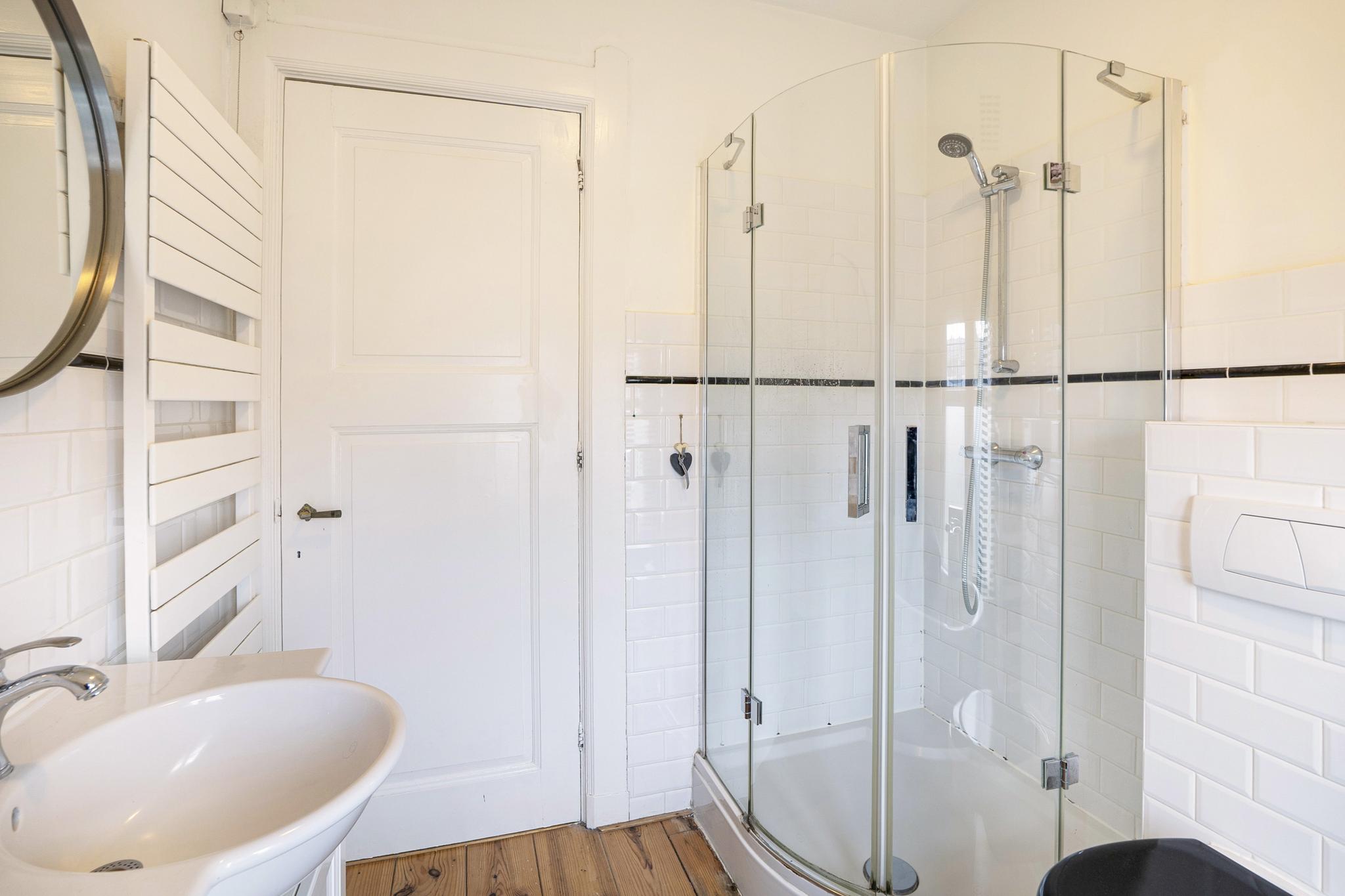The staircase with a landing leads to the first floor. Here you will find one smaller and two larger bedrooms, one of which has a balcony. The bathroom includes a shower, a second toilet, and a free-standing clawfoot bath. All bedrooms feature built-in wardrobes.