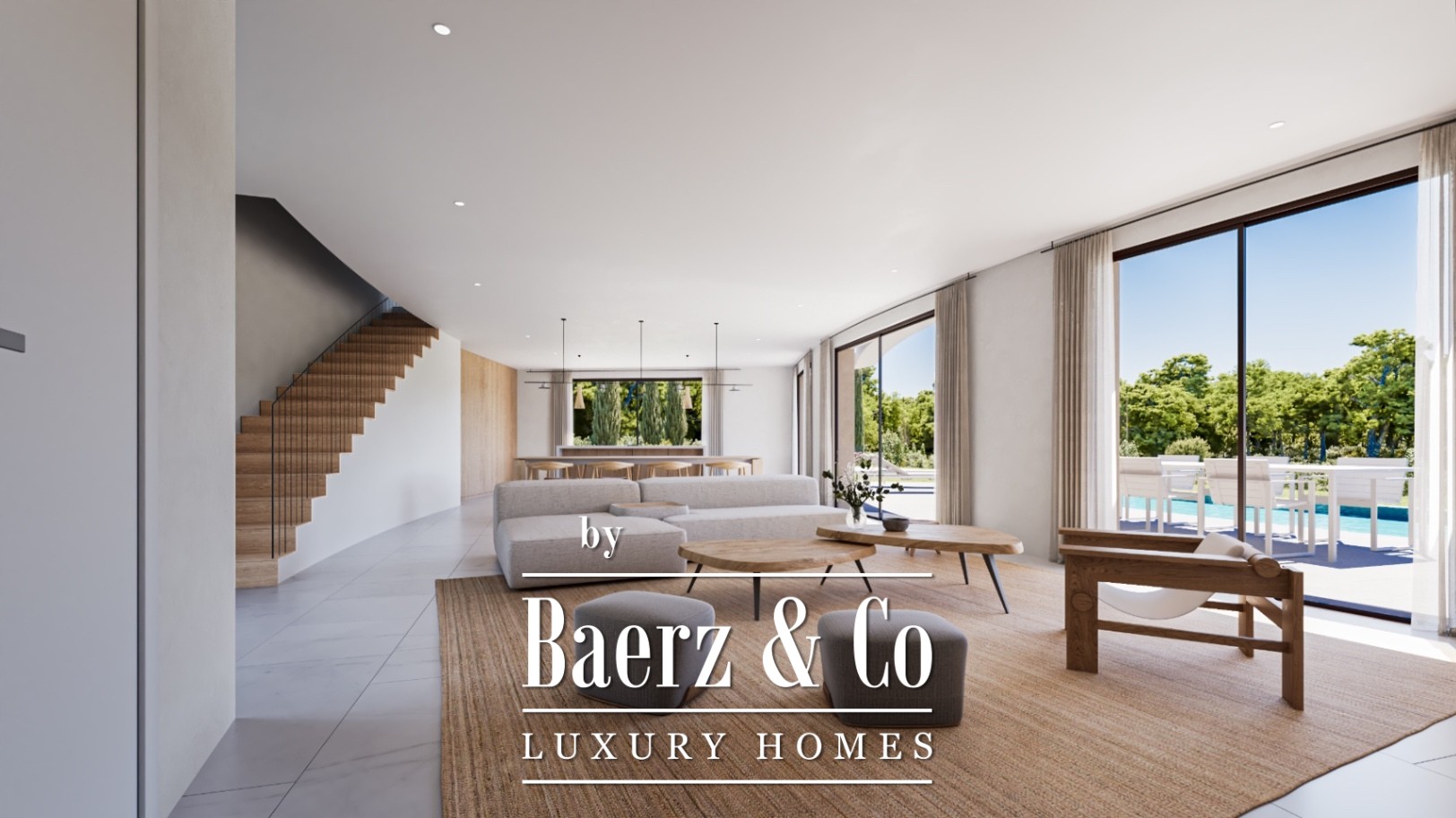 Terraces, both open and covered, flow into landscaped gardens and a tranquil pool, creating an atmosphere of repose. Interior finishes in a palette of white and warm beige convey quiet sophistication, while amenities such as centralised heating, air conditioning, parking, alarm, and internet anticipate every comfort.