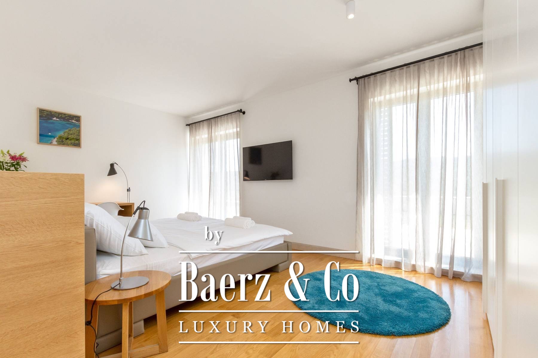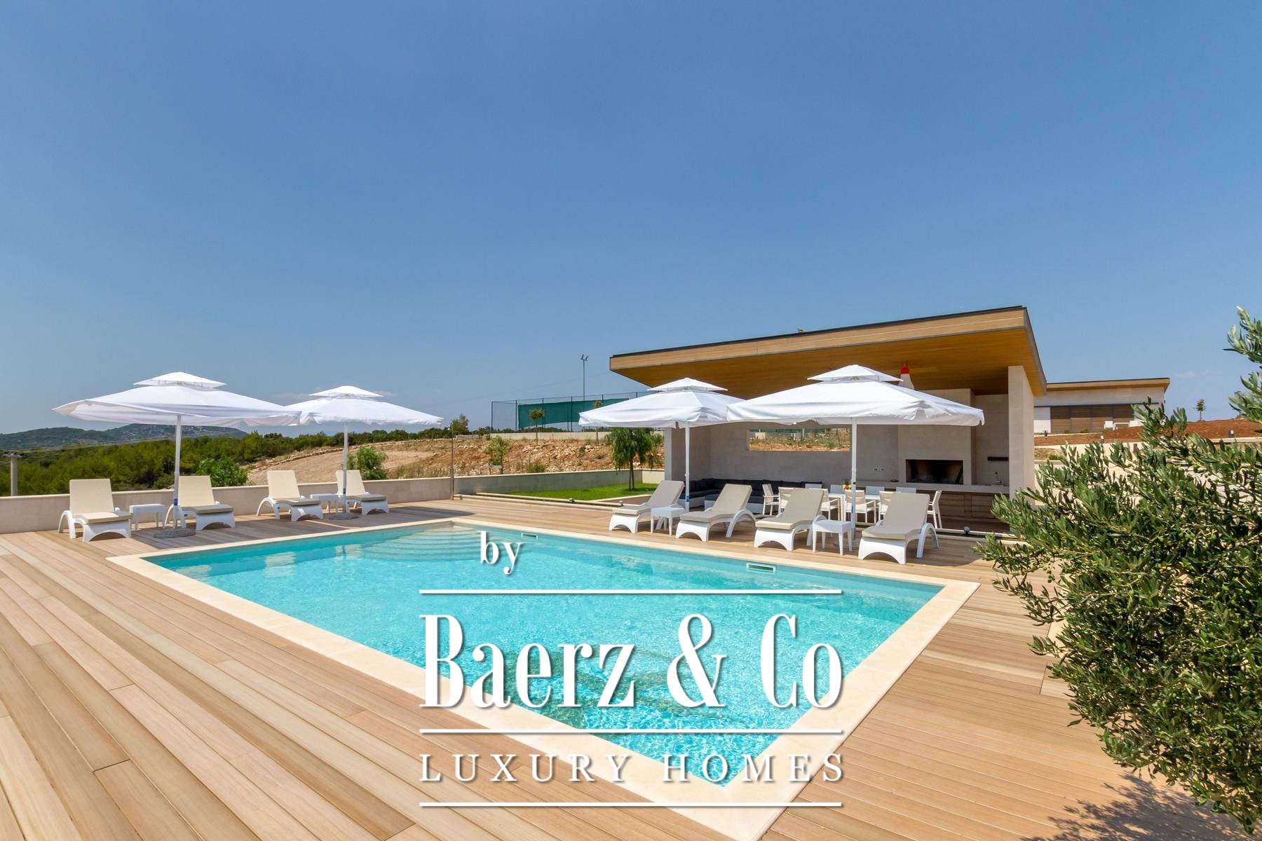 and three bedrooms, one of which has an attached bathroom. In the basement there is another room with a bathroom, a wine cellar, and a spa area (hot tub, massage table, gym and sauna).The outdoor space is refined with a barbecue, a lighted tennis court, a bowling alley and a detached garden house with a studio apartment. The facility is equipped with a high-end electronic locking system and a video surveillance system and an alarm for additional security.It is less than two kilometers from the beautiful Pokrivenik bay.