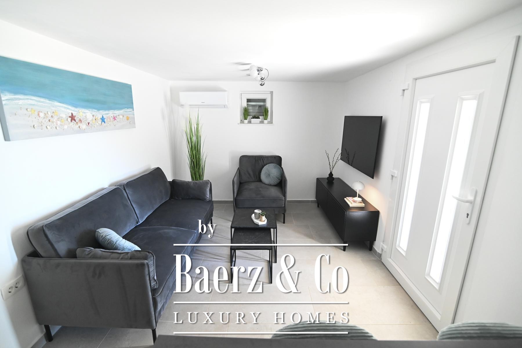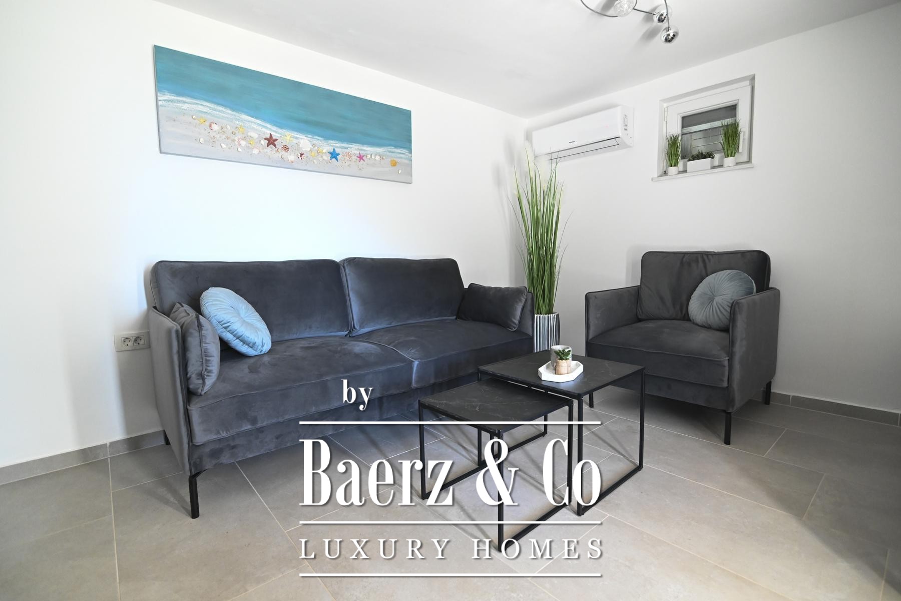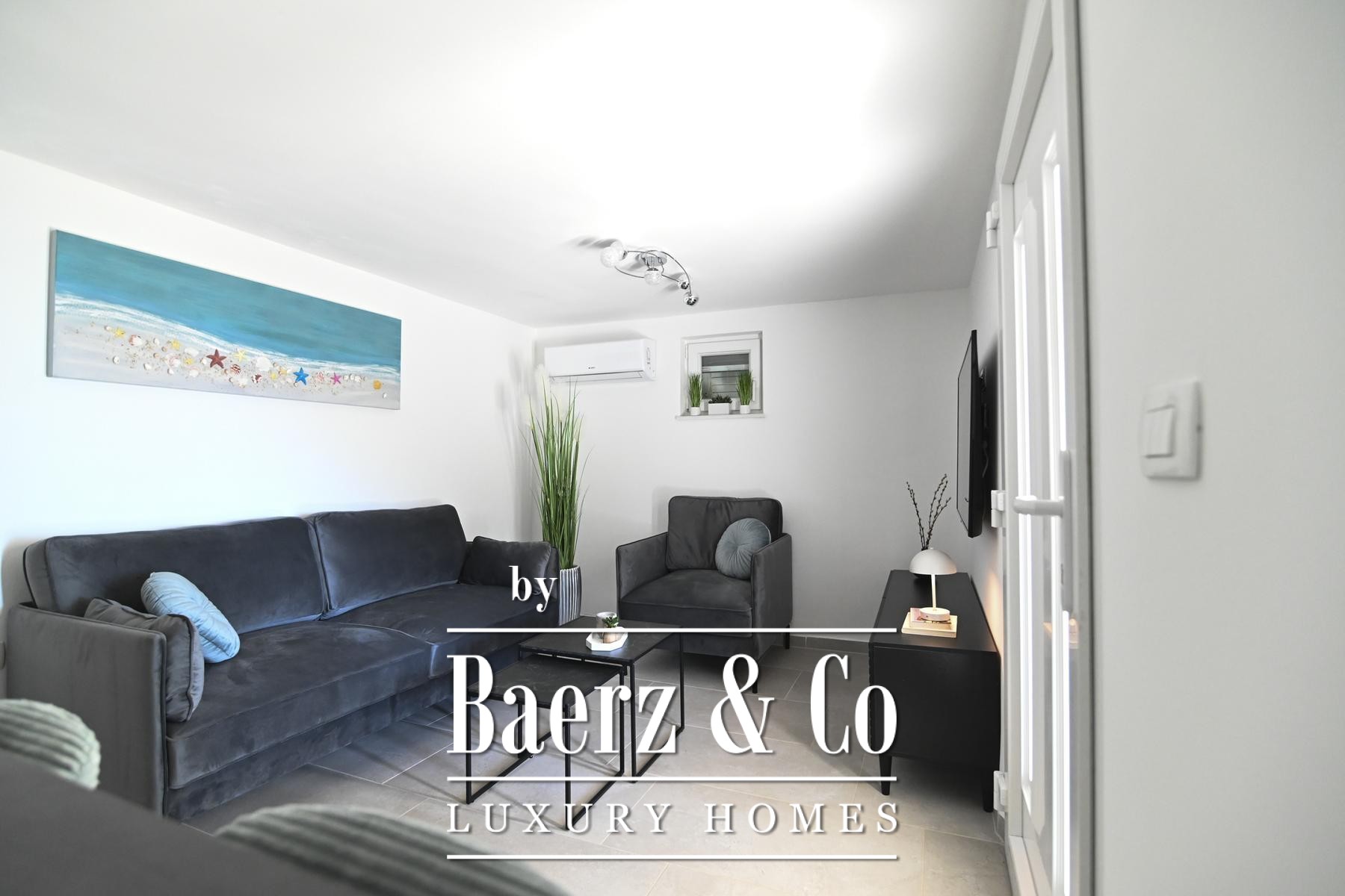 Outdoors, privacy is assured with secluded sunbathing zones and a saltwater pool, complemented by a wellness whirlpool on the upper terrace. A separate 40 m² apartment with its own entrance provides versatility for guests or extended family. Three private parking spaces and two built-in kitchens underscore practical luxury, while the villa’s proximity to the pebble beach creates an effortless transition from indoor calm to coastal rhythm.
