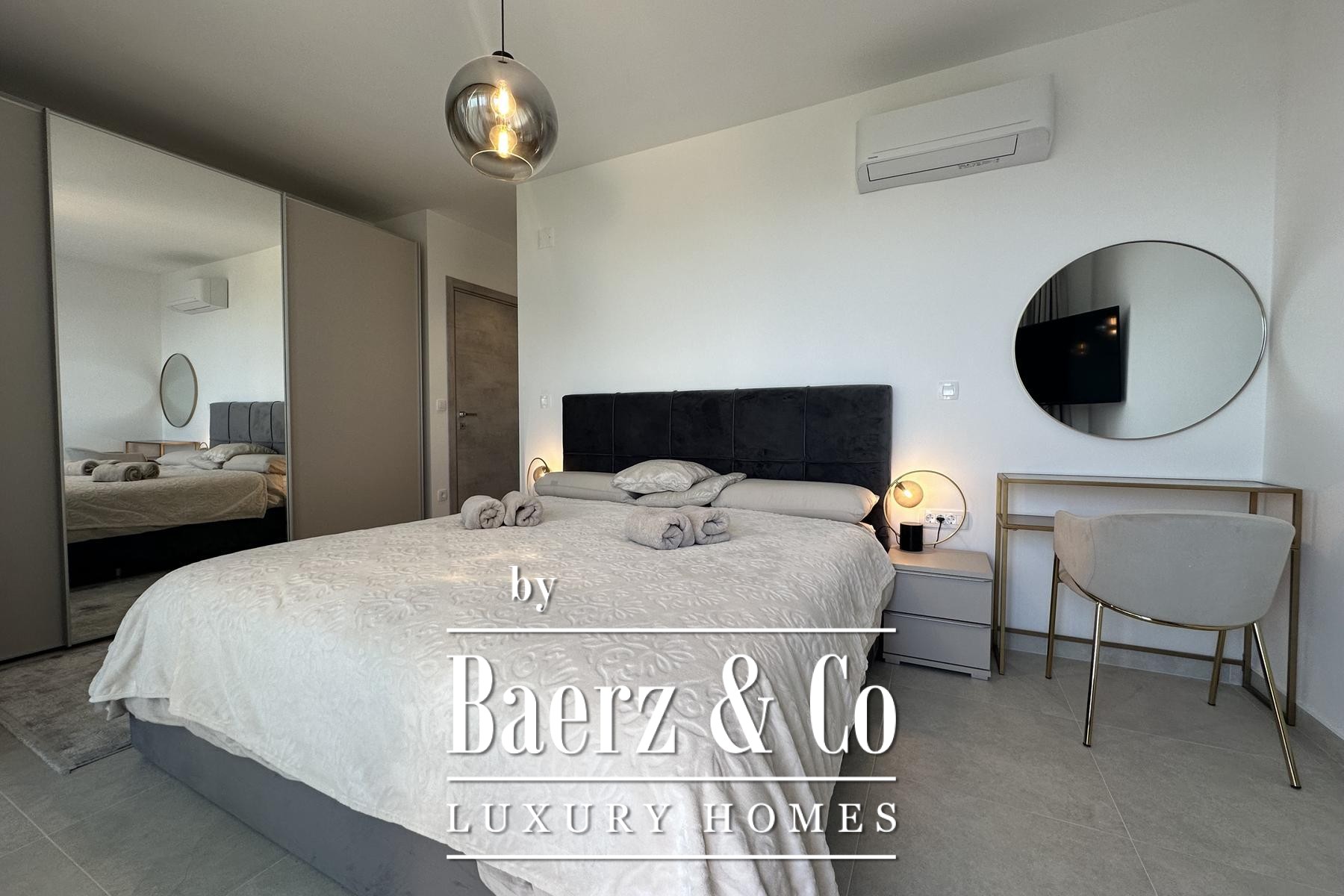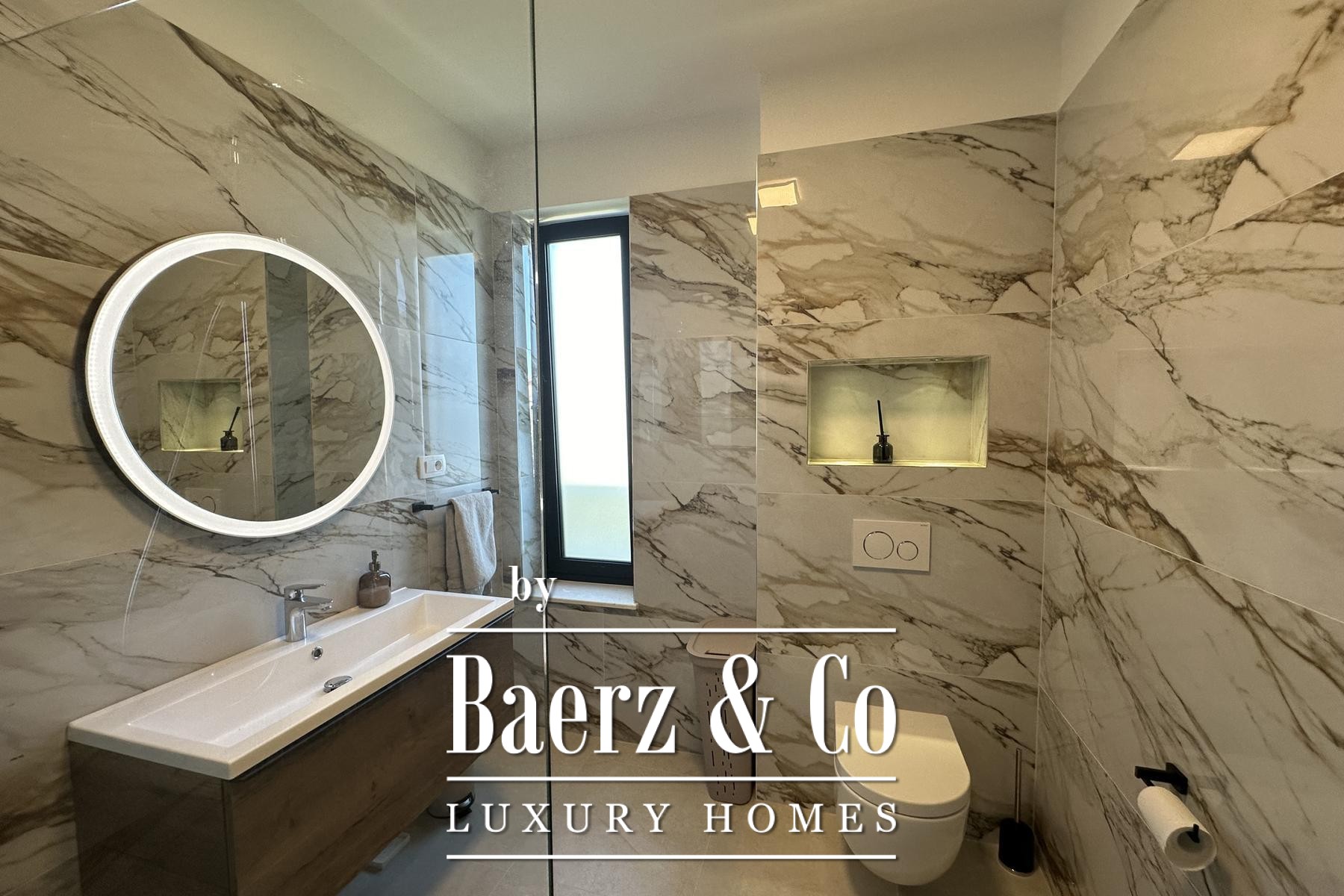 Ascending the internal staircase, two further bedrooms, each with private bathrooms, open onto balconies, connecting interior light with outdoor perspective. Designer furnishings and an A++ energy certificate reflect a rigorous attention to ecological standards. The landscaped grounds provide scope for an additional 50 m² building, expanding future possibilities.