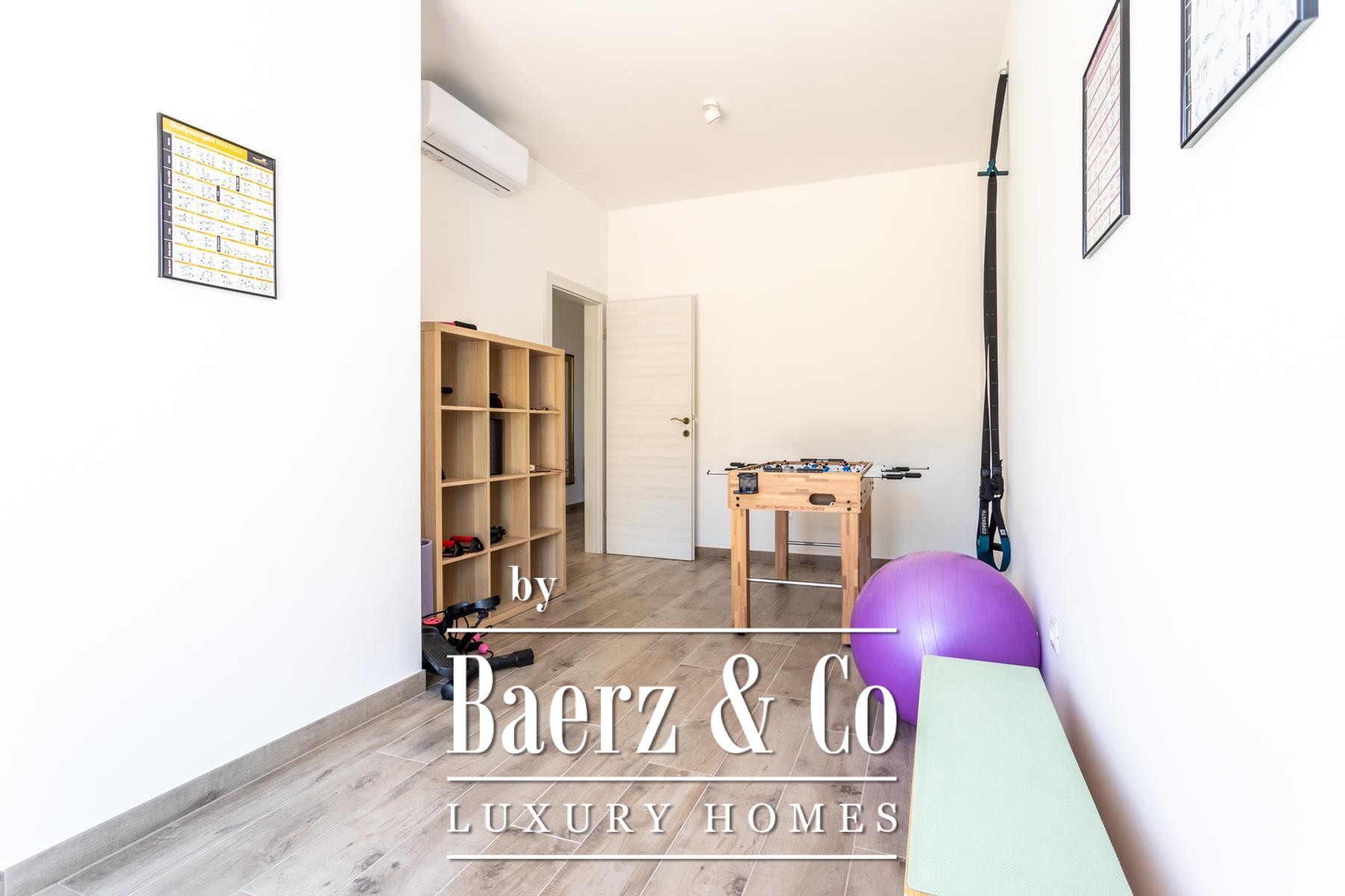 The ground floor welcomes you beneath a covered entrance, opening into a hallway with dressing room, and leads into the living room and an open-plan dining area. The kitchen and spacious terrace, seamlessly connected, embrace indoor-outdoor living, featuring a swimming pool measuring 9 by 4 metres and an adjacent sun deck. The layout provides a ground floor bedroom with en-suite, ample storage, and guest toilettes. The internal staircase rises to the first floor, where three additional bedrooms, each with a private bathroom, and a gym share access to a broad terrace with exterior stair.