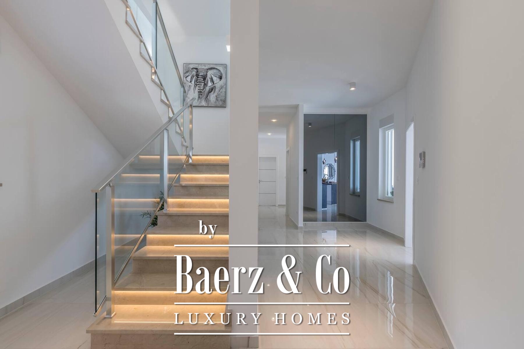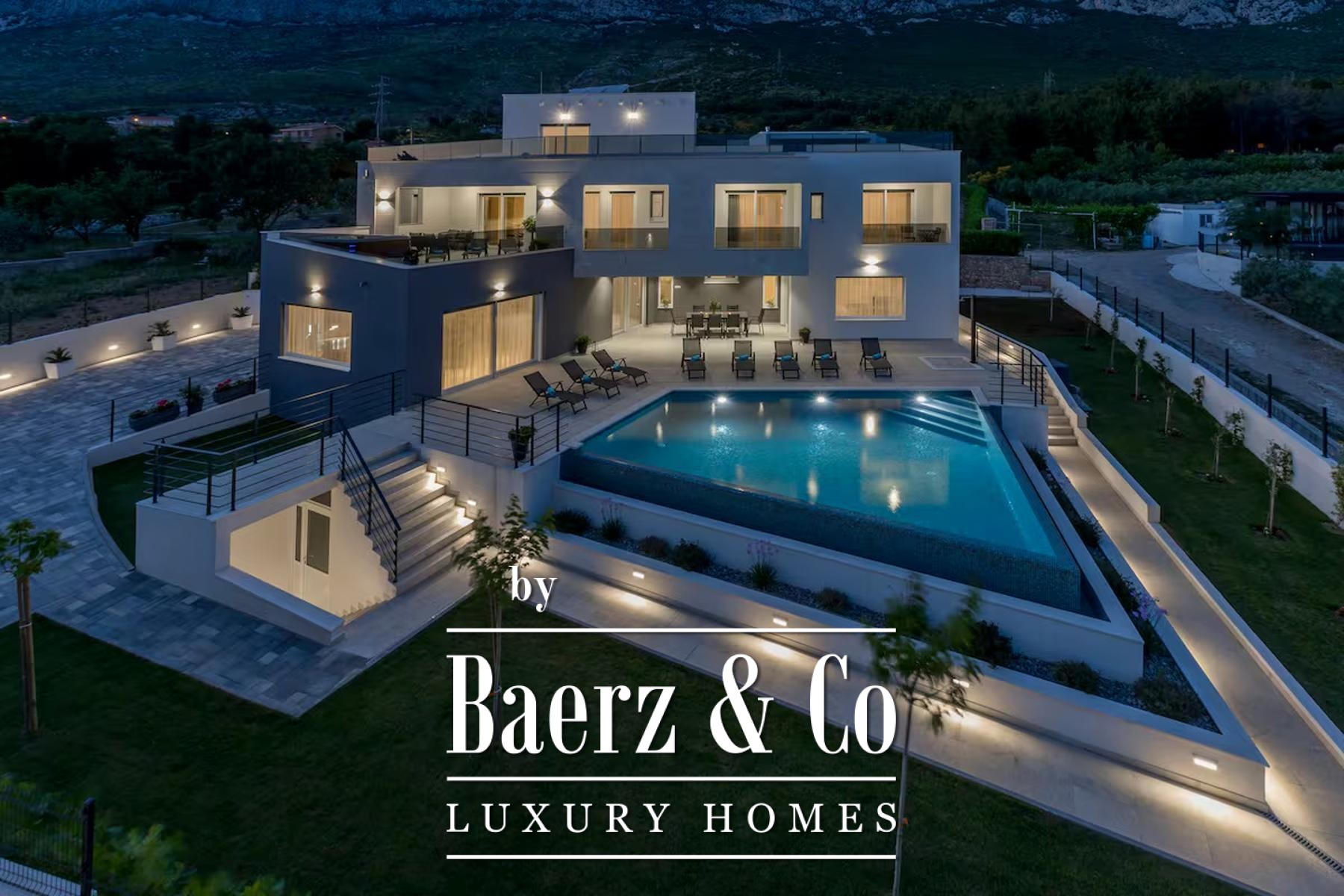 Villa Kaštela with sea views stands quietly elevated above the Adriatic, offering 350 m² of contemporary living space distributed gracefully over four floors. This property, set on a 1,700 m² plot, presents five bedrooms, each complete with private bathrooms, dressing rooms, and direct sea views, underscoring privacy and the ever-present connection to the coastline.