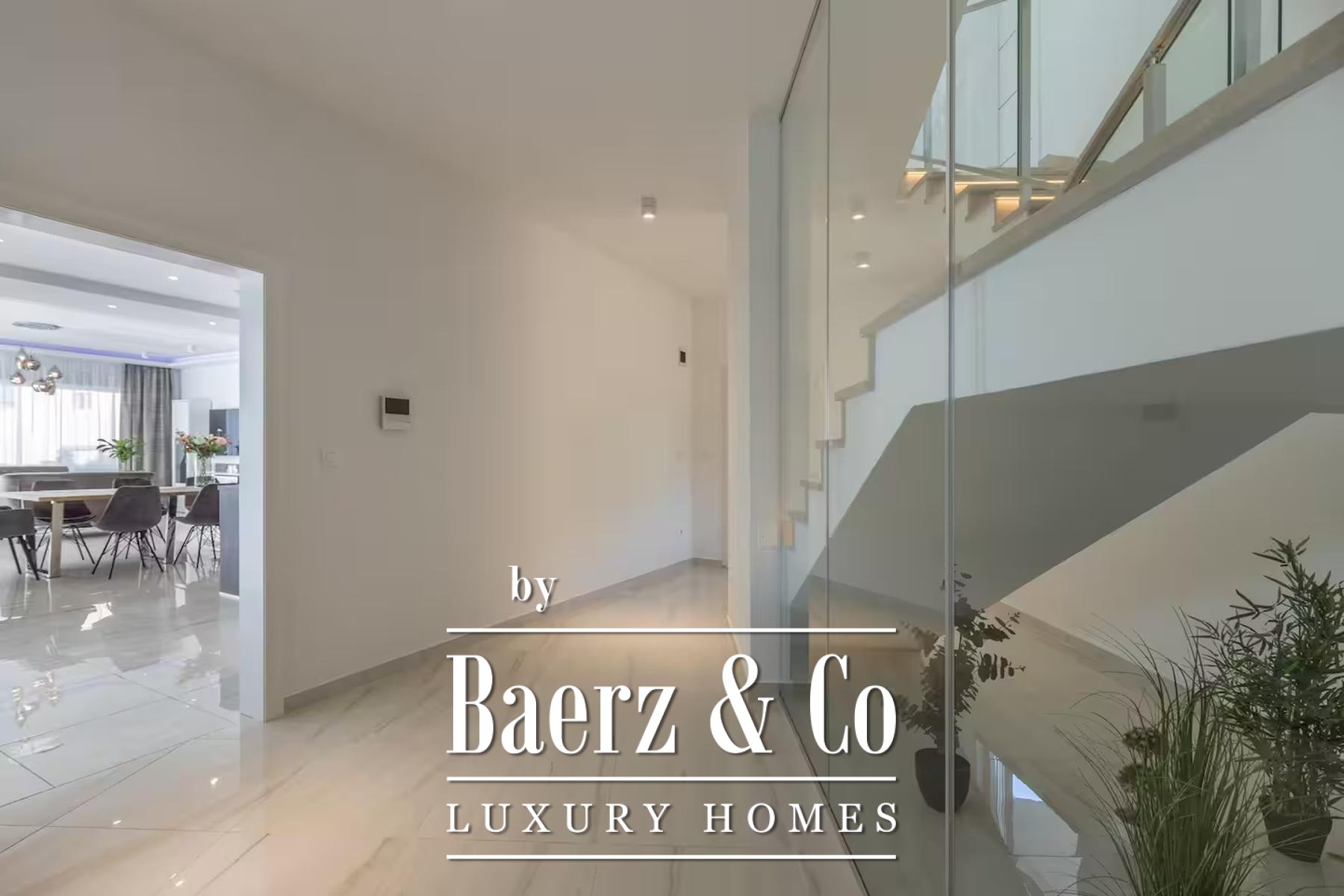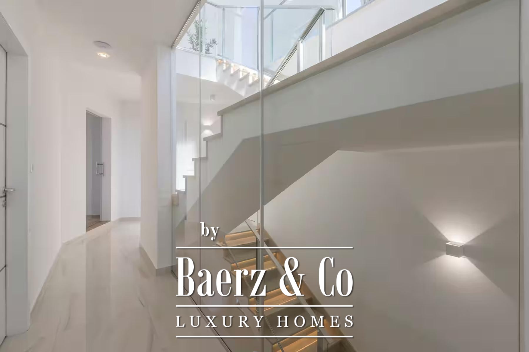 The ground floor reveals a modern kitchen and dining area, fluidly opening into a generous living room that extends onto the outdoor terrace. Natural light moves smoothly across wide interiors, while a central staircase links each level with balanced rhythm. The second floor offers a vast 120 m² terrace, granting open views and a tranquil place to unwind.
