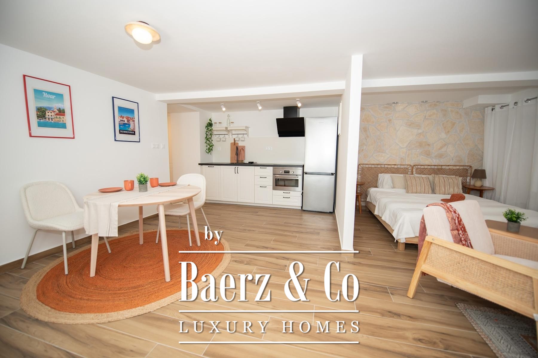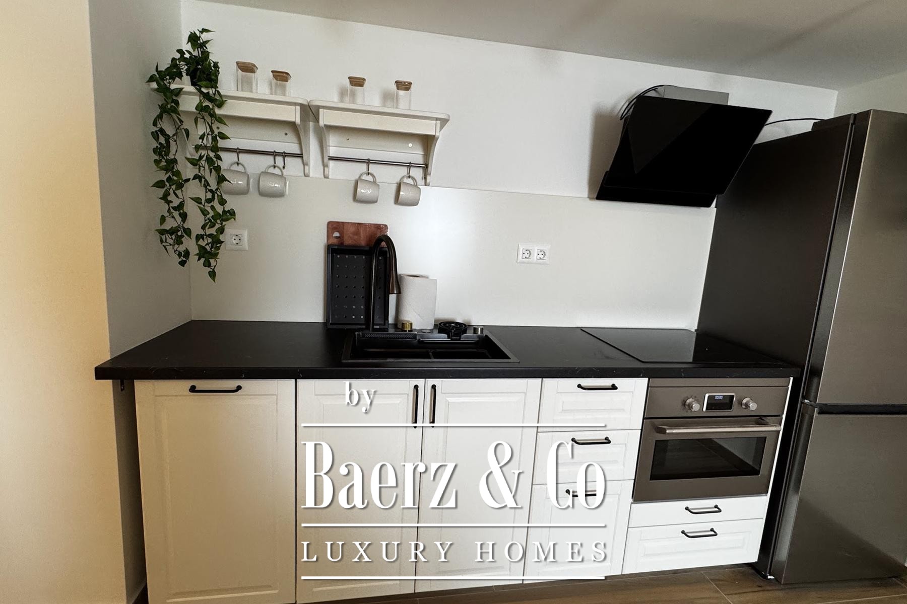 The second apartment consists of two bedrooms, bathroom, storage room and kitchen with dining room and living room. In front of the apartment there is a small garden and a space for socializing with a table and chairs.On the first floor