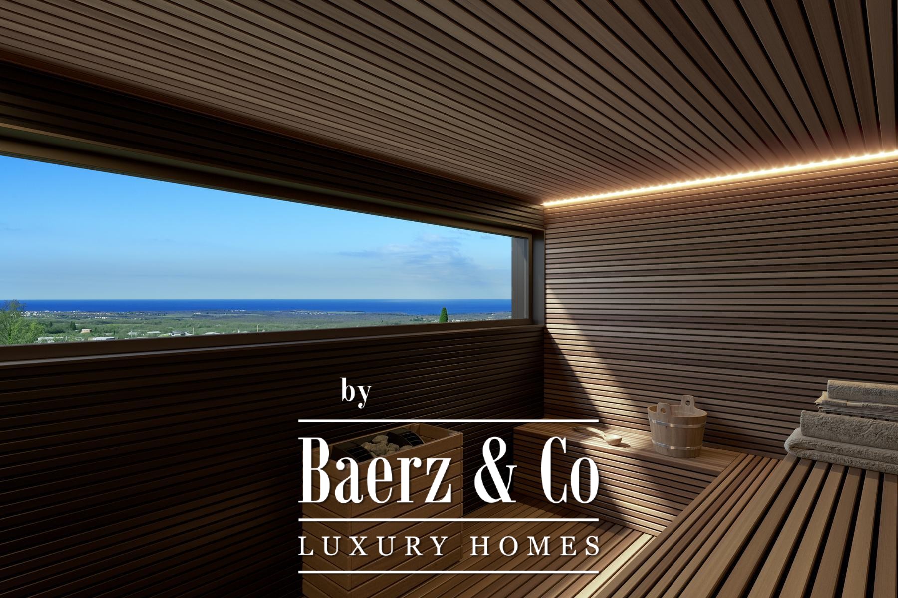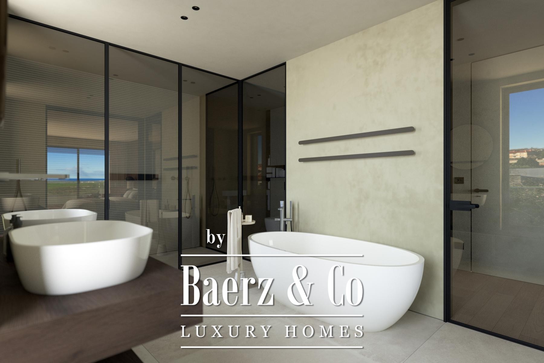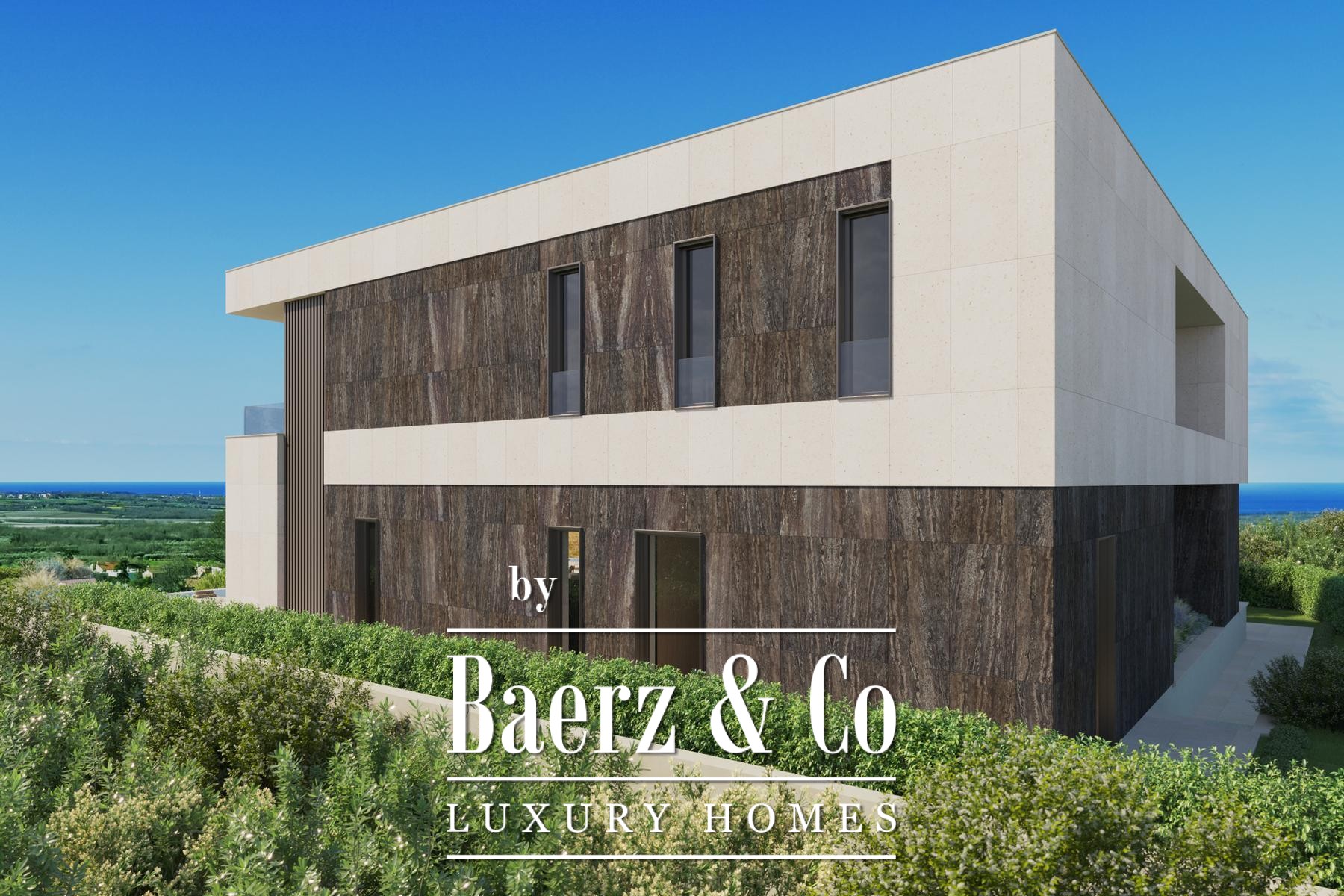 Upstairs, two master suites and two additional bedrooms all include private bathrooms and access to a covered terrace, each orienting toward the Adriatic. The basement is equally considered, with a spacious garage for three vehicles, storage, two technical rooms, laundry, a wellness suite with jacuzzi and sauna, as well as a wine cellar for convivial gatherings.