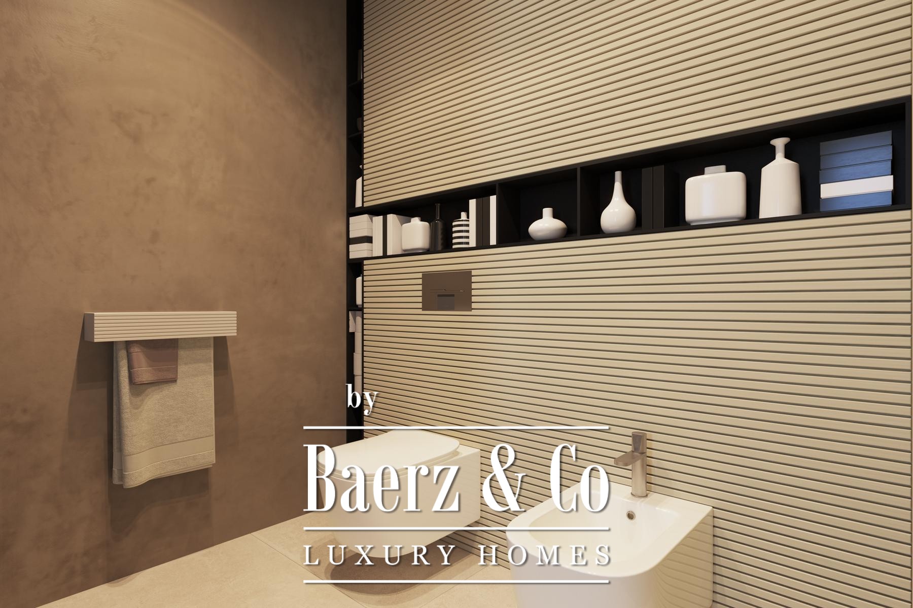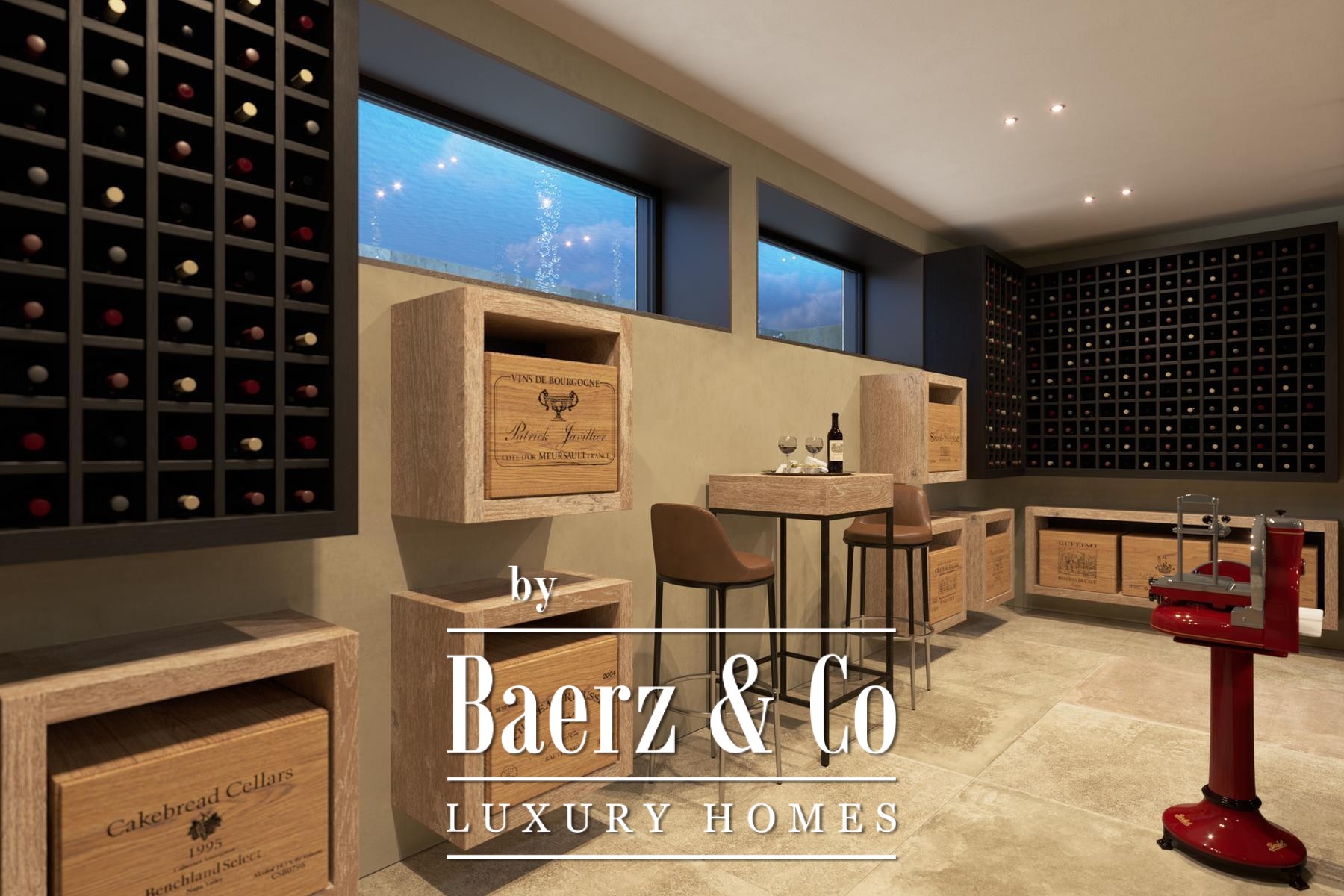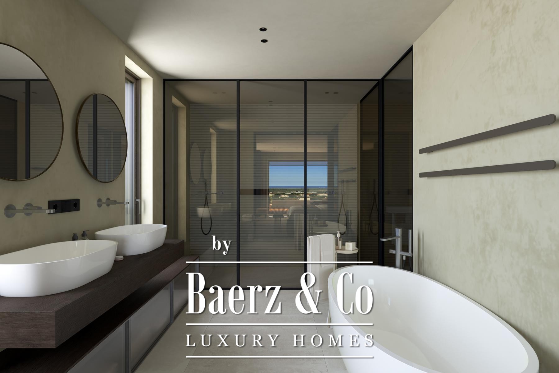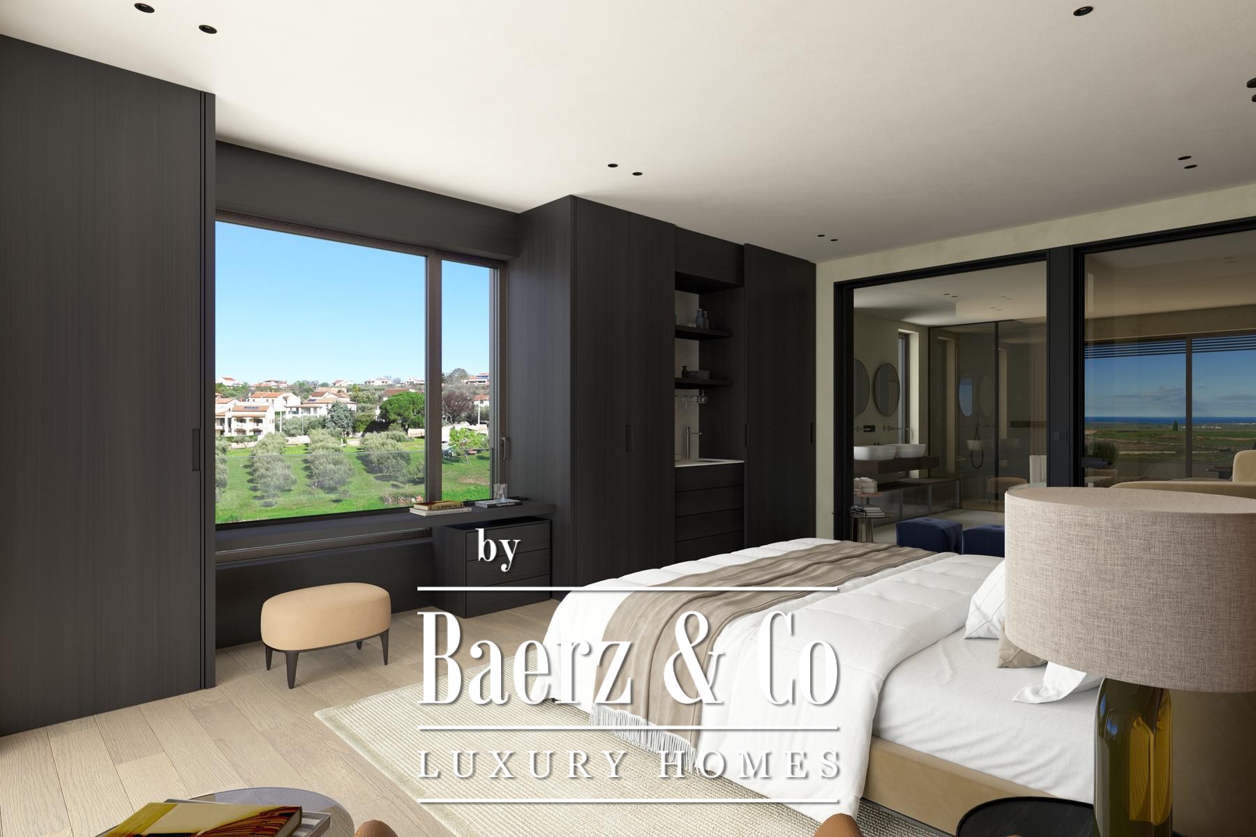 Upstairs, two master suites and two additional bedrooms all include private bathrooms and access to a covered terrace, each orienting toward the Adriatic. The basement is equally considered, with a spacious garage for three vehicles, storage, two technical rooms, laundry, a wellness suite with jacuzzi and sauna, as well as a wine cellar for convivial gatherings.