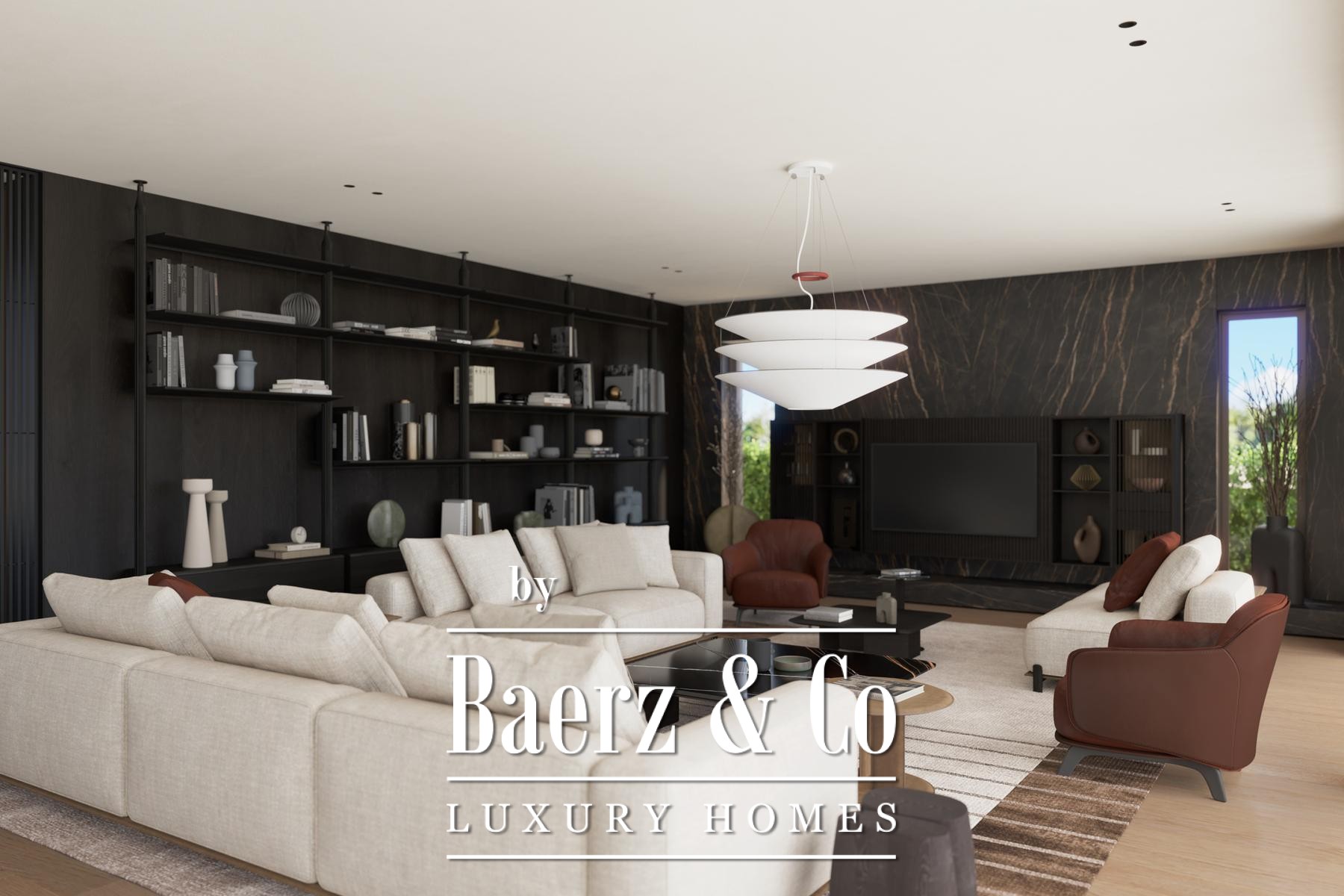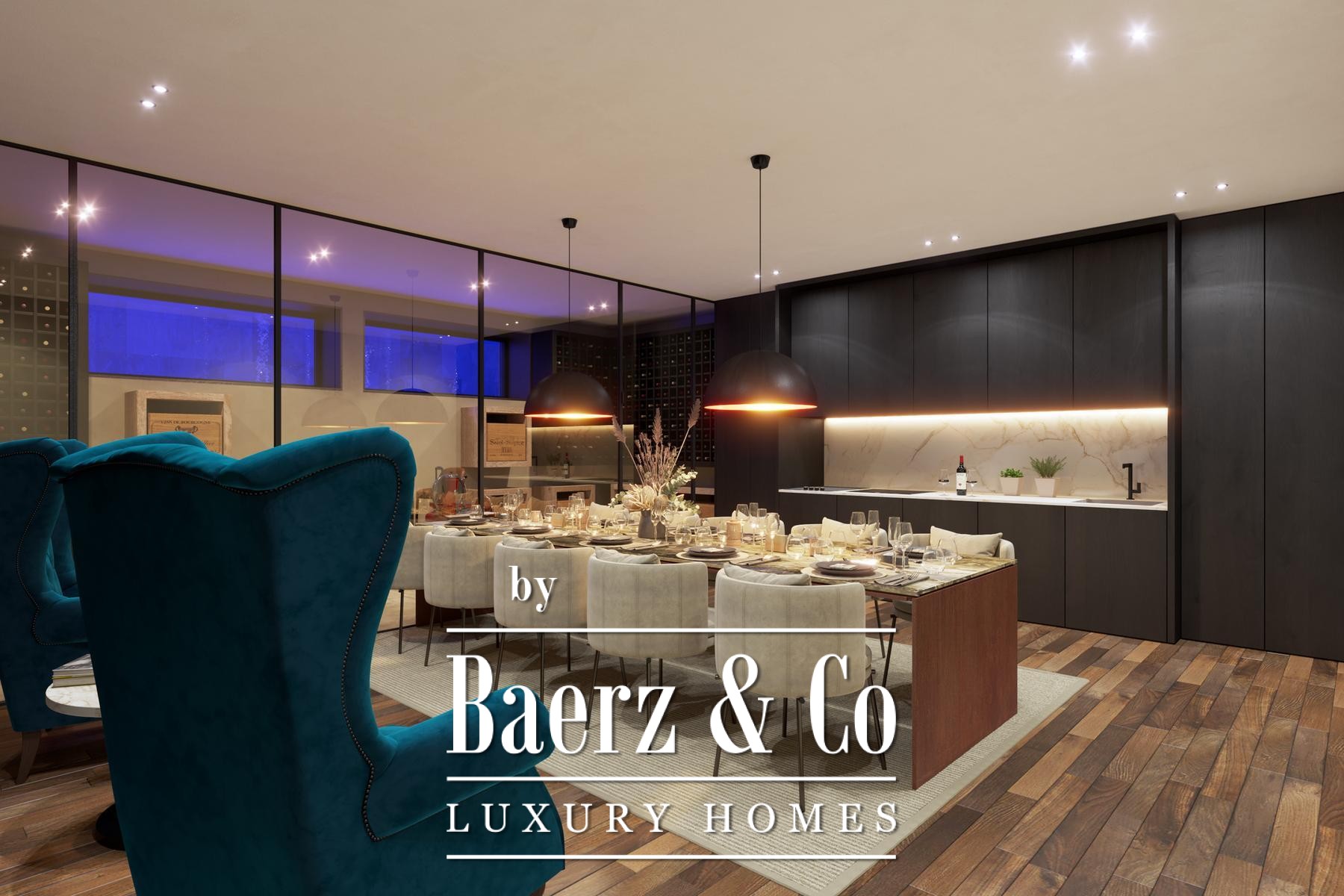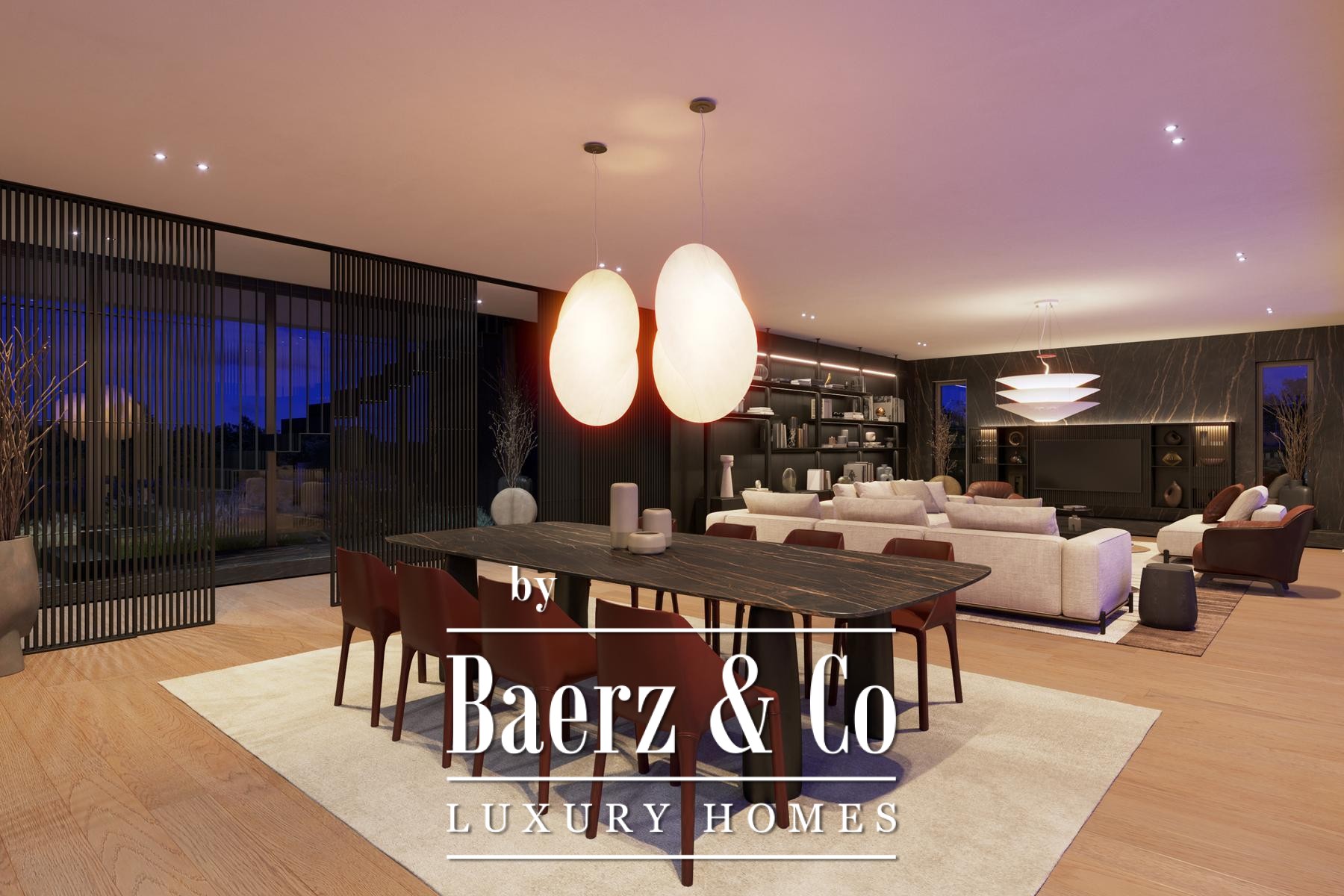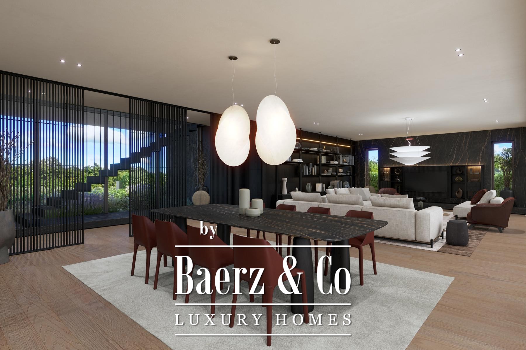 The ground floor introduces a fluid connection between the kitchen, dining, and living spaces. Expansive glass opens onto a covered terrace, sunbathing area, and a 67.04 m² infinity pool. Nearby, a sauna offers a quiet retreat, while the well-proportioned guest spaces remain perfectly suited for refined entertaining.
