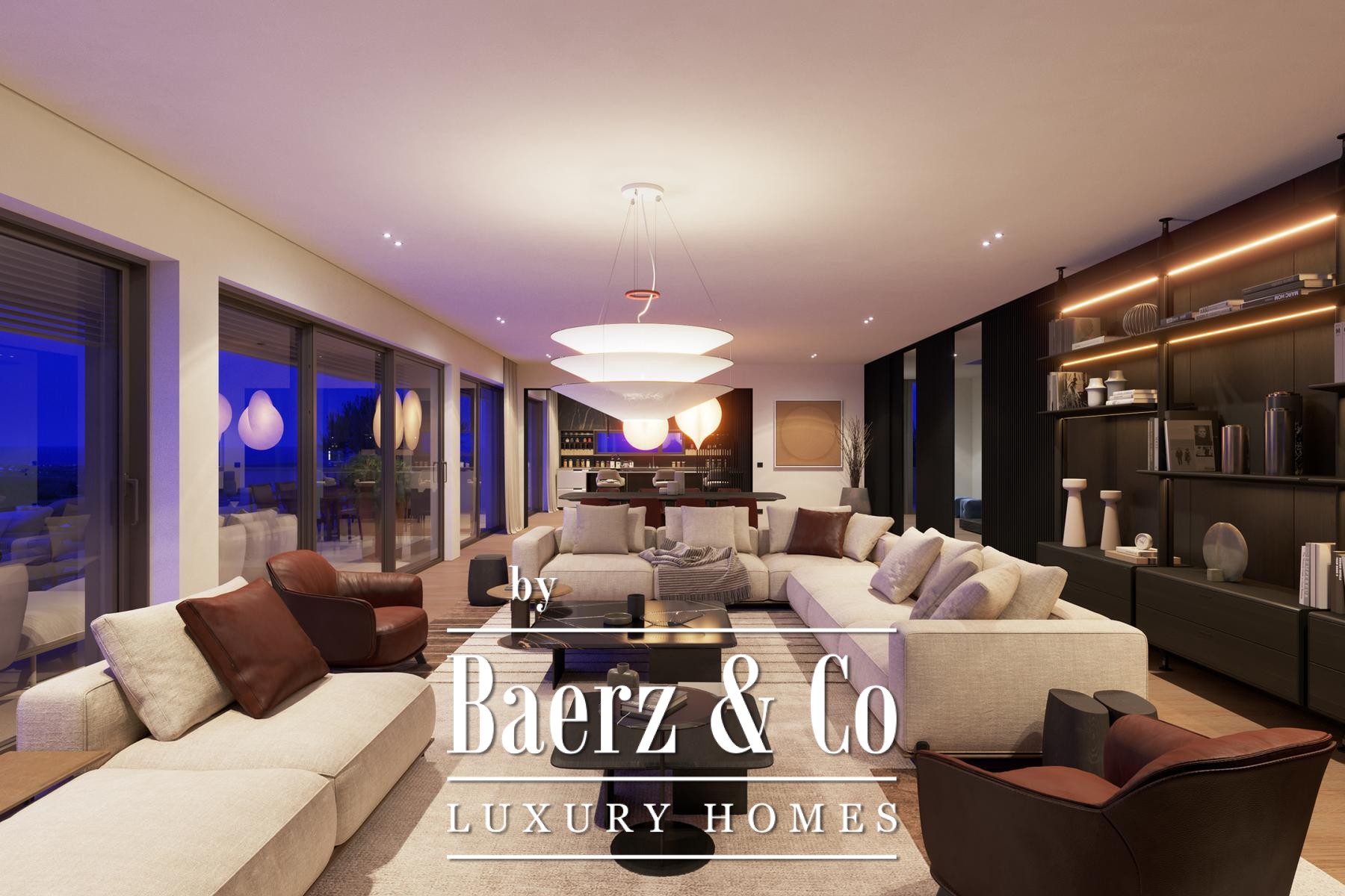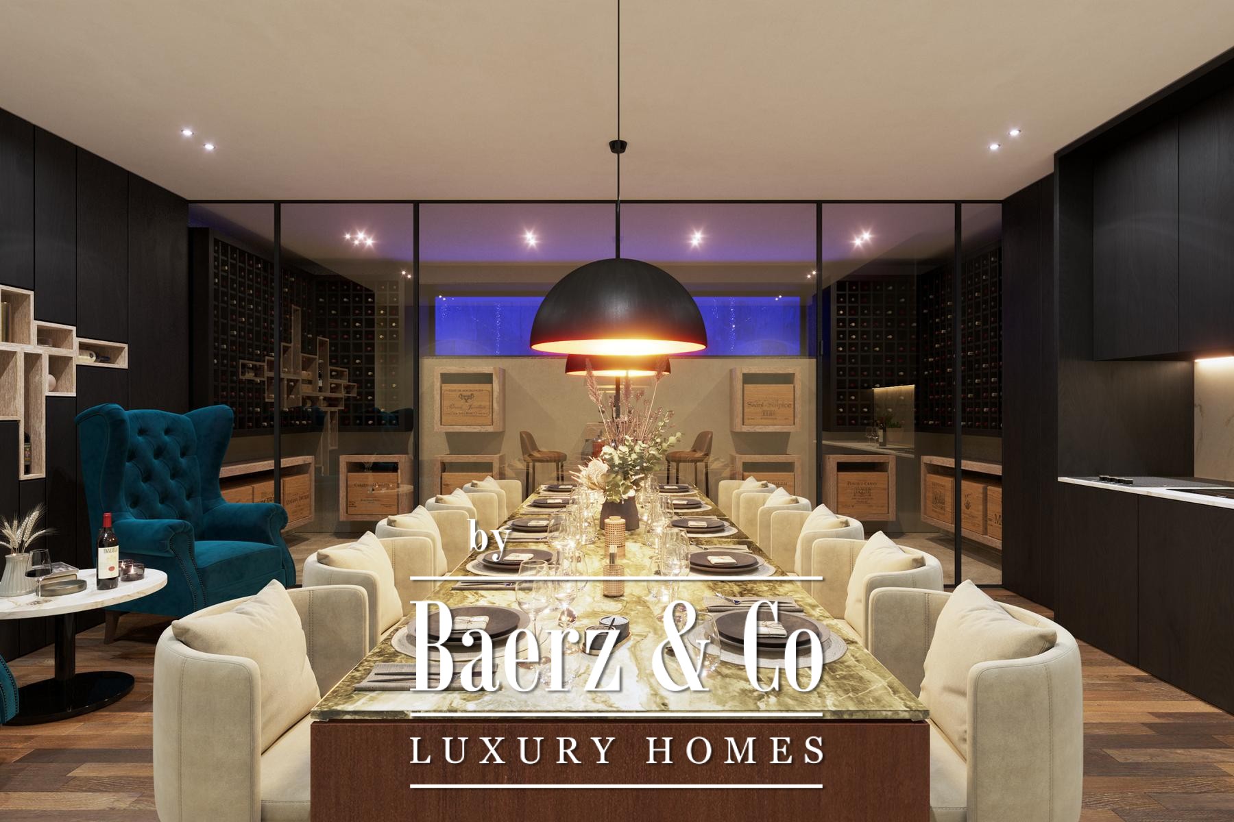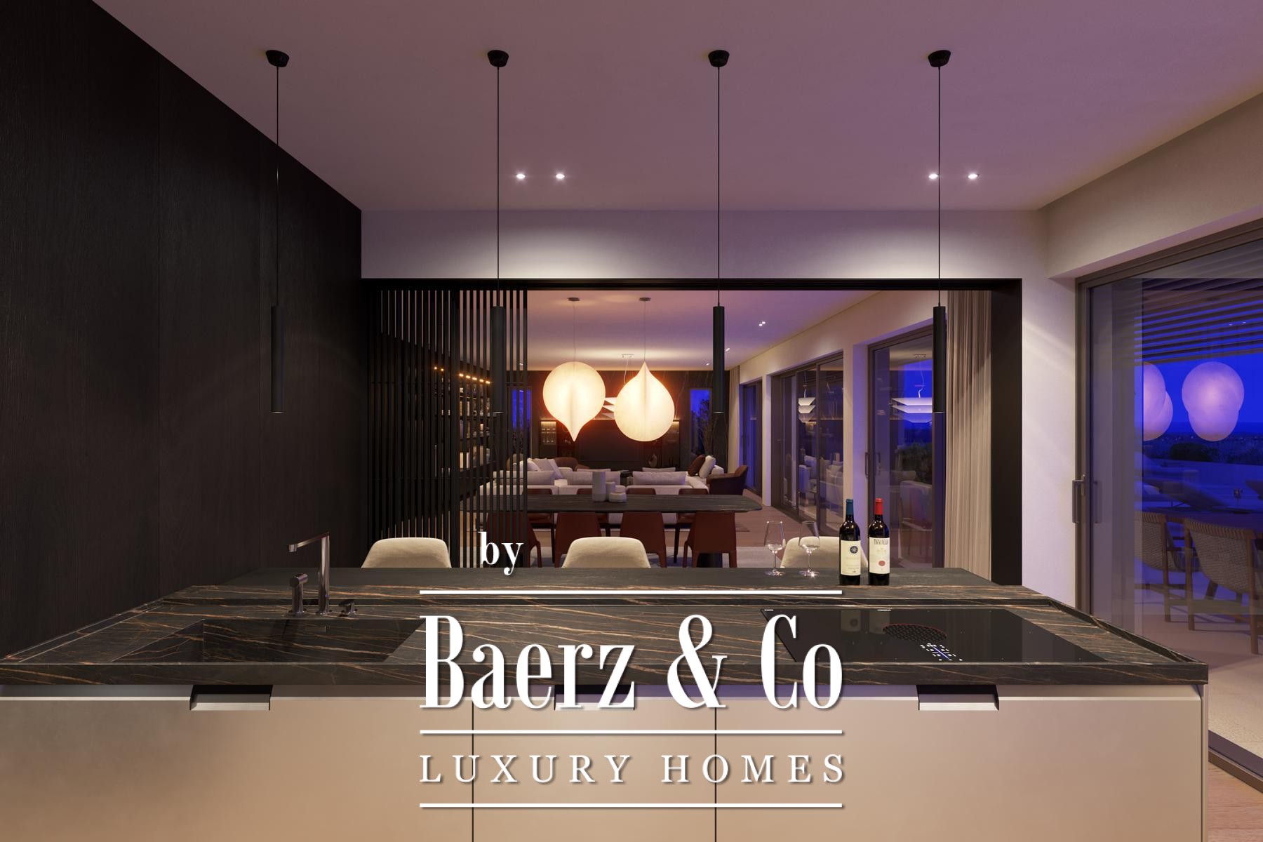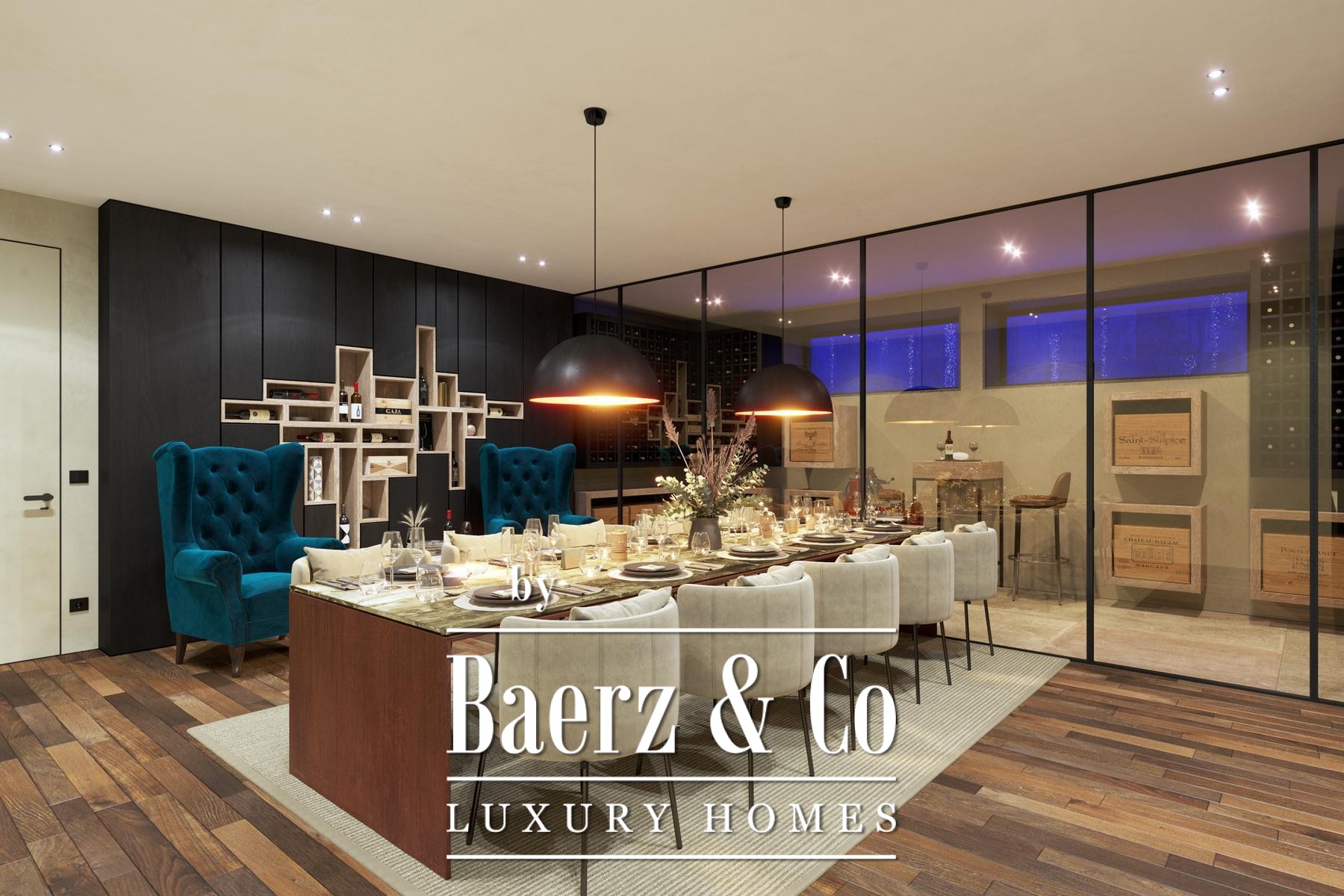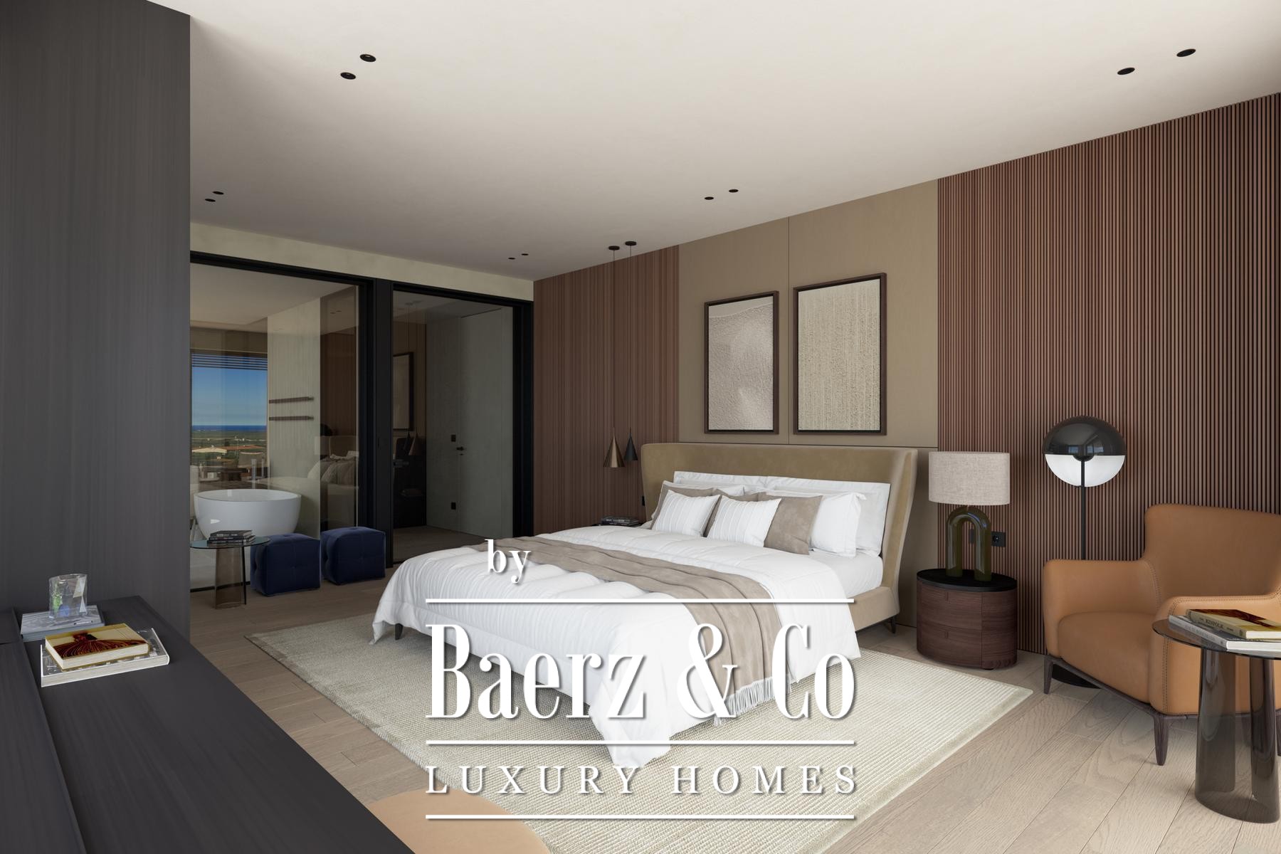 The ground floor introduces a fluid connection between the kitchen, dining, and living spaces. Expansive glass opens onto a covered terrace, sunbathing area, and a 67.04 m² infinity pool. Nearby, a sauna offers a quiet retreat, while the well-proportioned guest spaces remain perfectly suited for refined entertaining.
