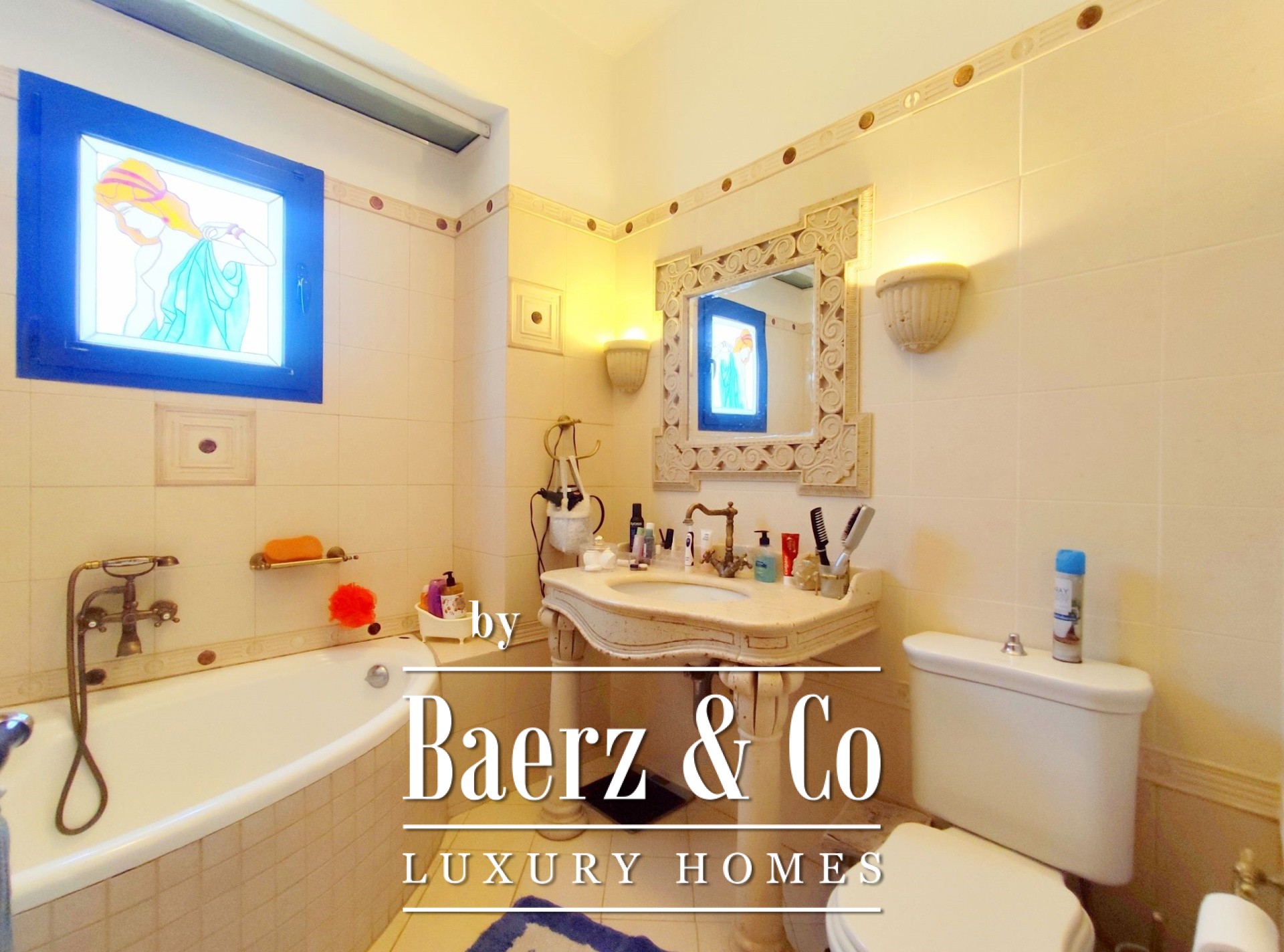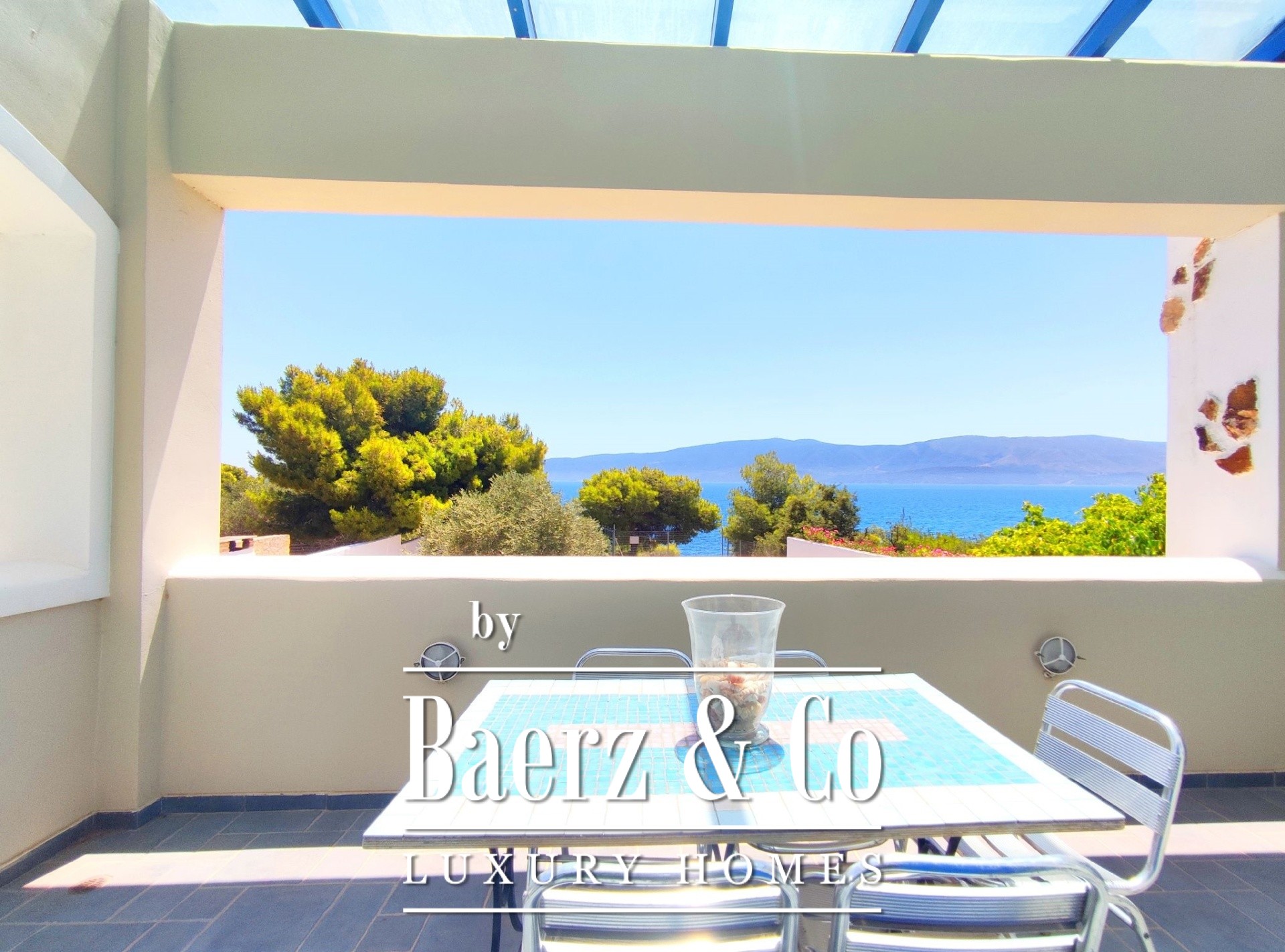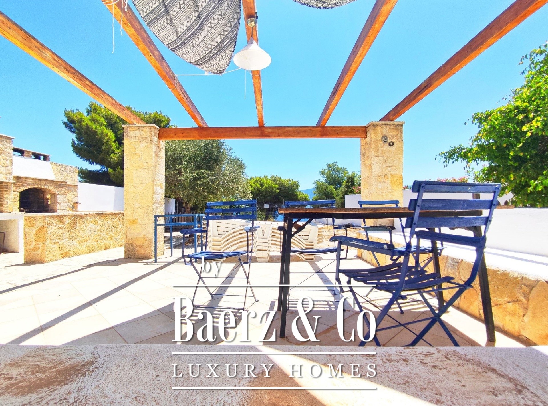 The outdoor space is equally impressive with a beautifully landscaped garden and automatic watering system. A path from the garden leads directly to the sea, offering direct access to the beach. The residence stands out for its panoramic sea views and excellent aesthetics, making it an ideal choice for those seeking a combination of luxury and natural beauty.