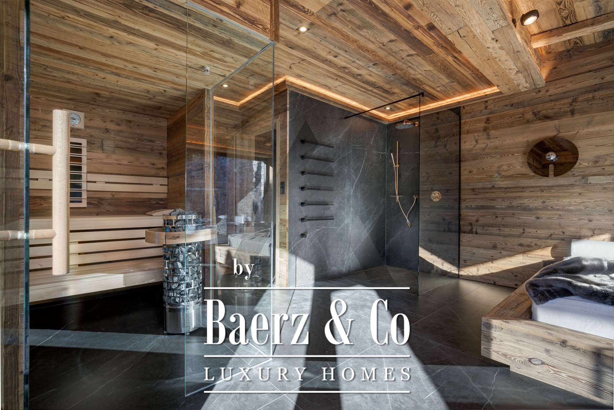 Elegant natural materials such as reclaimed wood, natural stone, high-end tiles and glass combine to create an appealing, contemporary and luxurious chalet ambiance.